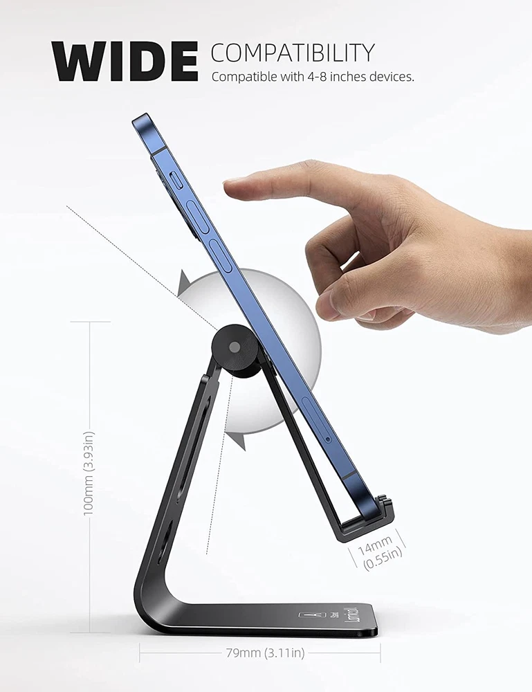 Universal Compatibility: Lamicall cell phone stand can work with all smartphones from 4-8 inches, like AppleiPhone 16, iPhone 16 Pro, iPhone 16 Pro Max, iPhone 16 Plus, iPhone 15, iPhone 15 Pro, iPhone 15 Pro Max, iPhone 15 Plus, iPhone 14, iPhone 14 Plus, iPhone 14 pro, iPhone 14 pro max, iPhone 13 Mini, iPhone 13, iPhone 13 Pro, iPhone 13 Pro Max, 12,11 SE 2020, XS, XS Max, XR, X, 8 7 6 Plus, Galaxy S21 Ultra, S20, S10, S9, S9 Plus, A71, A51, A11, Edge, Note 20 ultra, even with a case on. Desktop Partner: Great desk accessories for office and home. A smartphone stand with perfect viewing angle for making phone calls, watching movies, viewing recipes and using facetime. Sleek and Elegant: Made of high-quality aluminum alloy, this desk phone holder has a smooth edge, a nice finish and beautiful metallic luster. It looks sleek and elegant on your desktop. Stable and Protective: This phone dock with a low gravity center can hold your phone stably. Besides, its rubber cushions protect the phone from scratches and sliding. Warm Tips: The hook width of the mobile phone stand is 14mm, please make sure the thickness of your device is no more than 14mm (0.55 in). For a cell phone larger than 6 inches, kindly set it in landscape mode for more stability. Product Description The video showcases the product in use. The video guides you through product setup. The video compares multiple products. The video shows the product being unpacked. Lamicall Phone Stand Series Comparison Height Adjustable NO Height Adjustable Yes Height Adjustable NO Heavy Duty Base NO Heavy Duty Base Yes Heavy Duty Base NO Angle Adjustable Yes Angle Adjustable Yes Angle Adjustable Yes Foldable NO Foldable NO Foldable Yes