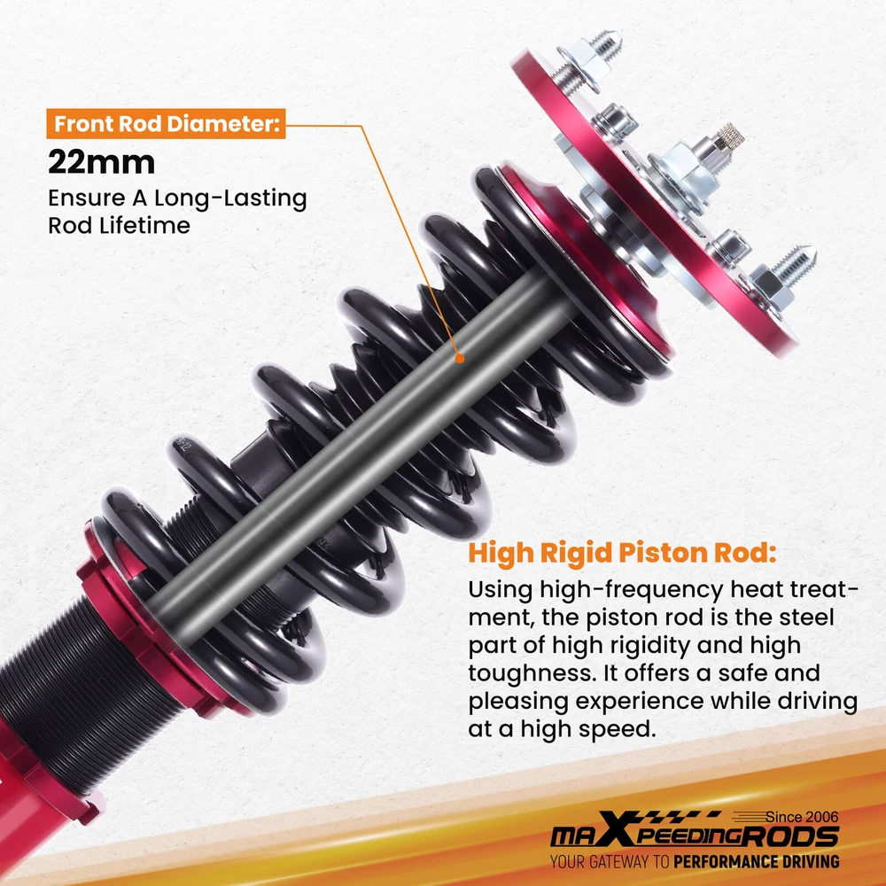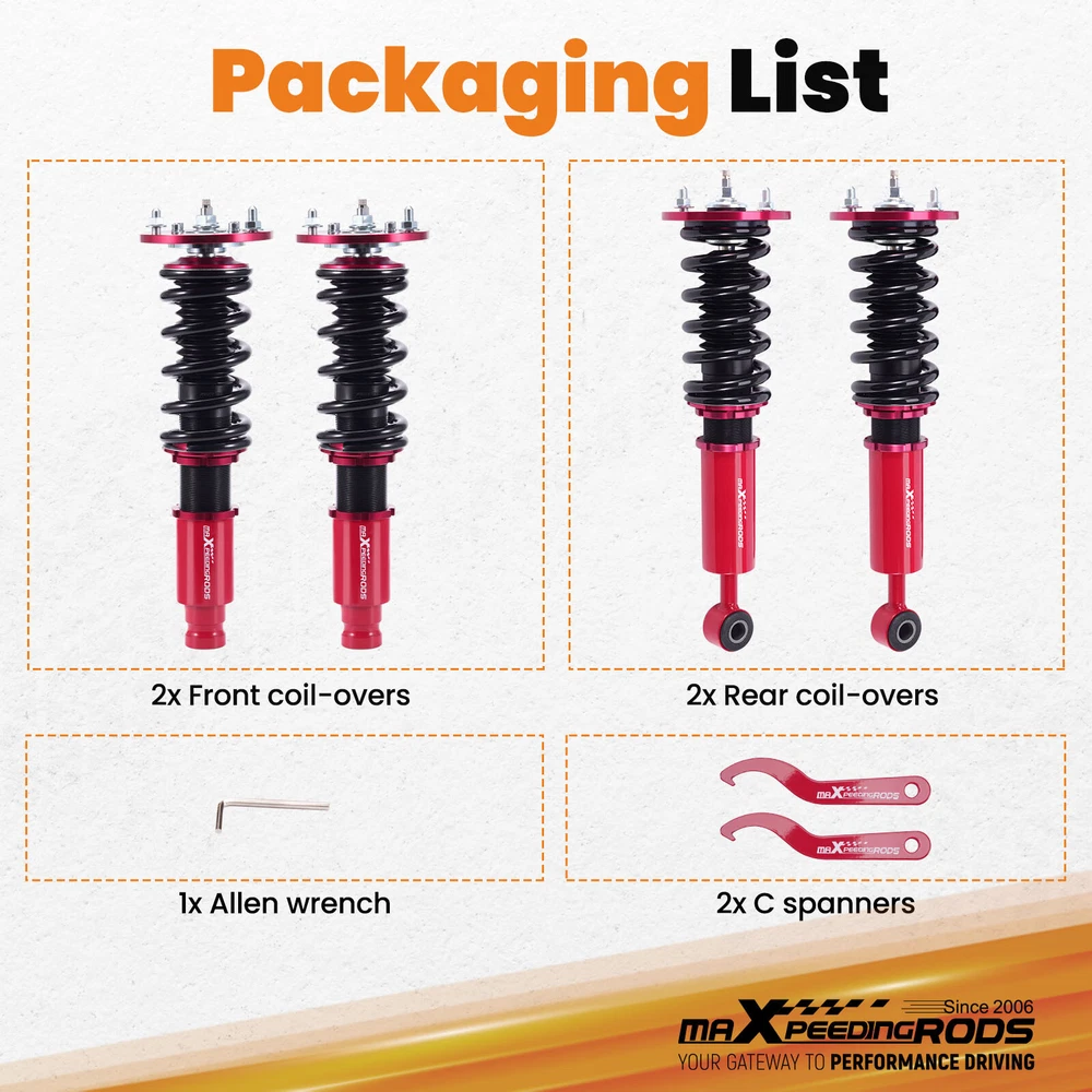 zjpss LOGO Home Contact us Promotion WHY CHOSE US Manufacturer We know our products Easy Return Quick, Simple Guaranteed Fitment Always the correct part PRODUCT DISPLAY Adjustable Damper Coilovers Kit For Mitsubishi Eclipse 95-99 Shocks Absorbers Fast Shipping International Shipping 30 Days Return Policy Secure Shopping DESCRIPTION MaXpeedingrods' street coilovers are designed and developed for all motoring enthusiasts that want excellent handling without sacrificing comfort. This suspension system is ideal for daily driving and occasional, light track use. High quality components are adopted to ensure product durability and stability. Each application is fully test fitted and completely road tested to guarantee all our customers perfect performance and comfort expectations. Features - Independent ride height adjustable: Easily adjust the height of your ride! This coilover also allows for height and preload adjustments. This means you can reach optimal suspension tuning while maintaining a stable, comfortable ride at all times. - 24 Levels Damping Force Adjustable : Provides an extensive range of adjustability, making it easy to customize for various purposes and achieve desired ride comfort. - High Durability Bearing and Thrust Seat : Utilizes top-quality components for durability and noise reduction, ensuring long-lasting performance and silent operation. - Reinforced Rubber Bushing Upper Mount : Specifically designed for each vehicle, enhances silence and comfort. Adjustable camber angle for certain strut mechanism suspension cars. Full Length Adjustable Type: Allows ride height adjustment without affecting suspension stroke, maintaining comfort while customizing height. - 55CrSi Steel Cold-bent Spring : Features extreme lightweight and high durability with world-class tensile strength, reducing metal fatigue and enhancing performance. - Balanced Comfort & Performance : Strikes a harmonious blend between sporty handling dynamics and daily drivability. Fitment For MITSUBISHI ECLIPSE 1995-1999 D38A CONVERTIBLE, 4CYL/TURBO For MITSUBISHI ECLIPSE 1995-1999 D33A 4CYL/TURBO For MITSUBISHI ECLIPSE 1995-1999 D32A 4CYL/TURBO For MITSUBISHI ECLIPSE 1995-1999 D31A 4CYL/NON TURBO Specification - Top mount: front camber plate; rear rubber - Damping: 24 levels rebound damping adjustable - Front Spring Rate: 12kg/mm (672 lbs/in) - Rear Spring Rate: 9kg/mm (504lbs/in) - Spring length Front: 190mm - Spring length Rear: 190mm - Coilover overall length Front: 445mm-495mm - Coilover overall length Rear: 485mm-575mm - Adjustable height: Yes lowering 1" to 3" - Spring Preload: 7-10 mm - Shock type:Twin tube - Color: Red Package included 1 x Set of Coilover Spring Kit (2 Front + 2 Rear) 1 x Pair of wrenches for height adjustment ★ 30-day Money Back & 12-Month Replacement Guarantee. Please feel free to contact us if there is any question. Full Length Adjustable, Independent Ride Height And Spring Tension Settings; Twin-Tube Shock With 24 Clicks of Rebound Damping Force Adjustment; High Rigidity 55CrSi Steel Cold-bent Springs; Anodized Shock Body With Anti-Corrosion Coating; Top Camber Plate with Pillow Ball Mount Provides More Precise Feel From Suspension And Steering;Full 1 Year Limited Warranty From Date Of Purchase. SHIPPING US Domestic Shipping Notice - All items will be dispatched within 24hrs(Mon-Fri) Our carrier collects all the parcels at 4:30am PDT, any payment paid after 5:00am PDT will be shipped the next day at 4:30am PDT. If you paid Item Shipped On Est.Delivery Time Before Apr. 1st at 4:30am Apr. 1st at 5:00am Apr. 5th - Apr. 7th After Apr. 1st at 4:30am Apr. 2nd at 5:00am Apr. 6th - Apr. 8th If our estimated delivery time and eBay’s are contradictory,please refer to the standard delivery time of ours. Estimated Delivery Time From To Service Est.Delivery Time US US UPS or Fedex Ground 3-5 Business days Outside of US DHL FedEx 4-7 Business days Tracking number will be updated in 24 hours after shipment Please provide the following shipping information for your order Full physical address Telephone number Otherwise your shipment will be deferred. We are not responsible for any shipping lost caused by wrong shipping information Shipping rate If our ebay item listing doesn't show the shipping cost to your place. Please contact us to calculate the shipping fee for you. International Shipment For international shipment, we do not cover any import taxes or duties. Import tax is charged by the government, not us. Our item price and shipping cost do not include any import tax which will be charged by the shipping company when you got the parcel. Please be noted that is not the extra shipping fee. ` NO hidden charge!!! WARRANTY Free 2 Year Warranty: All AutoModPlanet products have 2 year warranty (unless otherwise stated). In the very unlikely event that you have a problem with our product, please contact us via eBay messages. Easy Return: If you are unhappy with your purchase for any reason, you can return it to us in an un-used condition in the original packaging within 30 days of purchase and we'll give you a refund or exchange. The refund/Exchange will not include postage/eBay costs. Please note you MUST contact us to obtain a Return Authorization Number before returning any part. Any parcel without the Return Authorization Number will be rejected. If your item is faulty or was incorrect, you must contact our sales representative before returning the parcel and we will endeavour to solve the problem effectively. Video or picture is required to show the item condition before we issue the Return Authorization Number. Important notice: 1. Any returned item(s) without Return authorization number will be rejected. 2. Please return your item(s) in original packaging and ensure that all packages are securely wrapped 3. We will not accept responsibility for loss or damage of goods during transit, please ensure that the insurance cover option is taken where possible 4. Upon receipt, all products will be i