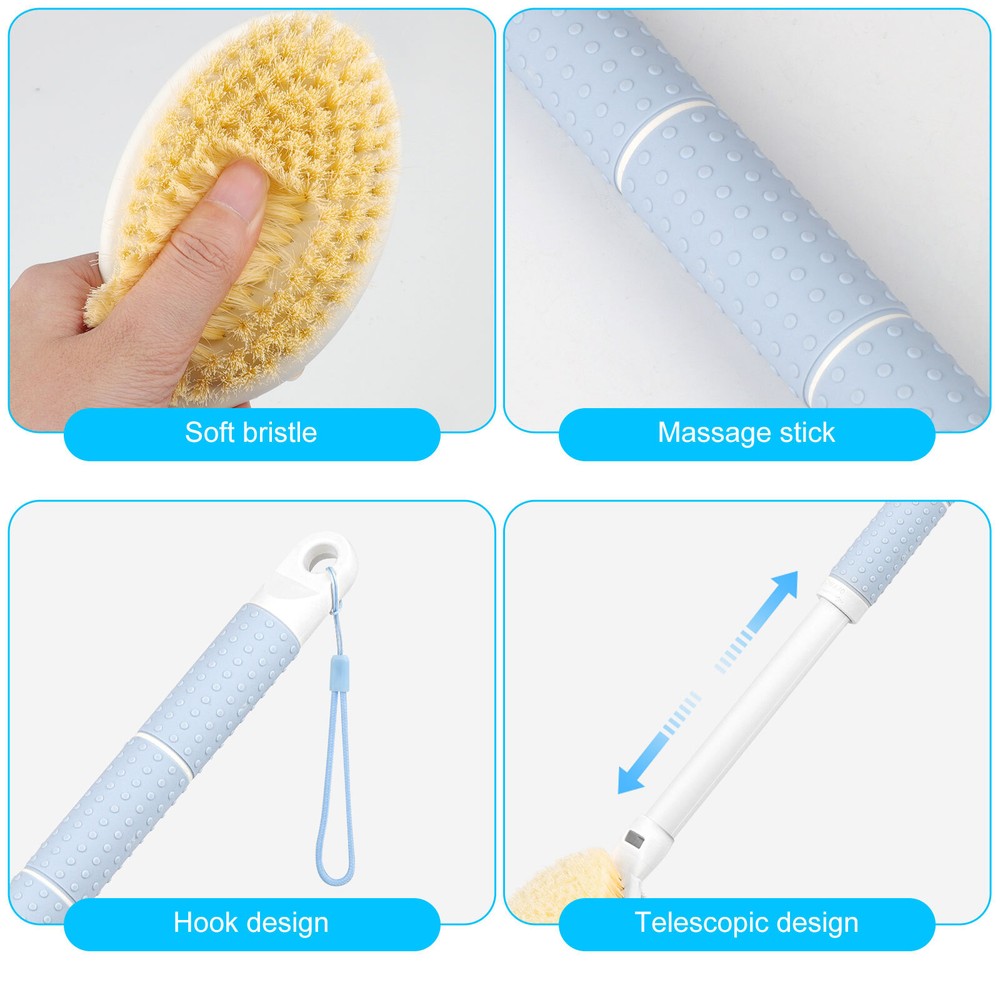 Product Description Back Scrubber Anti Slip for Shower, Shower Brush Long Handle with Stiff and Soft Bristles, Body Exfoliator for Bath or Dry Brush Product Feature ✨ Extra-long Handle: This body brush features an extended handle that reaches farther than standard models, allowing you to clean your back, calves, and feet effortlessly—no bending or twisting needed. Ideal for tall individuals or those with limited mobility. 🌀 Stiff & Soft Double-sided Brush: Equipped with a dual-action head—boar bristles on one side offer deep exfoliation and circulation-boosting massage, while ultra-soft nylon bristles on the other side create rich foam and gently clean sensitive skin. 🌿 Dry Brushing Function: Designed for dry use as well, this brush clears pores, sloughs off dead skin, and removes excess oil and impurities. Helps promote blood circulation for smoother, more radiant skin. 🖐️ Upgraded Non-Slip Grip: Features two textured rubber zones along the handle, providing a secure, no-slip grip—even in wet, soapy conditions. Easy to hold at any angle for comfortable use. 🌊 Lightweight and Durable: Made from high-quality polypropylene, this brush is 30% lighter than wooden types. It’s waterproof, sturdy, quick-drying, and easy to clean—perfect for daily bathing. 🎯 Easy to Use and Hang: Ideal for women, men, and seniors. Simply attach the brush head to the handle before use. Includes a built-in rope loop for convenient hanging and fast drying after each shower. Product Specification Type Adjustable Telescopic Shower Brush Brush Head Material Boar Bristle (Hard Side), Nylon (Soft Side) Handle Material PP + TPE Non-Slip Silicone Particles Handle Diameter 28mm Handle Diameter 28mm Telescopic Length 43-60cm Adjustment Method Twist-Lock (Left = Lock, Right = Adjust) Features Shower Brush, Back Scrubber, Dry Brush, Exfoliator, Cellulite Massager Use Cases Wet Bath Scrubbing, Deep Cleansing Package Included 🎁 1 × Dual-Sided Telescopic Shower Brush Location Descriptions To improve your buying experience and ensure fast delivery, Your order will be shipped from the warehouse located in either new jersey or california that is closest to your address. If you have any questions, Please contact us. Thank you for your support !