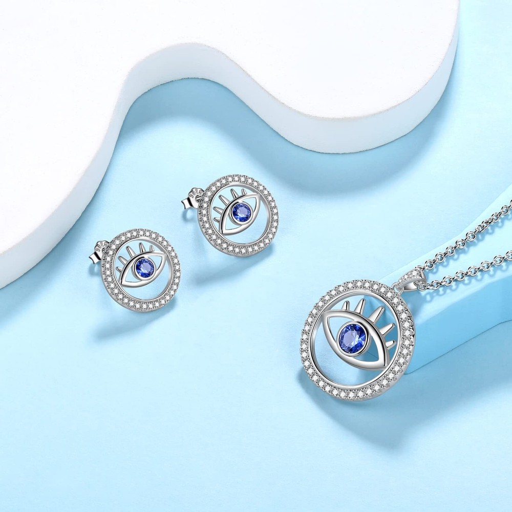 Adjustable Evil Eye Ring Turkish Eye Necklace Blue Eye Stud Earrings White Gold Plated Over Sterling Silver Women's Symbolic Evil Eye Crystal Jewelry Christmas Day Gift Valentine Day Gift for Her Product Details Color: G, Eye Set Brand: Jewmon MPN: FS0145W-US UPC: Does not apply EAN: Does not apply Date First Available : October 11, 2021 Manufacturer : Jewmon Jewelry Brand, Seller, or Collection Name: Jewmon Material: Crystal Gem Type: Cubic Zirconia Clasp: Lobster Clasp Model number: FS0145W-US Metal: Silver Metal stamp: S925 Stone shape: Round Minimum color: blue Charming and Amulet ❤The evil eye is often a symbol of luck, fortune, protection and prosperity. It is said that wearing this special evil eye charm necklace could be a protection amulet to ward off misfortune. Evil eye necklaces can bring good luck, health, success and wealth for you and your family members. Item Details ♥Material:High Quality Solid Sterling Silver 925 (tarnish-free, nickel-free, lead-free, and cadmium-free. 100% safe for sensitive skin). ♥ Adjustable Ring Size, you can adjust it to be smaller or larger to fit perfectly on your finger. ♥Chain:20inch rolo chain with 2inch extender chain, with Lobster Clasps. ♥Top quality Cubic zirconia are sparkling and reflect rainbow gloss in the sunshine just like a real diamond. ♥GIFT BOX: Come up with a velvet pouch and beautiful gift box for gifting (or of course...to keep for yourself). ♥This beautiful jewelry match with suitable apparel for different occasion such as dance party, Christmas, Mother's Day, Birthday, Anniversaries, Graduations, Weddings, Thanksgiving, Valentine's Day,Everyday Wear or any others occasions ! Warm Tips 1.Keep silver jewelry clean and dry. Silver jewelry should be placed in a sealed dry place when not in use. 2.Better not wearing it while bathing 3.Away from chemical, such as perfume. Best to wear perfume before wearing jewelry. 4.Regularly wipe the surface with a polishing cloth will help maintain its shine. 5.The pictures are from actual product, there might be differences of color and texture due to different display monitors.