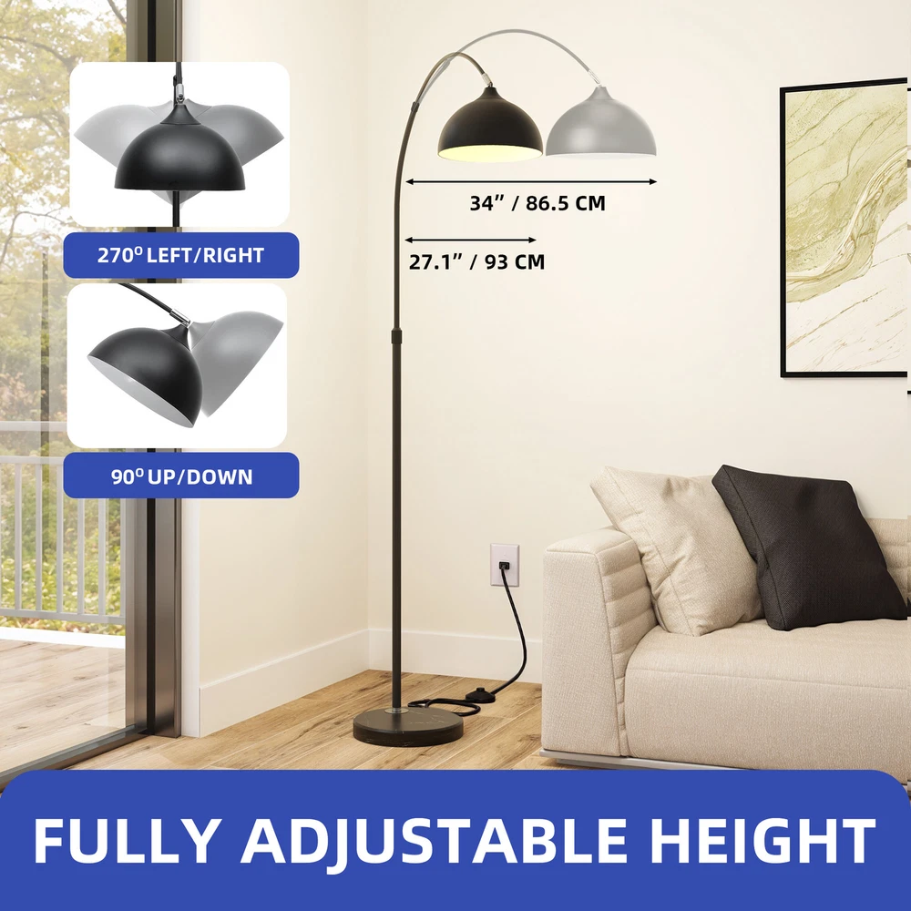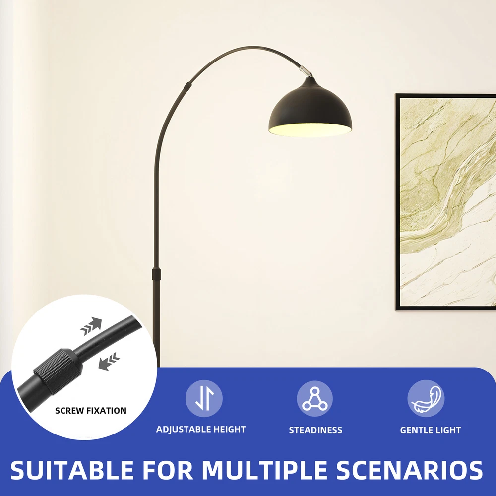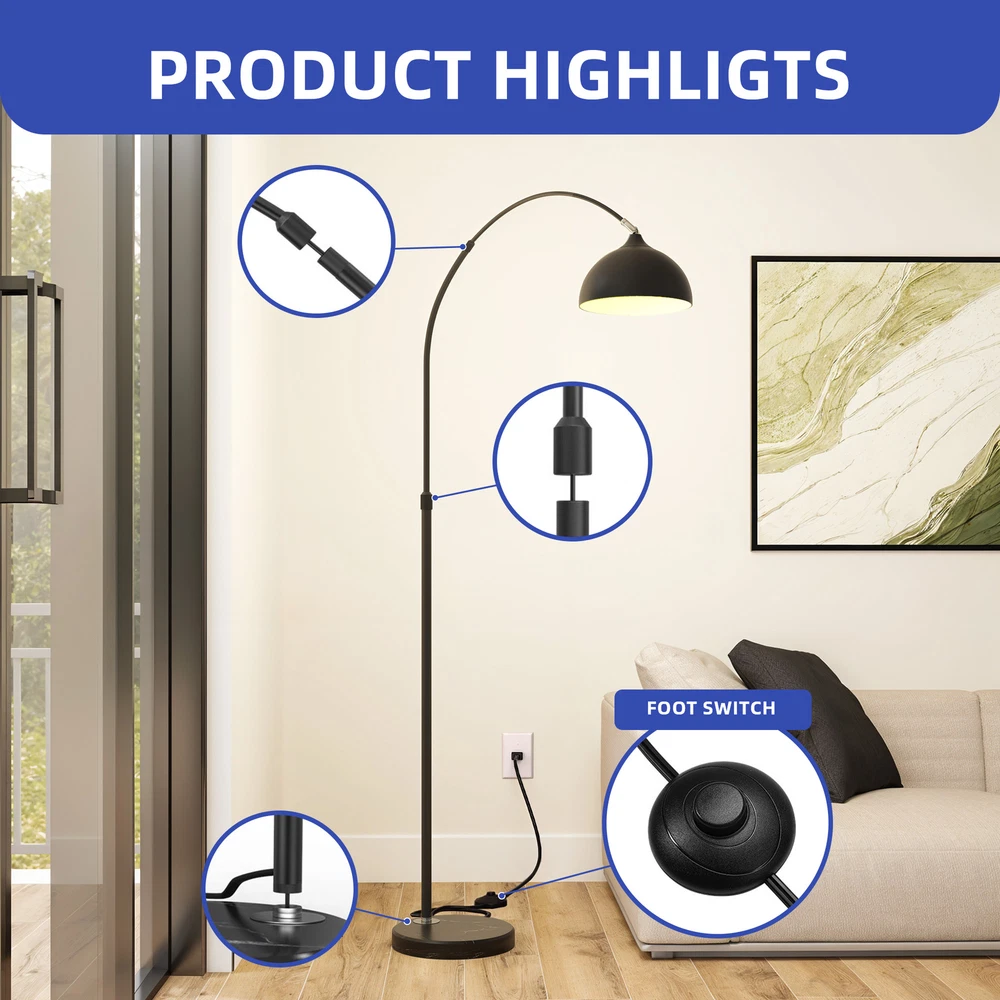 Adjustable Floor Lamp w/ Foot Switch Metal Arched Standing Lamp for Living Room Product Description NOTE: Professional Installation Would Be Highly Recommended. Description : 1. Color: Black 2. Materials: Iron & Marble 3. Room Type: Bedroom, Living Room, Family Room, Den, Home Office/Study, Entertainment Area 4. Feature: Foot Switch, Fully Adjustable Height, 270° Left/Right, 90° Up/Down, Screw Fixation, Steadiness, Gentle Light, Bulb & Switch Not Included, Corrosion-Resistant Base, Sturdy Metal, Suitable for Various Settings, Compatible with All E26 Bulbs, Max Wattage: 60W, Easy to Assemble, Easy to Clean. Features: 1. Sleek Functional Design: Features a convenient foot switch for easy operation, making it perfect for placement beside a couch or reading chair. The solid base ensures stability, providing both functionality and style in a modern living space. 2. Adjustable Lighting Flexibility: This lamp offers a fully adjustable height and a lamp head that can pivot 270° left/right and 90° up/down, ensuring you can direct light exactly where it is needed. It's ideal for task lighting in living rooms, bedrooms, or offices, providing versatility and ease of use. 3. Stable and Versatile Lighting: Equipped with secure screw fixation for extra stability, this lamp is designed to remain steady in any position. Its adjustable height and soft illumination make it suitable for a variety of settings, ensuring optimal lighting for relaxing or working. 4. Ideal Size Flexibility: Standing 61 inches tall with a 34-inch arch reach, this lamp is perfectly sized for living rooms, bedrooms, or offices, providing ample overhead lighting. It is compatible with standard E26 base bulbs up to 60 watts, offering versatility in light intensity and energy efficiency for various settings. Dimensions: 1. Overall Dimension: 34"W x 131"H 2. Lamp Shade Dimension: 9.8"Ø x 4.9"H Package Included: 1. 1 x Floor Lamp 2. 1 x Accessory Kit 3. 1 x Instruction Manual Note: 1. During assembly, do not tighten screws until all holes are aligned. 2. Confirm the appropriate furniture size for your needs prior to purchase. 3. There may be a slight color discrepancy between the product as seen on your monitor versus in real life. 4. Do not expose the product to extreme sunlight. To extend product lifetime, cover when not in use. 5. Contact us immediately if any components are missing or damaged upon arrival. Our customer service team will resolve your issue right away . Shipping 1. Normally the item will be dispatched within 1 business day if payment is cleared before 12 pm PST. 2. Please verify the correct shipping address in your PayPal account before making the payment. We only dispatch the item to the address that is sent to us at the time of checkout. 3. We don't ship to Hawaii, Alaska, Puerto Rico, APO/FPO/PO Boxes. 4. We don't provide local pick-up service. 5. Normally we will use USPS, UPS, FedEx & LTL to dispatch items. Payment 1. We accept PayPal and credit card. 2. We will ship to the confirmed Paypal shipping address that is provided with the payment only. Return 1. 30 days Money Back Guarantee. 2. Please contact our customer service to receive a RMA form first if want to return the item. 3. All returned items MUST in new condition with the original package. Contact If has any problem, please contact us by sending an ebay message. Our customer service will resolve the problem as soon as possible. On Dec 1, 2024 at 21:00:34 PST, seller added the following information: