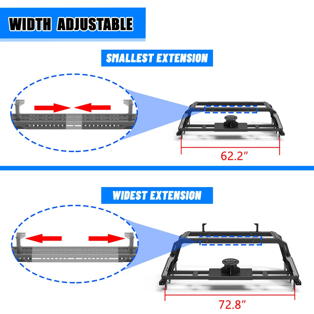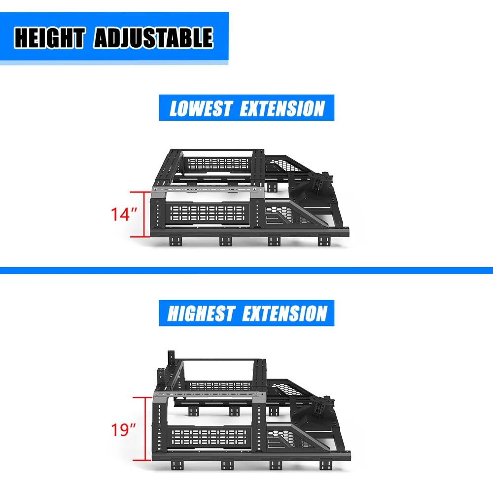 Store Categories Other Car Refrigerator Front Bumper Rear Bumper Fender Flares Inner Fenders Side Steps Running Board A-Pillar Light Mount Brackets Headlights Taillights Fog Lights LED Headlights LED Taillights LED Fog Lights Jeep Chevrolet Ford Toyota Dodge GMC More Roll Bar: https://www.ebay.com/itm/405272971219 https://www.ebay.com/itm/405256884904 https://www.ebay.com/itm/405270551962 Modular Overland Bed Rack (Front) Features: Mounting Base: ✴ Compatible with most retractable, roll-up, and folding bed covers. ✴ Bed covers will not be able to fold completely back. ✴ Can be secured by punching holes in the bed shoulders or Locked to factory side rails. LED Light Mounting Bracket: ✴ Pod light or Light Bar can be installed ✴ Adjustable position of mounting bracket ✴ Adjustable height range of 4.84-7.6inches Side Rail Mounting Bracket : Compatible with factory bed rail. Decorative Bezel: Honeycomb Mesh Allows DIY colour spraying. Modular Overland Bed Rack (Mid) Features: Mounting Base: ✴ Compatible with most retractable, roll-up, and folding bed covers. ✴ Bed covers will not be able to fold completely back. ✴ Can be secured by punching holes in the bed shoulders or Locked to factory side rails. ✴ SpareTyre Carrier can be installed above the base. Side Rail Mounting Bracket: Compatible with factory bed rail. Connection bracket: Connect to the Bed Rack(Front) Molle Panel Features: ✴ Side panels w/ plenty of long holes cutouts for adding accessories. Mount anything from lights, recovery tracks,jerry can,farm jack, fire extinguisher, bike mounts, etc. ✴ 2mm steel Construction. Spare Tyre Carrier Features: ✴ Can be mounted directly on the bed, but requires pre-punched holes and installation of the rivet nut. ✴ Compatible with most off-road tire. ✴ Available in 5mm steel plate. ✴ Width adjustment range 66.2-74.8 Inches. Compatibility ✴ For 1994-2010 Dodge Ram 1500/2500/3500; ✴ For 2011-2025 RAM 1500/2500/3500 (Not compatible for models with RamBox) ✴ For 1999-2025 Chevy silverado/GMC sierra 1500/2500HD/3500HD ✴ For 1997-2025 Ford F-150; ✴ For 2017-2025 Ford F-250/350 Super Duty; ✴ For 2000-2021 Toyota Tundra; ✴ For 2004-2024 Nissan Titan/Titan XD Specification ✴ Color: Black ✴ Materials: Q235A ✴ Placement on Vehicle: Rear ✴ Installation: Bolt-on, ✴ Attachment Type: Screw-On ✴ Items Included: Mounting Hardware ✴ Surface Finish: Black Powder Coated Steel ✴ Fitment Type: Direct Replacement ✴ Adjustable Width: 62.2~72.8 inch ✴ Adjustable Height : 14-19 inch ✴ Modular Overland Bed Rack (Front) Package Size: 33.66 *25.59*10.63 inch ✴ Modular Overland Bed Rack (Front) Package Weight: 82.67lbs ✴ Modular Overland Bed Rack (Mid) Package Size: 33.66*25.59*6.69 inch ✴ Modular Overland Bed Rack (Mid) Package Weight: 52.91 lbs ✴ Spare Tyre Carrier Package Size: 33.46*17.71*12.6 inch ✴ Spare Tyre Carrier Package Weight: 81.57 lbs ✴ Molle Panel Package Size: 27.56*7.87*5.51 inch ✴ Molle Panel Package Weight: 11.02 lbs Package List ✴ 1*Modular Overland Bed Rack (Front) ✴ 1*Modular Overland Bed Rack (Mid) ✴ 1*Spare Tyre Carrier ✴ 1*Molle Panel ✴ 1*Set of Mounting Accessories Payment Delivery details Terms of sales About us Contact us Payment We accept PayPal, credit card , Apple Pay & Google Pay etc. Delivery details All items will be shipped within 1-3 business days after payment received, we will try our best to ship out as soon as we can, hope for your understanding. Please double confirm your address and contact information, which will help the delivery faster and more accurately. Note :buyers who purchase international products need to pay import tariffs!!! Terms of sales Professional installation is highly recommended. Any problem of the item please feel free to contact us first , please D o Not leave negative feedback before that, or simply return it within 60 Days in original condition. We will resolve it for you ASAP. About us Any questions please do not hesitate to contact us directly by eBay message . We will reply you within 24 hours asap, thanks for your understanding. Contact us Should you have any problem or require any further information please feel free to contact us . If you are satisfied with our product and service, please kindly leave us a positive feedback. Popular Categories