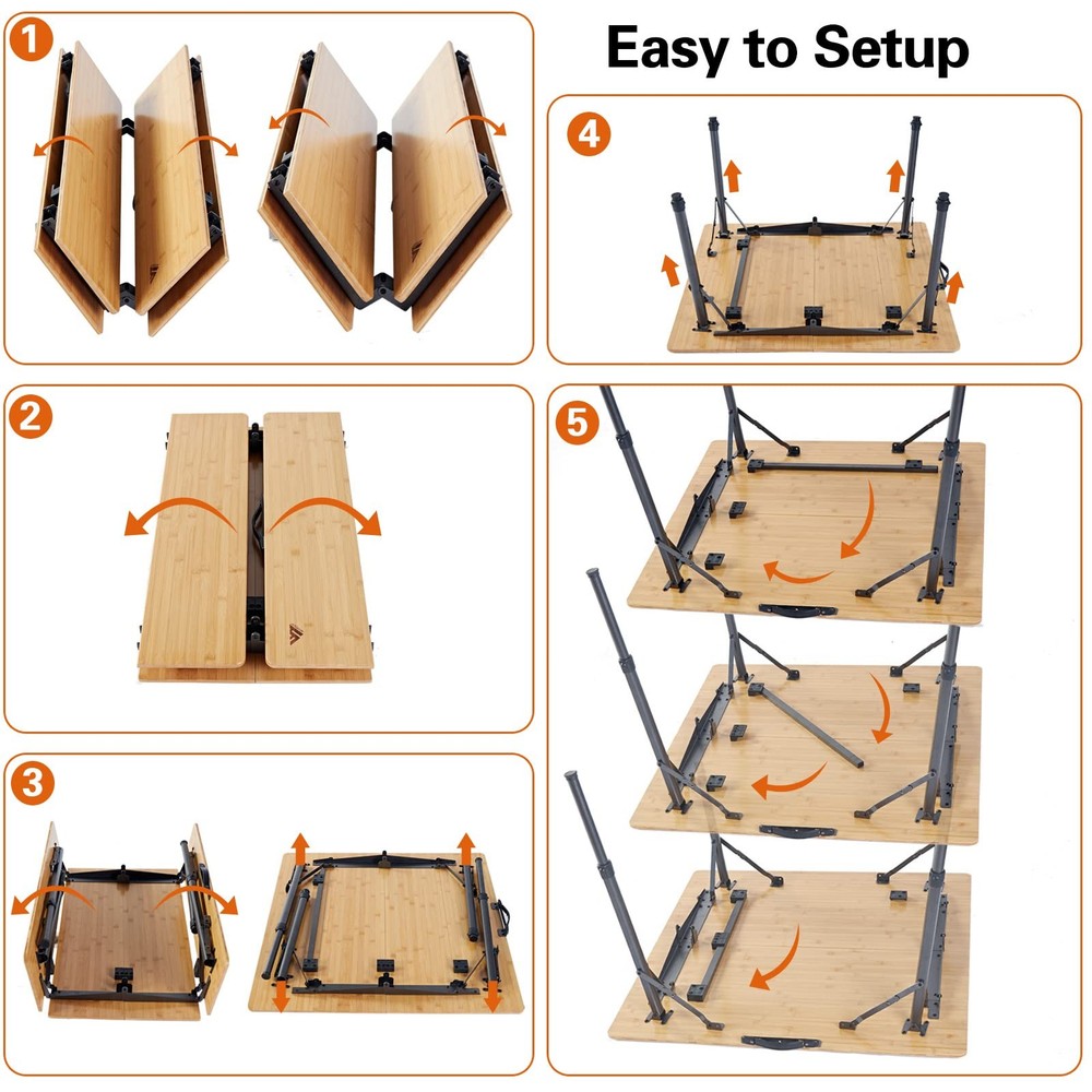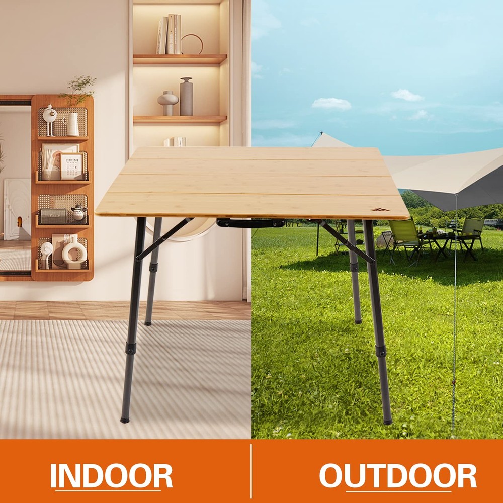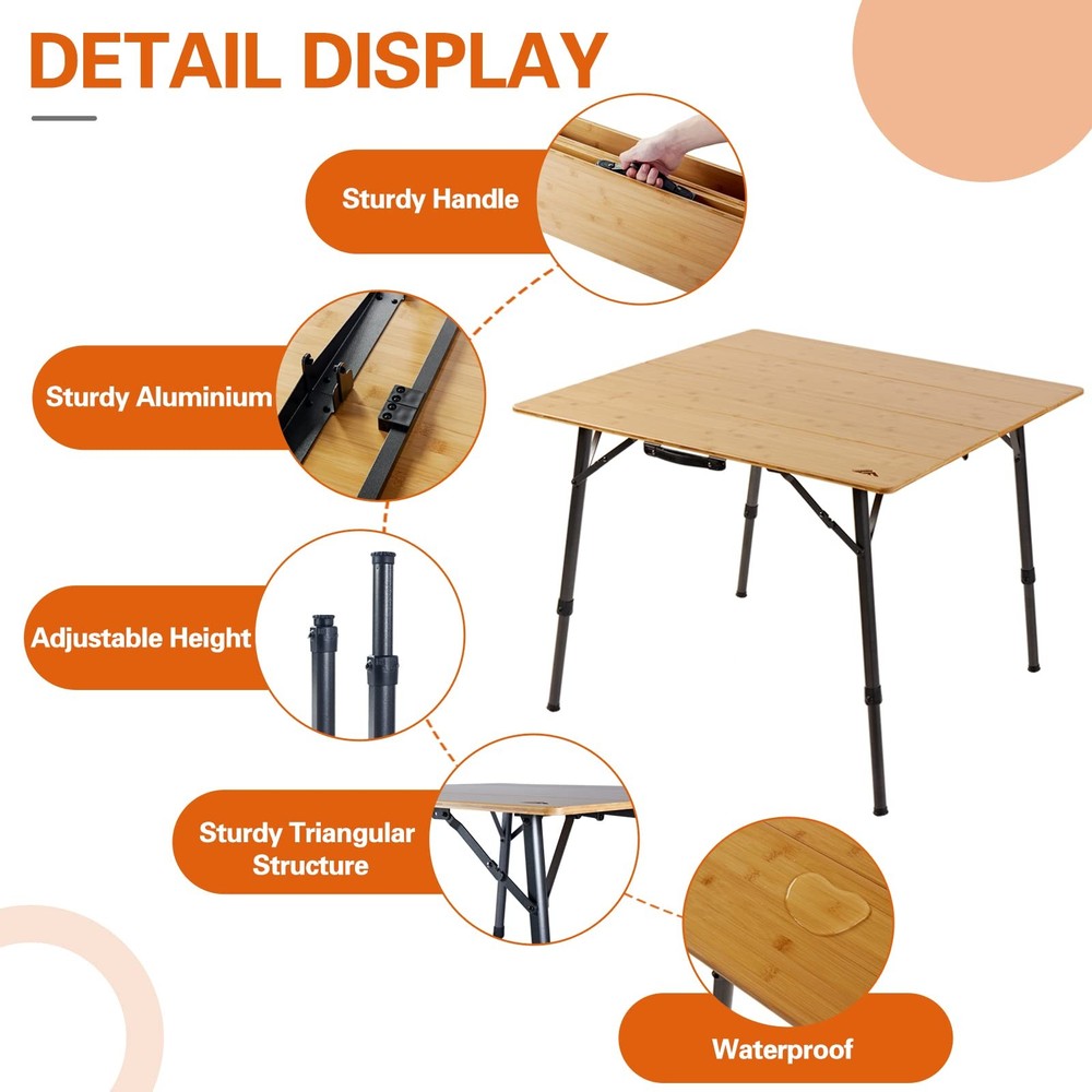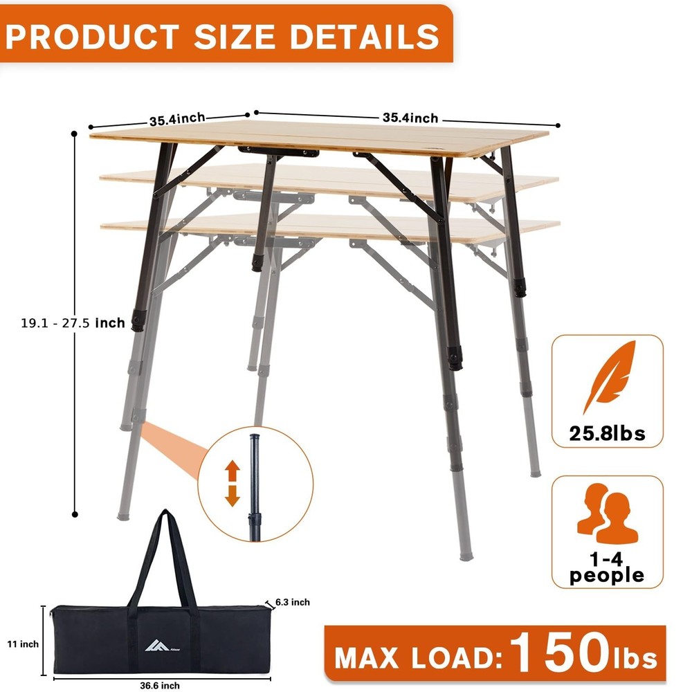 Camping Table Bamboo Folding Table with handle, Adjustable Height Portable Table for Camping, Picnic, Outdoor and Indoor, 4-Fold Natural Bamboo Top (1-4 people) 【Natural Bamboo Board】: The camping table is crafted with a natural bamboo top, which is sturdy, sturdy, and environmentally friendly. And effective waterproof. The smooth tabletop is perfect for placing drinks, snacks or cooking equipment on. 【Adjustable Height】: The table has height settings, allowing you to adjust the height of the table according to your needs- between 19.1 and 29.5 inches tall. Maximum load bearing 110 pounds.This feature makes the table suitable for various occasions, such as camping, picnic, outdoor and indoor use. 【Table Handle & Carrying Bag】: This is one of our unique designs, the Camping Table is equipped with a sturdy handle that makes carrying and moving it easy. Besides, it comes with a carrying bag that enables you to store and transport the table efficiently. 【4-Fold Structure & Easy to Assemble】: The table has a 4-fold structure and a straightforward assembly process. You can assemble it within seconds and fold it back into a compact size, occupying small storage space outdoors or at home. There is an instruction manual in the carry bag, you can check the steps while assembling. 【Multifunctional】: The Camping Table is not only suitable for outdoor activities, but it can also function as a coffee table, laptop desk, or even a small dining table. Its modern design and natural bamboo finish will complement any setting and add a touch of elegance.