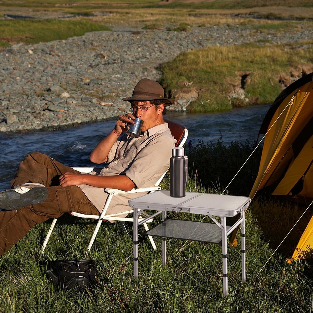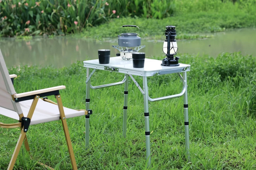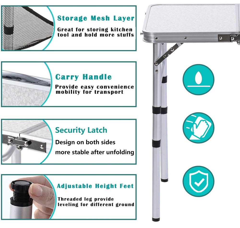 Convenient Mesh Storage Layer:Messy camp tables are a hallmark of any camping setup. Finally, you can get organized thanks to the mesh storage layer under this handy table. Stash cooking supplies, snacks, utensils, games, reading materials and more Overall Dimensions:This picnic table open size is :23.6 "x 15.8 ",3 Heights : 10 ",19 ",24 " with the adjustable legs. Pack size is 15.8 "x11.8 "x2.8 " when folded in half. Lower than a traditional US dining table.Compact and short, great for camping Thoughtful Design: Small Aluminum table with high-quality MDF top, thicker 25 mm diameter Aluminum Alloy Frame. 5.5 lbs weight. 70 lbs capacity. 4 leg extensions with adjustable feet for leveling or adding height Lightweight and Portable:The folding aluminum camping table is super lightweight, very easy to set up and take down. Folds up to the size of a small briefcase, with a carrying handle. Good size for car-camping, or maybe as an end-table on your patio Steady and Compact:Foldable and liftable outdoor camping table. Quite handy! Can be used for outside camping table for picnics after lifting up ,and table for laptops putting on bed after lowing down. Very steady. Won't shaking