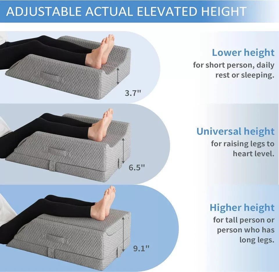 Height-Adjustable Leg Wedge Pillow: We designed this legs pillow with a variety of adjustable height, so that you can according to your height to choose the suitable elevating height. For a lower height, just take off the bottom layer; For a higher height, just add the top pad. This leg pillow can be used not only as a flat top pillow but also as a U-shaped top pillow to meet your different needs. CertiPUR-US Certified Memory Foam: The top layer and the pad are filled with gel memory foam, ensuring cool and dry even with prolonged use. The bottom two layers are filled with high-density foam, soft but supportive, never deform after long-term use. CertiPUR-US certified memory foam is healthier and more suitable for after surgery. Multipurpose Ergonomic Leg Rest Pillow: The pillow is designed with a perfect incline to fit the contour of the legs. The U-shaped groove is wide enough to support your both legs and prevent legs from sliding and falling, suitable for recovery after post surgery. It can also be used to elevate the legs during rest or sleep, relieving leg pressure, back pain and sciatica pain. Breathable & Luxury Jacquard Cover: The new stylish jacquard fabric, certified by OEKO-TEK Standard 100, is breathable and healthy, which will not cause sweat even in the hot summer. Compared with other ordinary white jacquard fabric, our upgraded cover is not easy to wear and get dirty. The large U-shaped opening zipper makes it easy to remove the cover for machine washing.