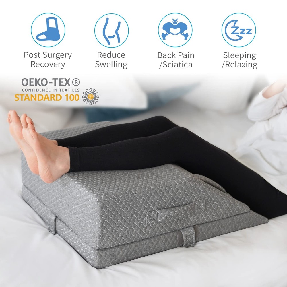 Adjustable Both Legs Elevation Pillow for After Surgery, Swelling, Sleeping or Rest - BEST OPTION for elevating the leg above heart level, facilitating blood circulation and alleviating leg pain. Specifications: - Color: Grey - Outer Fabric: Jacquard Fabric - Inner Fabric: Polyester - Core Material: Memory Foam - Size: 24"x21"x8"(LxWxH) - Weight: 5.2Lb Features: - Adjustable Heights allow you to choose the suitable elevating height according to your height. - Externally disassemble leg rest pillow for elevation ensure easier height adjustment. Reinforced Velcros are strong and durable. - The leg pillow is filled with memory foam of different hardness, which provides enough support for your leg while brings you a soft and comfortable experience. - Two handles on the front make it easier for you to pull and position your leg wedge pillow for elevation, and the side two handles are for carrying. - The bottom of the pillow covers are designed with non-slip silicone particles to prevent the leg pillow from moving during use. Package Contents: - 1x Leg Elevation Pillow s Warm Tips: 1. Please allow the product to expand fully before use, which usually takes about 24 hours. 2. Airtight transport may cause a slight odour which will dissipate after a few hours of ventilation. 3. Please stick the Velcro to the non-slip bottom when removing the bottom layer for use or cleaning the covers, to avoid the Velcro scratch covers, clothes, bedding, etc. Height-Adjustable Leg Wedge Pillow: We designed the legs pillow to be adjustable so that you can choose the suitable elevating height for your height. Plus you can add the bottom layer when sitting and remove the bottom layer when lying down, always keeping your legs at a comfortable height. The bottom piece and the main part are connected together by Velcros, easy to remove and reinstall. CertiPUR-US Certified Memory Foam: The top layer of the wedge pillow is filled with gel memory foam, keeping cool and dry even with prolonged use. The bottom two layers are filled with high-density foam, soft but supportive, never deform after long-term use. CertiPUR-US certified memory foam is healthier for daily use on bed or couch. Multipurpose Ergonomic Leg Rest Pillow: The both legs pillow is designed with a perfect incline to fit the contour of the legs. The top plane is wide enough to support your both legs without sliding off. Perfect for elevating your legs when resting, watching TV, reading and sleeping, improving blood circulation, reducing legs pressure, lower back pain and sciatica pain. Breathable & Luxury Jacquard Cover: The new stylish jacquard fabric, certified by OEKO-TEK Standard 100, is breathable and healthy, which will not cause sweat even in the hot summer. Compared with other ordinary white jacquard fabric, our upgraded cover is not easy to wear and get dirty. The large U-shaped opening zipper makes it easy to remove the cover for machine washing. Multiple Handle and Non-slip Design: Two handles on the front of the leg pillow make it easier to pull and adjust it to a comfortable position, and the side two handle is for carrying around. The bottom of the wedge pillow cover is designed with non-slip silicone particles to prevent the leg pillows from moving during use. well-designed leg pillows make thoughtful gifts for your family and friends.