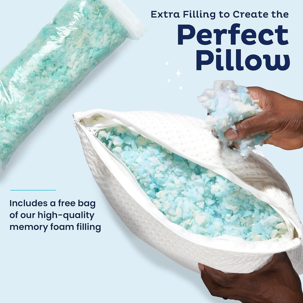 ADJUSTABLE - Find your perfect match! Whether you prefer firmness or softness, this side sleeper pillow includes adjustable shredded memory foam that lets you choose the way you snooze. CERTIFIED - Rest easy knowing our memory foam pillow is both Certi-PUR-US and GreenGuard Gold certified. No more losing sleep over your pillow's lack of quality. KOOL-FLOW TECH - Just when you thought this pillow couldn't get any cooler! The breathability and Kool-Flow tech of our bed pillow makes sweating while sleeping a thing of the past. MACHINE WASHABLE - Need a wash? Skip the wondering! Toss our viscose of bamboo pillow cover right in the washer - no stress! USA MADE - Our bed pillows & positioners are super durable, built for everyone, and best of all, made in the USA and developed by chiropractors for pain-free nights.