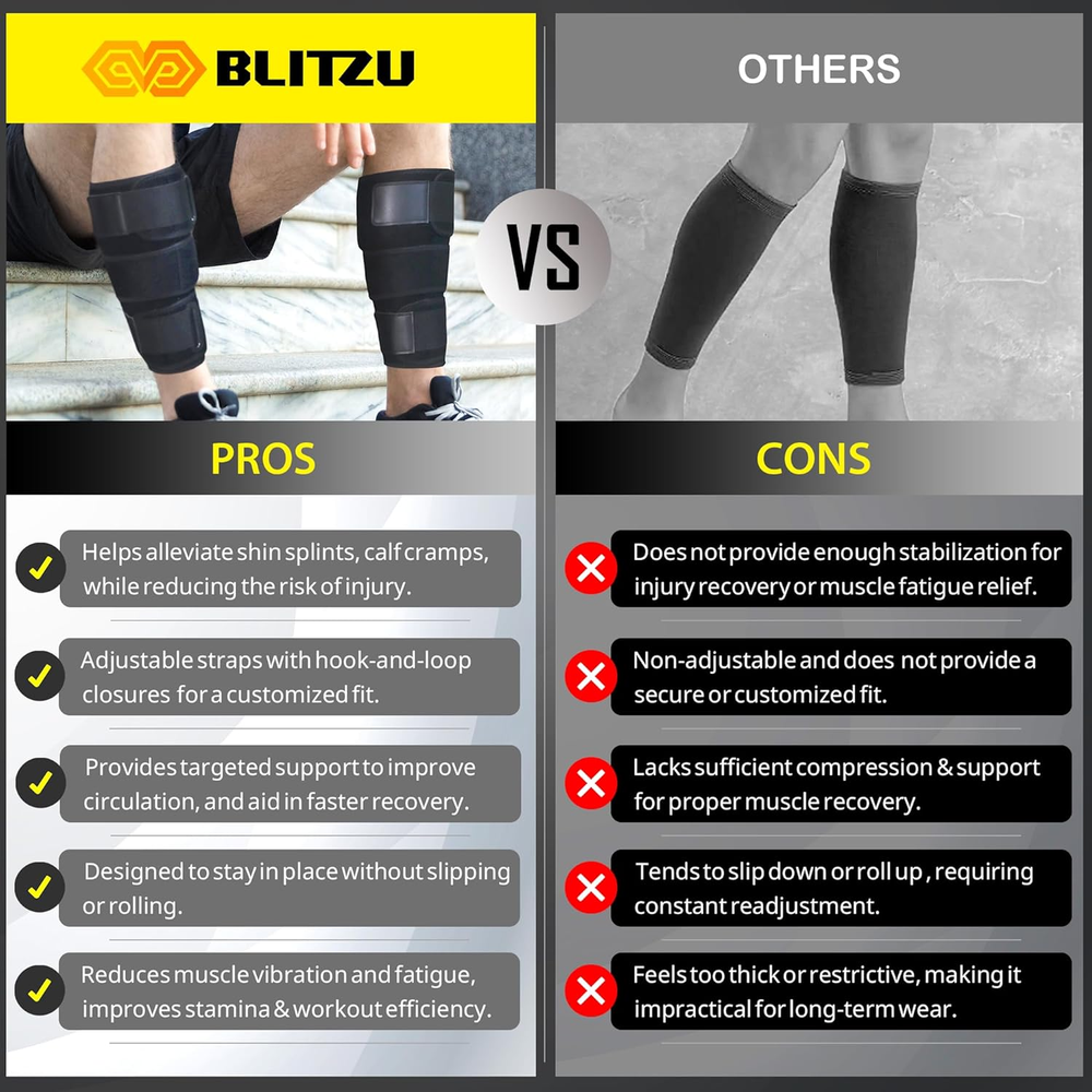 Calf Brace for Torn Calf Muscle, Adjustable Neoprene Compression Sleeve for Women, Men, Runners. Support Wrap for Shin Splints, Strain, Tear, Lower Leg Tibia Injury, and Pain Relief. S-M Effective Pain Relief: The BLITZU Calf Brace provides targeted relief from calf pain, stiffness, swelling, muscle strains, tears, cramps, tendonitis, and shin splints. Ideal for managing discomfort from injuries and overuse, it helps reduce inflammation and accelerate recovery. High-Quality Comfort: Crafted from breathable, high-quality fabric, this calf support ensures all-day comfort and flexibility. The soft, lightweight material is designed for a snug fit that contours to your calf, providing effective support without restricting Dual Adjustable Compression Straps: Features dual adjustable straps for a customizable fit and maximum support. Tailor the compression to your specific needs to stabilize your calf muscles and tendons effectively, reducing pain and preventing further injury during exercise or recovery. Versatile Use: Perfect for a wide range of activities, including running, hiking, cycling, sports, and everyday tasks. The versatile design offers reliable support for athletes and individuals seeking extra stability and comfort during physical activities and recovery. Universal Fit: Available in multiple sizes to fit various calf circumferences for both men and women. The adjustable design ensures a secure, snug fit for all body types, providing enhanced support and preventing slippage during movement. Durable & Easy to Maintain: Made from durable, long-lasting materials that can withstand regular use. The brace is easy to clean and maintain, ensuring it stays fresh and ready for your next workout or activity. Reliable Customer Support: BLITZU is committed to your satisfaction. If you encounter any issues with our calf brace, please contact us for prompt assistance. We offer a satisfactory resolution within 24 hours to ensure you receive the best service and support. Product Description The video showcases the product in use. The video guides you through product setup. The video compares multiple products. The video shows the product being unpacked. Doctor Recommended Recover with Confidence and Comfort Experience targeted relief and support with the BLITZU Adjustable Calf Brace. Designed for optimal comfort and customizable compression, this versatile brace aids in managing calf discomfort, swelling, and muscle strains, helping you stay active and recover faster. Targeted Relief for Shin and Calf Discomfort Durable Design Built with high-quality materials to withstand rigorous use and frequent wear. Enhanced Stability Stabilizes the upper arm muscles, minimizing the risk of further injury and aiding recovery. Adjustable Pressure Straps Extra compression straps allow you to adjust the pressure for optimal support, reducing swelling and adding stability. Breathable Fabric Crafted with lightweight, breathable material for all-day comfort and effective moisture control. Trusted and Approved by Professional Runners! Support That Keeps You Running Strong. "The support it provides is unmatched—I can feel the difference in muscle stability and reduced fatigue, especially during long runs and interval training. It fits perfectly and stays in place without sliding down, even during intense workouts. Plus, my recovery time has noticeably improved, making it easier to train back-to-back days. If you're serious about running and want reliable calf support, I can’t recommend this brace enough!" Trusted and Approved by Store Workers! All-Day Support for On-Your-Feet Strength. "I'm constantly on my feet, lifting, bending, and moving for hours on end. My calves used to ache by the end of the shift, but since I started using the Blitzu calf brace, the difference is night and day. It provides excellent support, reduces fatigue, and makes my legs feel stronger and more comfortable even during the busiest days. I can finally end my shifts without soreness! Highly recommend for anyone in a physically demanding job." 6.0 inches x 9.0 inches x 0.6 inches. Weight: 7.37 oz Color Black Product Dimensions 9 x 6 x 0.6 inches; 7.37 ounces Country of Origin China Specific Uses For Product Sprain Use for Calves Age Range (Description) Adult Size Small/Medium