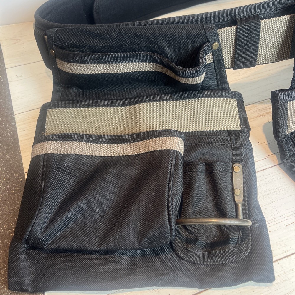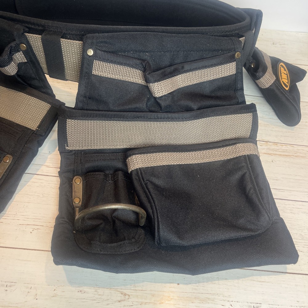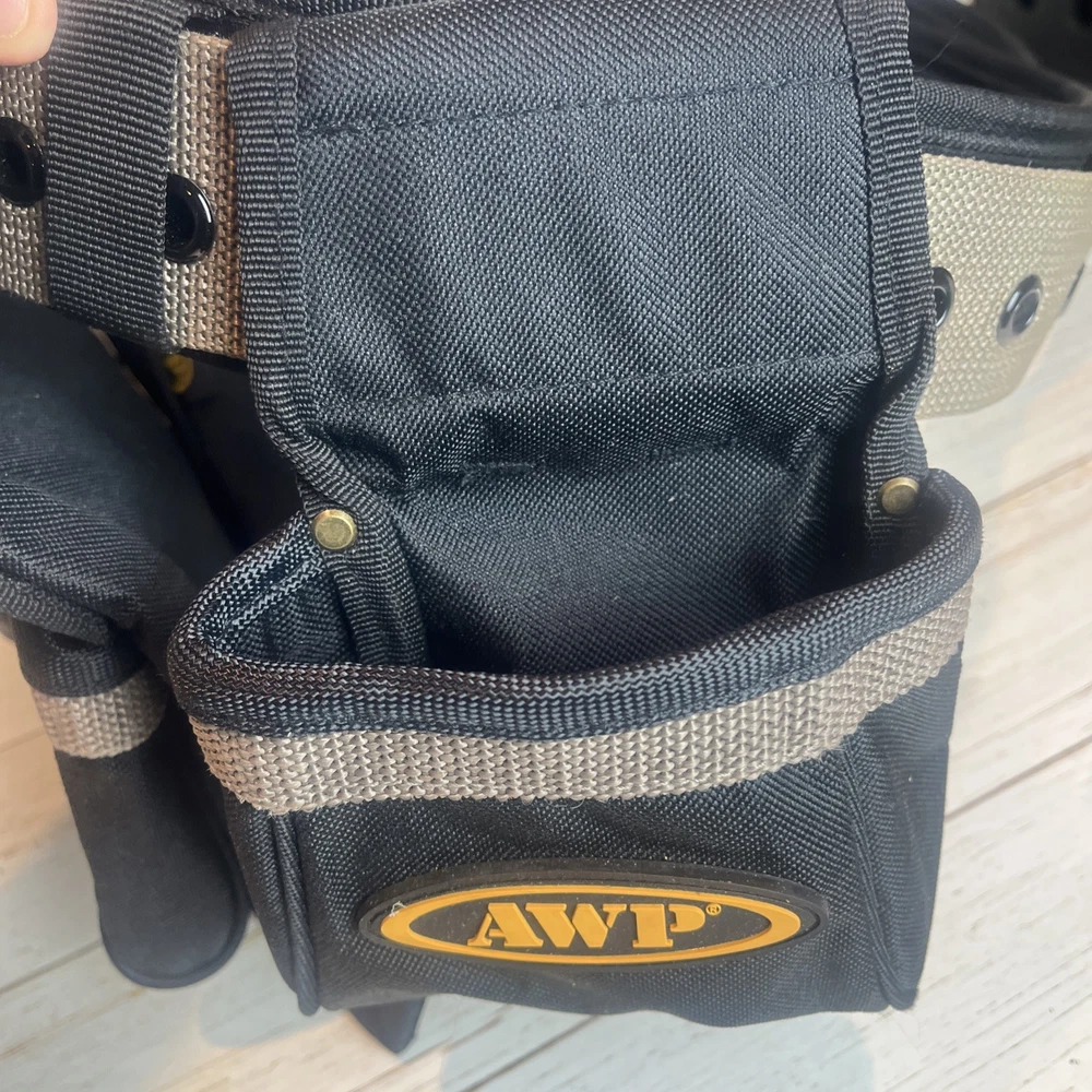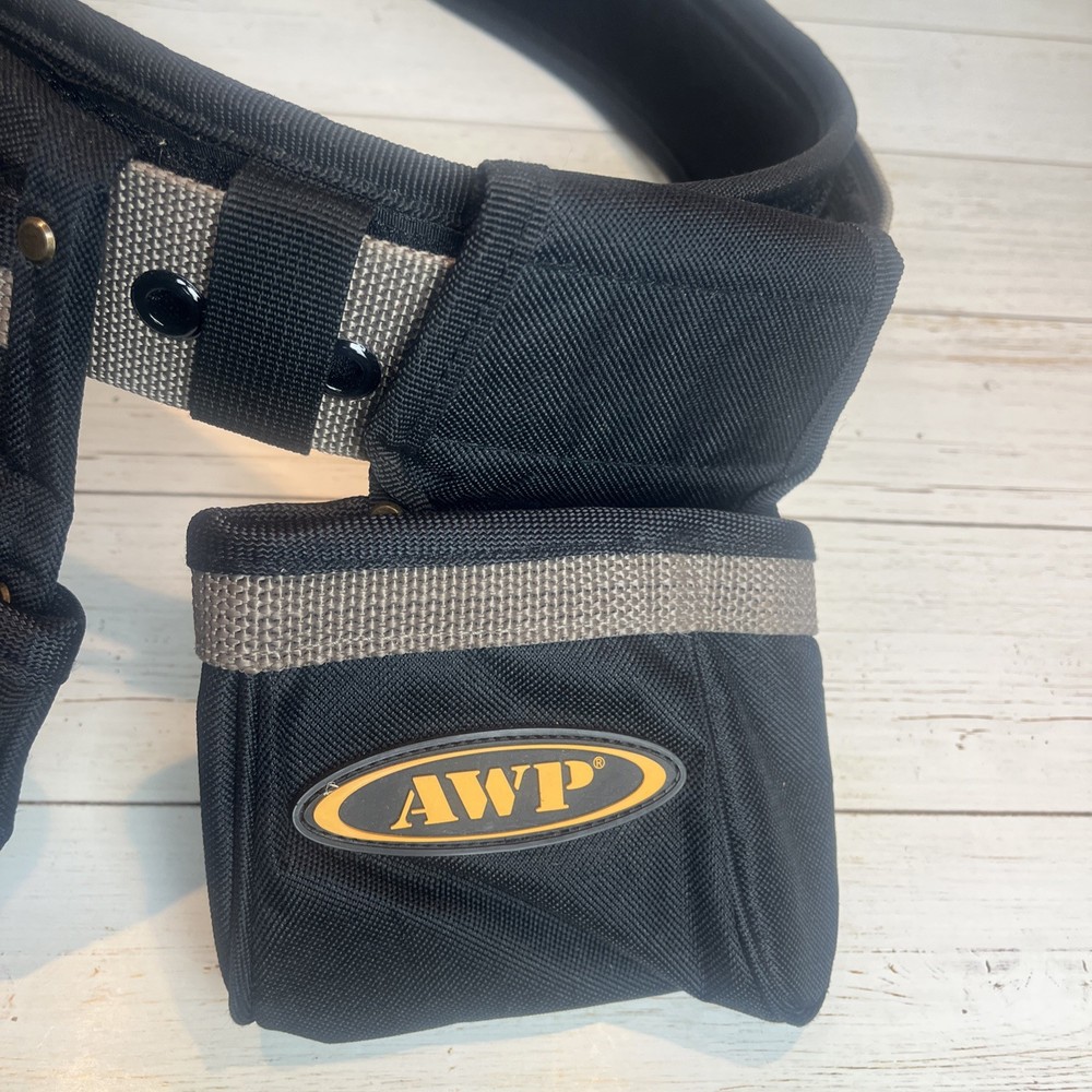 AWP General Construction Carpenter Tool Rig Padded Adjustable Tool Belt 44β This Carpenter tool rig was used briefly by my nephew until he was provided one from his solar installation job. It includes a nylon web belt that has grommets out to 49 inches but the interior hook and loop closure part of the belt probably expands comfortably to 44 inches to allow hook and loop overlap. Includes two large pouches with three pockets each, a hammer hanger, and two spaces for pencils or pens, and one all purpose, smaller pouch as shown. Pet and smoke free home