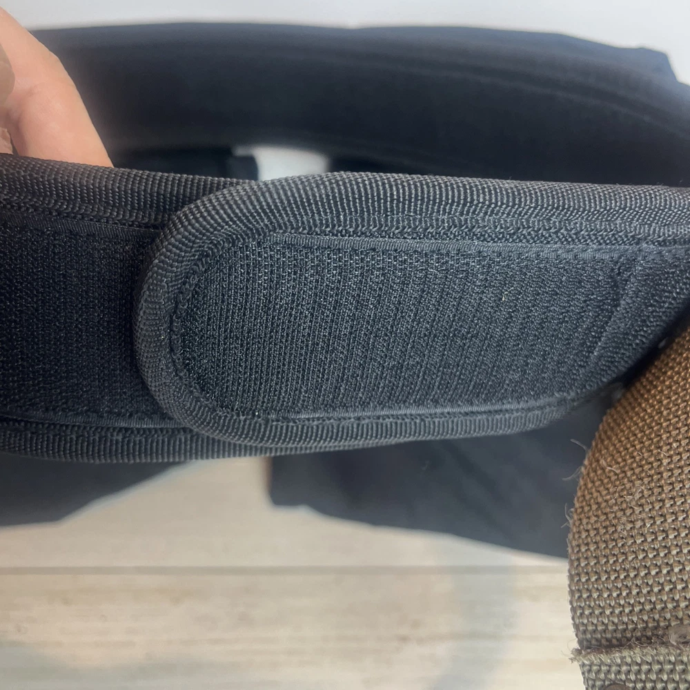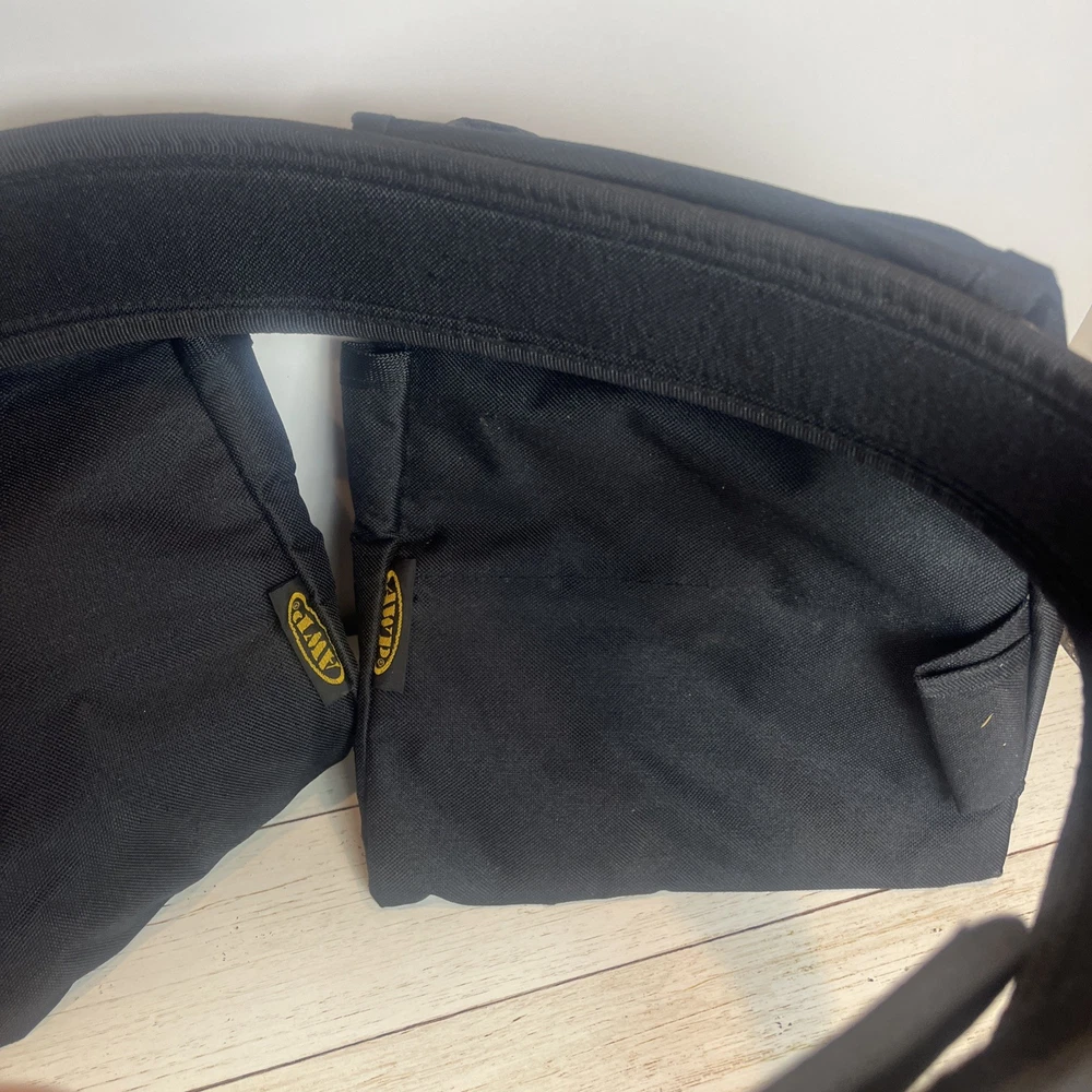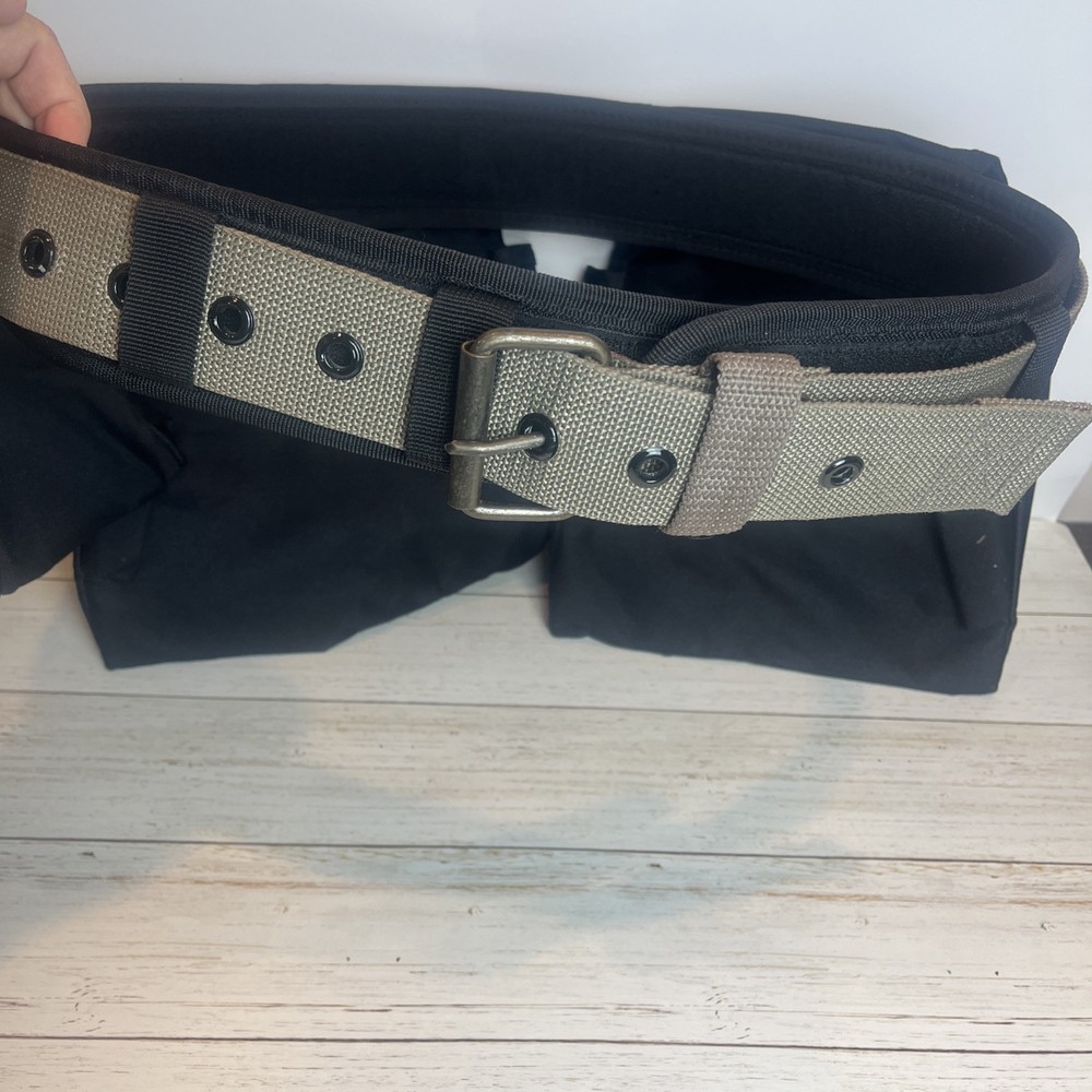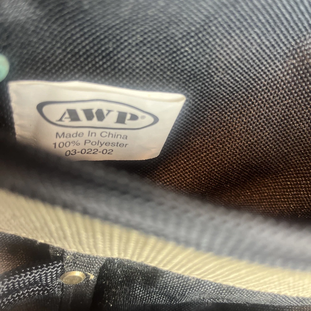 AWP General Construction Carpenter Tool Rig Padded Adjustable Tool Belt 44β This Carpenter tool rig was used briefly by my nephew until he was provided one from his solar installation job. It includes a nylon web belt that has grommets out to 49 inches but the interior hook and loop closure part of the belt probably expands comfortably to 44 inches to allow hook and loop overlap. Includes two large pouches with three pockets each, a hammer hanger, and two spaces for pencils or pens, and one all purpose, smaller pouch as shown. Pet and smoke free home