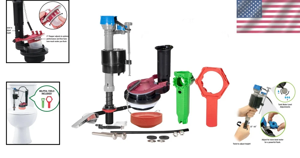 gtin13: Does not apply Color: Multi Material: Plastic Style: Plumbing Fixture Type: Toilet Repair Kit Compatible Brand: American Standard Room: Bathroom Compatible Model: Universal, For Toto, For American Standard Item Diameter: 3 in Brand: Unbranded Suitable For: Toilet Seat Height: Toilet Repair Kit Item Diameter (Interior): Toilet Repair Kit Features: Adjustable Height, Fast Refill, Quiet Refill, Adjustable Tank Dial, Adjustable Bowl Dial, Adjustable Flush Valve, Universal Design UPC: Does not apply Number in Pack: 1 Size: No Size Product Dimensions: 7 X 8 X 14 Inches Item Weight: 2 Pounds Items Included: Fill Valve, Flush Valve, Flapper, Gasket, Tank Lever, Hardware, Tools Batteries Required?: No Gallons per Flush: Toilet Repair Kit Item Package Quantity: 1