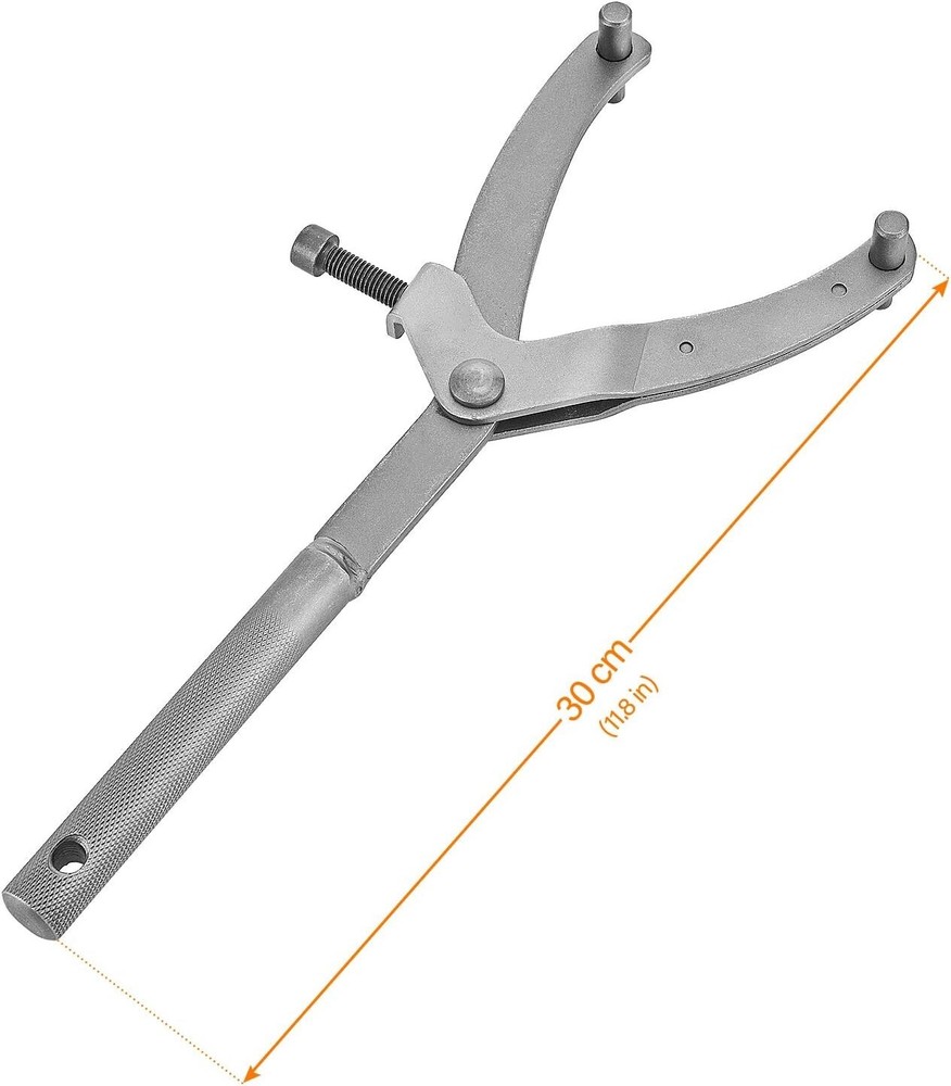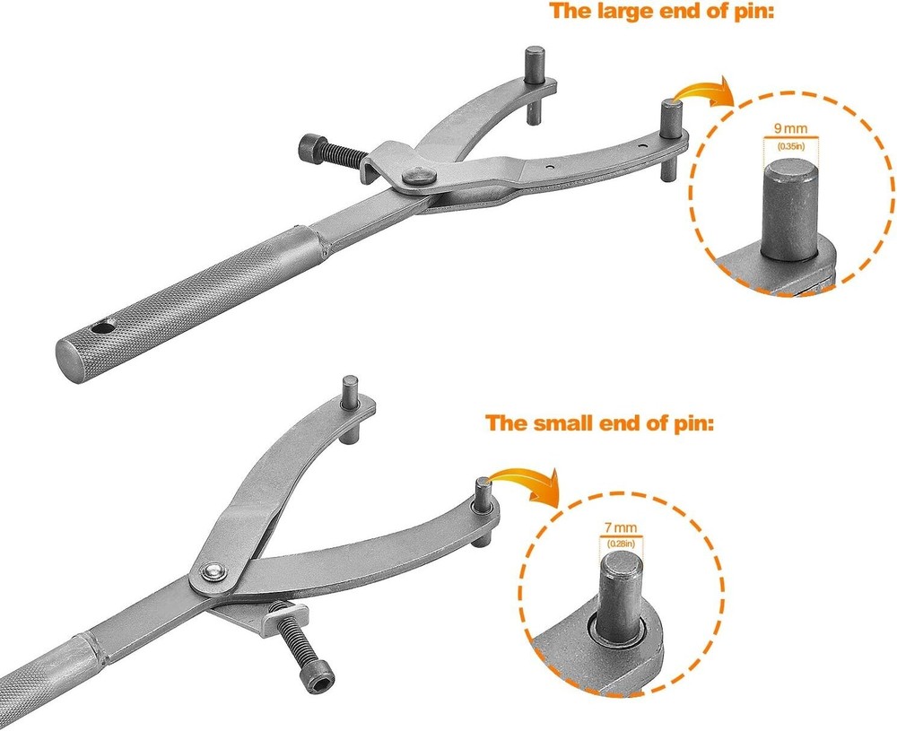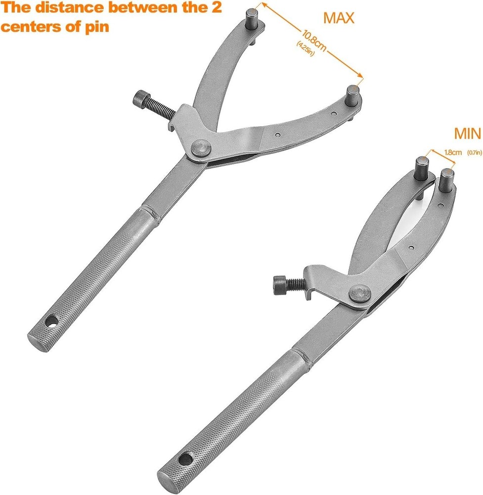 Specification: Length: 11.8in (30cm). Arms Opening Width: 0.7in-4.25in (1.8cm-10.8cm); The large end of pin: 0.35in/9.00mm; small end of pin: 0.28in/ 7.00mm. Material & Manufacturing: Our spanner wrench is made of high quality iron, which is not easy to bend. With good manufacturing, fine workmanship and in reliable quality, it is durable and strong., Especially the end of the pin was Hardening treatment. Wide Applications: Adjustable Screw and two sizes of pin on either side make this spanner wrench suitable for different distances between slots and different sizes of slots. Compatible With: Used to tighten, install and disassemble motorbike accessories. Ideal for scooter clutch, belt pulleys, trim cylinder, motorcycle flywheel, hydraulic gland, transmission gear, variator, hub, etc. Package includes: 1 Spanner Wrench with 2 detachable pins which have been already built-in.