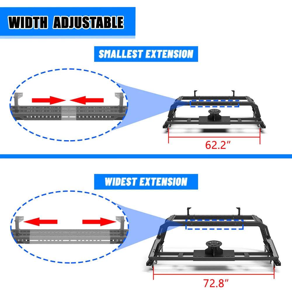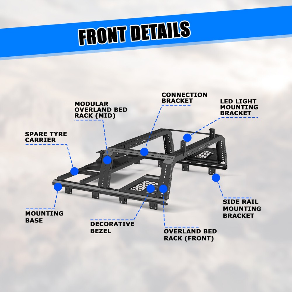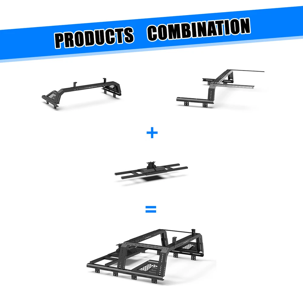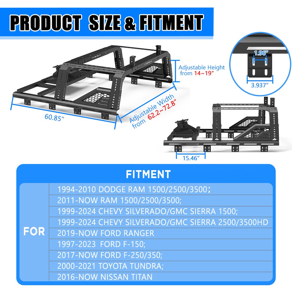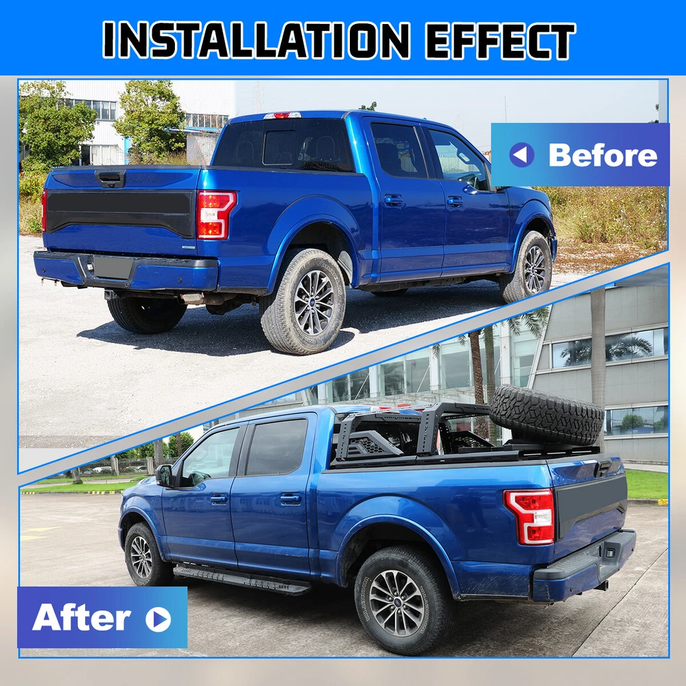 Store Categories Other Car Refrigerator Front Bumper Rear Bumper Fender Flares Inner Fenders Side Steps Running Board A-Pillar Light Mount Brackets Headlights Taillights Fog Lights LED Headlights LED Taillights LED Fog Lights Jeep Chevrolet Ford Toyota Dodge GMC More Roll Bar: https://www.ebay.com/itm/405272971219 https://www.ebay.com/itm/405287282366 https://www.ebay.com/itm/405256884904 Modular Overland Bed Rack (Front) Features: Mounting Base: ✴ Compatible with most retractable, roll-up, and folding bed covers. ✴ Bed covers will not be able to fold completely back. ✴ Can be secured by punching holes in the bed shoulders or Locked to factory side rails. LED Light Mounting Bracket: ✴ Pod light or Light Bar can be installed ✴ Adjustable position of mounting bracket ✴ Adjustable height range of 4.84-7.6inches Side Rail Mounting Bracket : Compatible with factory bed rail. Decorative Bezel: Honeycomb Mesh Allows DIY colour spraying. Modular Overland Bed Rack (Mid) Features: Mounting Base: ✴ Compatible with most retractable, roll-up, and folding bed covers. ✴ Bed covers will not be able to fold completely back. ✴ Can be secured by punching holes in the bed shoulders or Locked to factory side rails. ✴ SpareTyre Carrier can be installed above the base. Side Rail Mounting Bracket: Compatible with factory bed rail. Connection bracket: Connect to the Bed Rack(Front) Spare Tyre Carrier Features: ✴ Can be mounted directly on the bed, but requires pre-punched holes and installation of the rivet nut. ✴ Compatible with most off-road tire. ✴ Available in 5mm steel plate. ✴ Width adjustment range 66.2-74.8 Inches. Compatibility ✴ For 1994-2010 Dodge Ram 1500/2500/3500; ✴ For 2011-2025 RAM 1500/2500/3500 (Not compatible for models with RamBox) ✴ For 1999-2025 Chevy silverado/GMC sierra 1500/2500HD/3500HD ✴ For 1997-2025 Ford F-150; ✴ For 2017-2025 Ford F-250/350 Super Duty; ✴ For 2000-2021 Toyota Tundra; ✴ For 2004-2024 Nissan Titan/Titan XD Specification ✴ Color: Black ✴ Materials: Q235A ✴ Placement on Vehicle: Rear ✴ Installation: Bolt-on, ✴ Attachment Type: Screw-On ✴ Items Included: Mounting Hardware ✴ Surface Finish: Black Powder Coated Steel ✴ Fitment Type: Direct Replacement ✴ Adjustable Width: 62.2~72.8 inch ✴ Adjustable Height : 14-19 inch ✴ Modular Overland Bed Rack (Front) Package Size: 33.66 *25.59*10.63 inch ✴ Modular Overland Bed Rack (Front) Package Weight: 82.67lbs ✴ Modular Overland Bed Rack (Mid) Package Size: 33.66*25.59*6.69 inch ✴ Modular Overland Bed Rack (Mid) Package Weight: 52.91 lbs ✴ Spare Tyre Carrier Package Size: 33.46*17.71*12.6 inch ✴ Spare Tyre Carrier Package Weight: 81.57 lbs Package List ✴ 1*Modular Overland Bed Rack (Front) ✴ 1*Modular Overland Bed Rack (Mid) ✴ 1*Spare Tyre Carrier ✴ 1*Set of Mounting Accessories Payment Delivery details Terms of sales About us Contact us Payment We accept PayPal, credit card , Apple Pay & Google Pay etc. Delivery details All items will be shipped within 1-3 business days after payment received, we will try our best to ship out as soon as we can, hope for your understanding. Please double confirm your address and contact information, which will help the delivery faster and more accurately. Note :buyers who purchase international products need to pay import tariffs!!! Terms of sales Professional installation is highly recommended. Any problem of the item please feel free to contact us first , please D o Not leave negative feedback before that, or simply return it within 60 Days in original condition. We will resolve it for you ASAP. About us Any questions please do not hesitate to contact us directly by eBay message . We will reply you within 24 hours asap, thanks for your understanding. Contact us Should you have any problem or require any further information please feel free to contact us . If you are satisfied with our product and service, please kindly leave us a positive feedback. Popular Categories