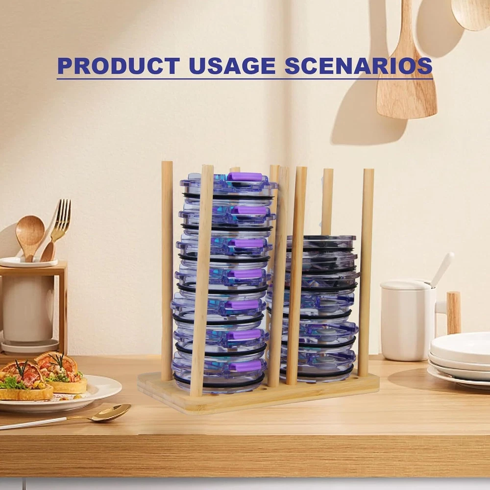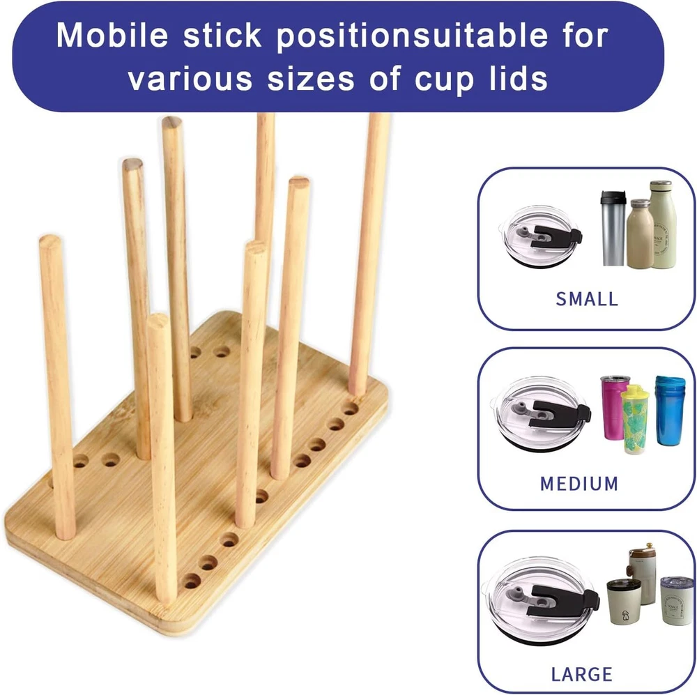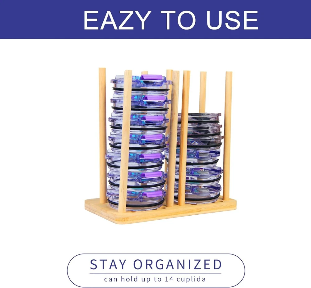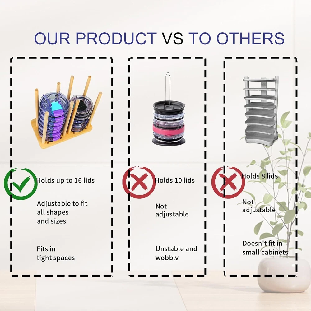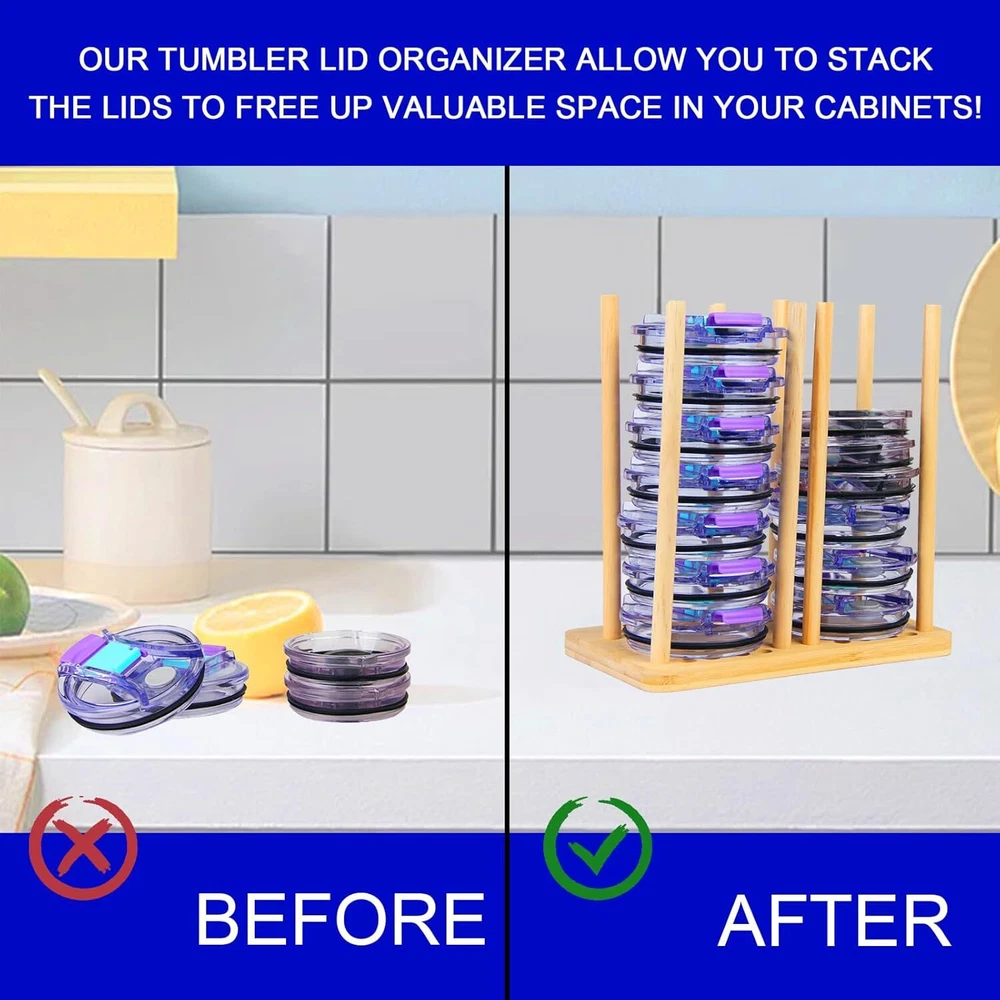 Adjustable Tumbler Lid Organizer - 9.13 x 5.13 x 7.3 inches, Bamboo Product Details Material: Bamboo Color: Bamboo Special Feature: Adjustable Tumbler Lid Organizer Number of Shelves: 1 Room Type: Kitchen Included Components: Holder Brand: VEEBELL Style: Casual Item Weight: 1.21 pounds Package Dimensions: 10.31 x 6.1 x 1.65 inches Size: 9.13 x 5.13 x 7.3 inches Special Features: Adjustable Tumbler Lid Organizer Batteries Included?: No Batteries Required?: No Material: Bamboo Color: Bamboo Special Feature: Adjustable Tumbler Lid Organizer Number of Shelves: 1 Room Type: Kitchen EASY HOME ORGANIZATION— Water bottle lid organizer let your kitchen say goodbye to the chaos of various cup lids and coffee cup lidsr. Enjoy a well-organized home where you can quickly find the lids you need, our cup lid organizer maximizes storage space and organizes your kitchen cabinets. HOLDS MULTIPLE LIDS — The largest coffee lid organizer on the market, this cup lid organizer measures 9 x 8.4 x 4.7 inches, making it the ideal solution for your kitchen cabinet organizing needs. It fits lids of all shapes and sizes, regardless of size. Including lids from YETI, RTIC, Hydro Flask, Stanley, Starbucks, and other brands. LID ORGANIZER IS EASY TO INSTALL— Simply insert the rod and wire of the lid organizer holder into the round hole position of the base and adjust as needed. The glass lid organizer features a stylish vertical design that makes full use of every inch of space in your kitchen. PREMIUM QUALITY MATERIAL—Glass lid holder is made of bamboo to ensure safety, lightweight, not easy to deform and long service life, enjoy a well-organized kitchen and house storage space. EASY HOME ORGANIZATION: Water bottle lid organizer let your kitchen say goodbye to the chaos of various cup lids and coffee cup lidsr. Enjoy a well-organized home where you can quickly find the lids you need, our cup lid organizer maximizes storage space and organizes your kitchen cabinets. HOLDS MULTIPLE LIDS: The largest coffee lid organizer on the market, this cup lid organizer measures 9 x 8.4 x 4.7 inches, making it the ideal solution for your kitchen cabinet organizing needs. It fits lids of all shapes and sizes, regardless of size. Including lids from YETI, RTIC, Hydro Flask, Stanley, Starbucks, and other brands. LID ORGANIZER IS EASY TO INSTALL: Simply insert the rod and wire of the lid organizer holder into the round hole position of the base and adjust as needed. The glass lid organizer features a stylish vertical design that makes full use of every inch of space in your kitchen. PREMIUM QUALITY MATERIAL:Glass lid holder is made of bamboo to ensure safety, lightweight, not easy to deform and long service life, enjoy a well-organized kitchen and house storage space.