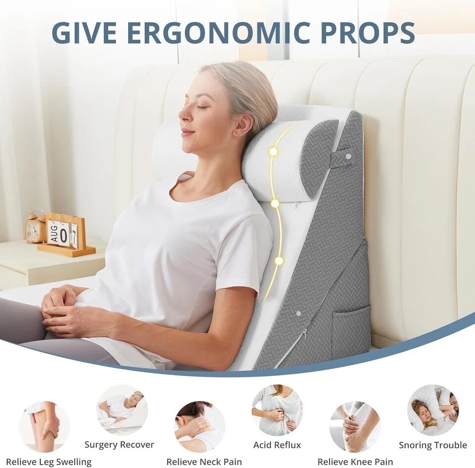 Sasttie Wedge Pillow for Headboard, Adjustable Bed Wedge Pillow Set with Orthope Item Description: 10-in-1 Design: The wedge pillow boasts a 10-in-1 design with adjustable heights to support your body in all positions. The bed wedge pillow also comes with a detachable bolster pillow for extra support wherever you need it Premium Material: Featuring a slow-rebound top layer and a high-density base, our wedge pillow conforms to your body's curves for enhanced comfort while maintaining its shape and durability. Certified by OEKO-TEX for safety, it ensures a healthier sleep experience Health Benefits: Our wedge pillow for sleeping helps reduce acid reflux, snoring, and heartburn through improved breathing and circulation. The triangle pillow wedge also helps ease back, neck, and leg discomfort, ideal for post-surgery recovery All in Details: The bed wedge cover is made of breathable air layer fabric, giving it a breathable and cozy feel. Designed with an L-shaped zip closure, the cover can be removed for washing easily. Handy pockets are designed for quick storage and access About SASTTIE: We are dedicated to enhancing your comfort and health with thoughtfully designed wedge pillows. Our products provide personalized support, and promote better posture and relaxation, helping you create a healthier and more restful lifestyle Fressnish Tips: If you notice a slight odor when you first unpack your wedge pillow, please do not worry. Just let it breathe for 24-48 hours in a well-ventilated area, and the smell will fade away, leaving you with a fresh and comfy pillow Sasttie Wedge Pillow for Headboard, Adjustable Bed Wedge Pillow Set with Orthope