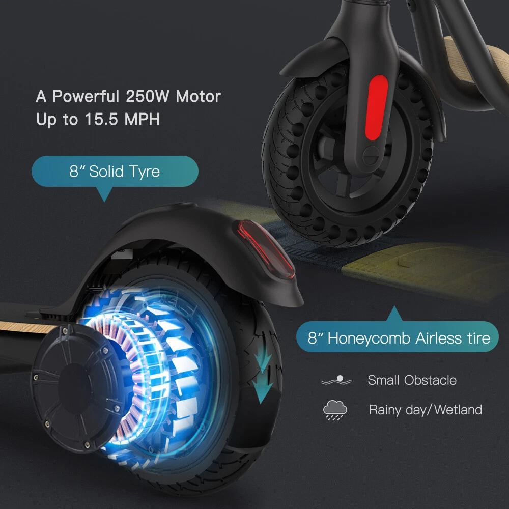 Main features: LONG RANGE BATTERY LIFE - Powerful 250W motor and 5.2 Ah/36V lithium battery pack that supports a speed of up to 15.5 Mph with a range up to 7 Miles. Updated large-capacity battery life, designed for commuters and longer distances. 8.0" HONEYCOMB & SOLID TIRES - Shock-absorbing rubber tires offer a smooth ride even over bumpy surfaces. PORTABLE FOLDING DESIGN - Electric scooter can be folded easily in 3 seconds with quick folding latch for easy carrying and storage. BATTERY INDICATOR AND LIGHTS - Battery indicator keeps to track battery life. Ultra bright LED headlight and taillight. Fast recharging about 5 hours. GEAR SHIFT SETTING - 1st gear for a 7.5 Mph comfortable ride or 3rd gear to get the 15.5 Mph fast experience. Extremely fun to ride and end boring commutes. Specification: Brand: Megawheels Model: S10 Dimension: Unfolding 105 x 43 x 118 cm; Folding: 105 x 43 x 48 cm Net Weight: 11.9kg Color: Black Frame Material: Aluminium Tires: 8.0" Honeycomb Front Tire & Solid Rear Tire Max Load: 100kg Max speed: 25KM/h Speed level: Gear 1--Max 10km/h ; Gear 2--Max 20km/h; Gear 3--Max 25km/h Mileage: 8-12km Grade Ability: 20 degree slope Working Temperature: -15°C-50°C Storage Temperature: -20°C-25°C Mode Type of Motor: Brushless hub motor Battery Type: High quality lithium battery Battery Capacitiy: 5.2 Ah Battery Voltage: 36V Charger Input Voltage: 100V-240V Charger Frequent: 50Hz/60Hz Charging time: 4 hours Package Contents: 1 * Folding Electric Scooter 1 * Battery Charger 1 * User's Manual Riding Skills: -Put your foot in the front of the scooter and the other foot on the floor before riding. -Make sure that the riding route is smooth. -Slide forward with the food standing on the floor before starting (like riding the scooter without power). -Immediately press the acceleration button and lean forward to avoid falling over backward due to inertia, so that the electric scooter will enter the working status. -Avoid pressing the handle with your body in the acceleration and deceleration process. Put one foot ahead and the other behind (like on the sliding plate/surfboard, put one foot ahead and the other behind by 70-90 for better comfort). -Turning – The turning principle of the electric scooter is the same with that of surfboard/sliding plate/skis. The handle shall be balanced with the body. Observe and make sure that turning is safe before turning. Tips: Before riding the scooter, please put one foot on the scooter deck and the other foot on floor and push the scooter forward by kicking the floor for some distance, in this way, the scooter will get some impulse to run forward. Note: This products have been certified under UL2272 safety standards.