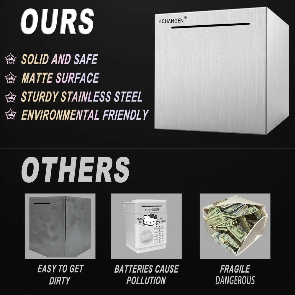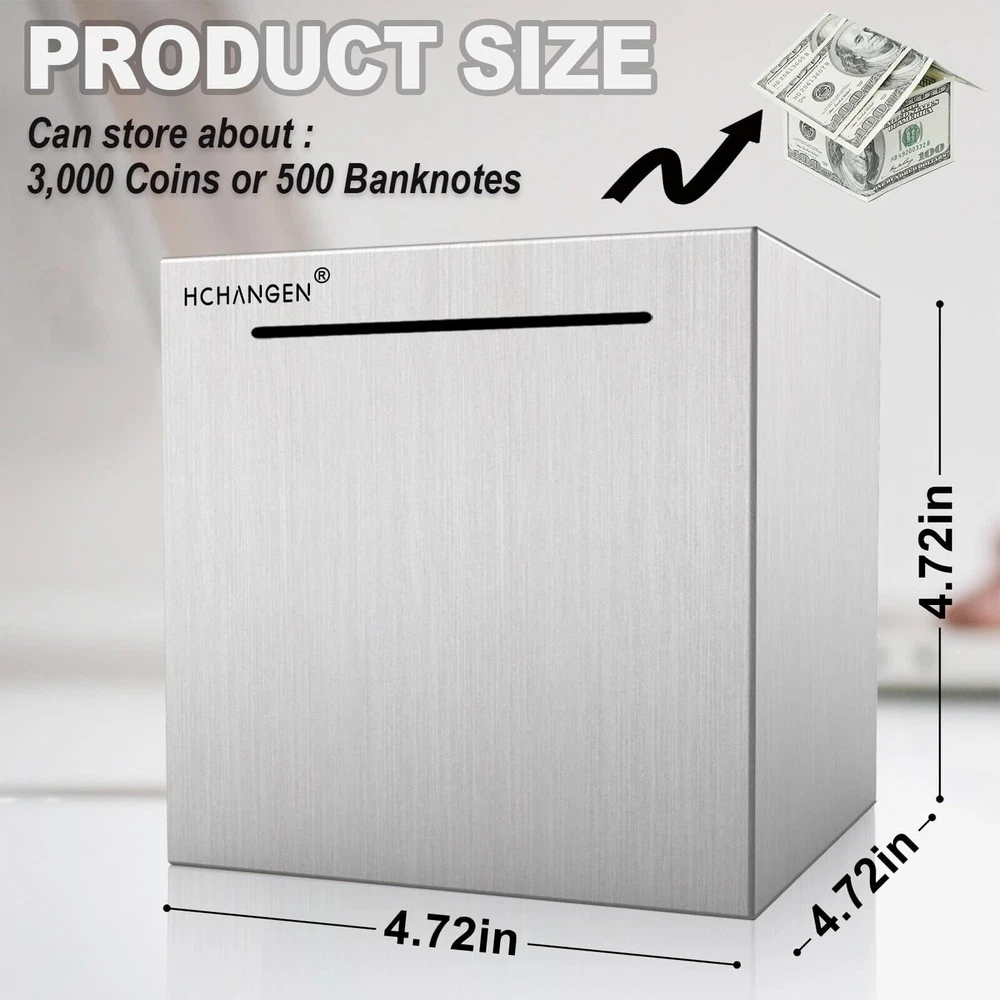 Unbreakable design: Made from high-quality stainless steel, this Metal Money Bank is virtually unbreakable, ensuring that your savings are always safe and secure. Perfect as an Adults Piggy Bank Convenient size: Measuring 4.72 inches, this sleek and stylish Stainless Steel Piggy Bank is the perfect size for any desk or nightstand, making it easy to store your savings and keep them close at hand Must break-to-open feature: When you're ready to access your savings, simply break open the Metal Money Bank and enjoy the fruits of your labor. This unique feature makes it a must-have Stainless Steel Piggy Bank Suitable for all ages: Whether you're an adult looking to save for a special purchase or a child learning about the value of money, this Adults Piggy Bank is an excellent tool to help you stay on track. With its stylish design, this Metal Money Bank is perfect for everyone Great gifts idea: With its durable construction and sleek design, the HCHANGEN Piggy Bank for Adults makes for a thoughtful and practical gift for any occasion. This Stainless Steel Piggy Bank is the perfect gift for your loved ones