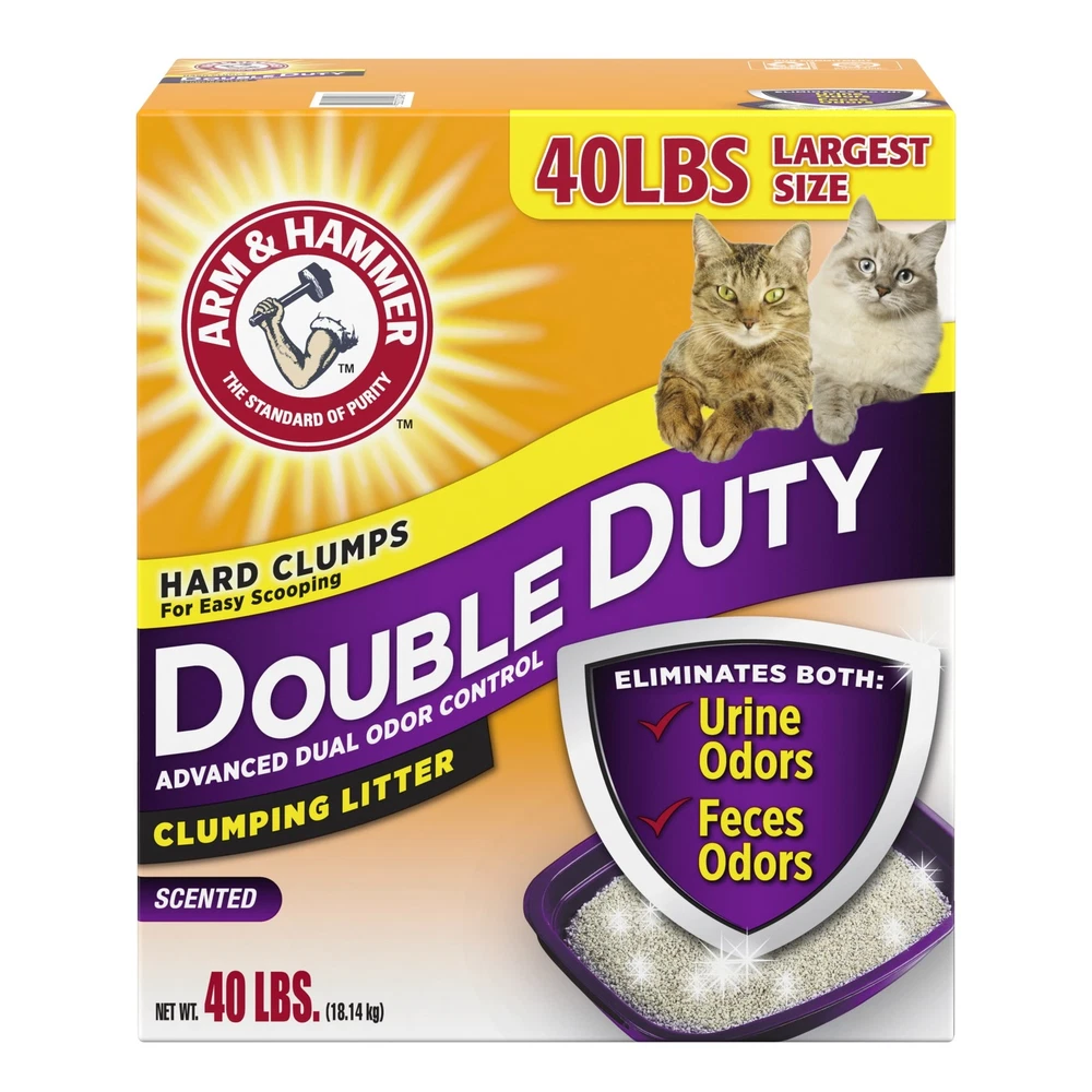 ARM & HAMMER™ Double Duty Clumping Litter eliminates both types of odors for Advanced Odor Control. Its breakthrough cat litter formula destroys urine and feces odors on contact, and helps keep your home smelling fresh and clean with a fresh scent. ARM & HAMMER cat litter is made with odor absorbing clay and ARM & HAMMER Baking Soda in every scoop to neutralize litter box odor. Rock-solid clumps let you remove the source of odors easily and fresh scent refreshed litter every time your cat uses the kitty litter box. And that’s why an odor-free home starts with ARM & HAMMER clumping cat litter. Plus, with low tracking and 99.9% dust-free formula pour ARM & HAMMER kitty litter from this 40 lb box with confidence. Double Duty Cat Litter destroys urine and feces odors instantly Odor control with powerful moisture activated baking soda crystals, eliminates odors on contact The Double Duty formula is 99.9% dust free and low tracking Kitty litter featuring an easy pour and no-spill spout for less mess Fresh scent refreshes litter every time your cat uses the litter box ARM & HAMMER Double Duty scented clumping litter 40 lb box