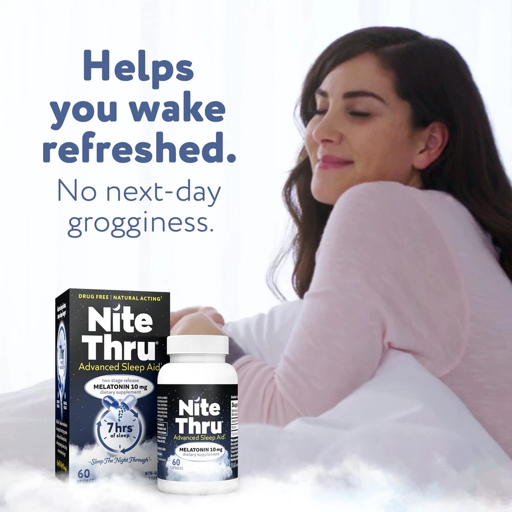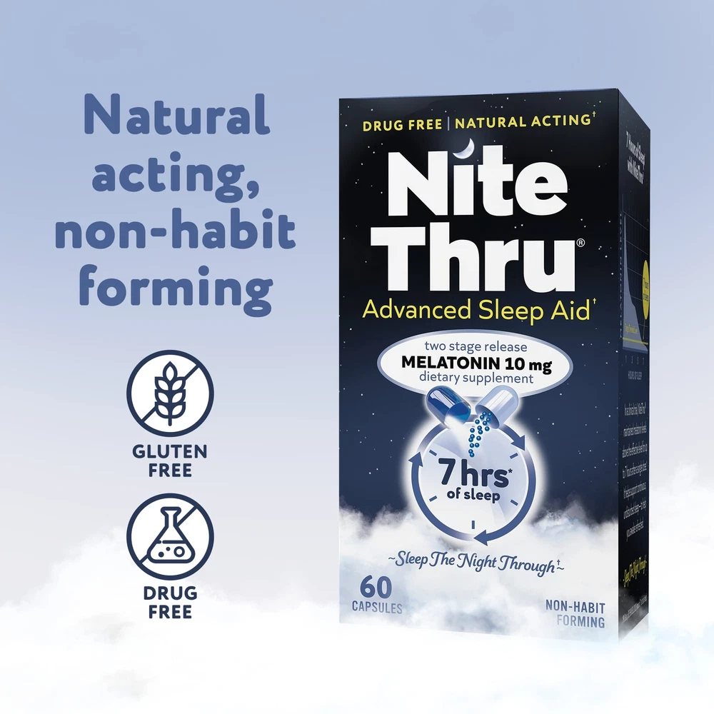 Sleep is an essential requirement for a healthy body. However, a lot of people do not get adequate sleep due to various reasons and hence resort to sleep-aids. Most sleep-aids are either not optimally effective or are drug-based and hence habit-forming. NiteThru Advanced Sleep Aid is a new and unique naturally-acting 10mg melatonin product that helps you get to sleep faster and stay asleep longer. This is a non-habit-forming product. NiteThru uses a unique dual-acting melatonin release technology. It releases 5mg of melatonin powder immediately on use which puts you to sleep fast. Another 5mg, which is stored in the form of tiny beads inside the capsule then gets released gently over time which keeps you asleep longer. This ensures that you don't keep waking up during the night as the sleep-aid's effect has worn off after a while but only wake up in the morning, truly refreshed. NiteThru has a beautiful half lavender colored and half transparent capsule shell that allows you to see the melatonin powder and beads so you are assured of the veracity of the contents. It is produced to the highest quality standards. NiteThru is a new and unique naturally-acting, non-habit forming dual-release 10mg melatonin product that gets you to sleep faster and keeps you asleep longer. Natural Acting Sleep Aid: Formulated with 10mg of non-habit forming melatonin to help support restful sleep, NiteThru naturally assists occasional sleeplessness Dual Stage Release: NiteThru features a dual stage release formula with a quick-release melatonin powder to help you fall asleep and slow-release melatonin beads to help you stay asleep Rest Easy: NiteThru Advanced Sleep Aid can help you fall asleep and stay asleep without unwanted side effects. The Rest You Need: Many people find they prefer melatonin supplements to OTC sleeping pills that use antihistamines, which can throw off the body's natural rhythm. Melatonin Sleep Aid: NiteThru supplements your body's own naturally-occurring melatonin, helps with restful sleep; It's a safe, effective way to get the rest you need.