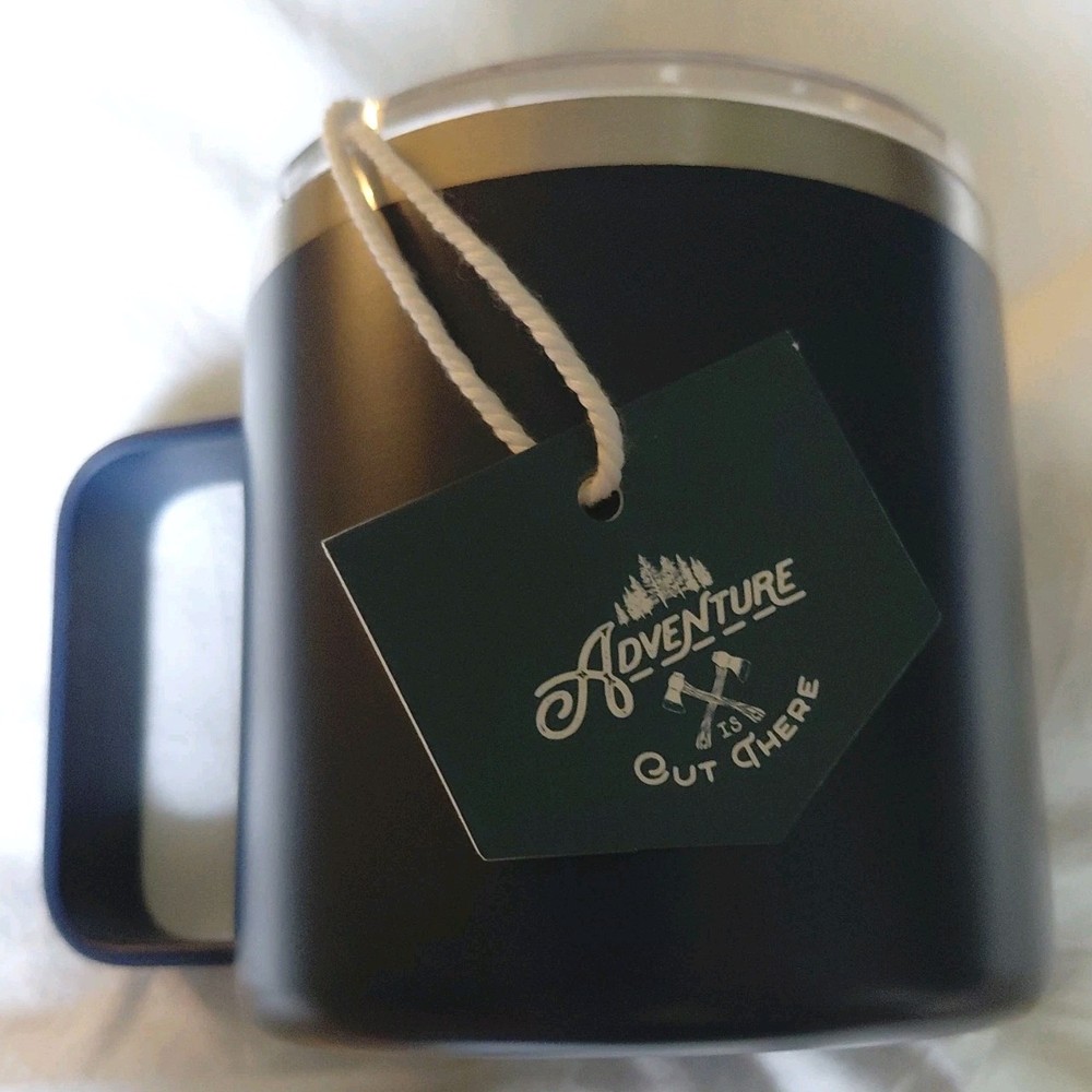 Adventure Is Out There insulated coffee mug with spill-free lid is a stainless steel mug with clear plastic slide lock lid. It is designed for hot or cold beverages and has a capacity of 12 oz and is perfect for adults on the go. Its insulated design keeps your drink at the desired temperature. NEW W/TAG. SEE PICTURES FOR EXACT ITEM.