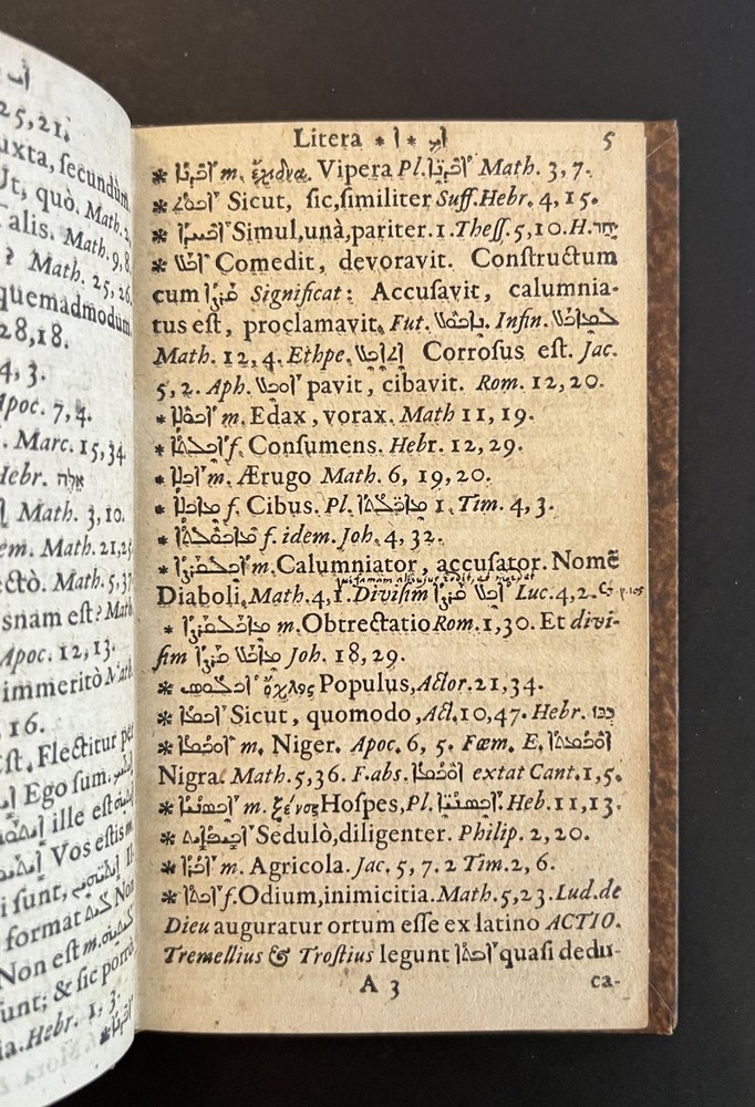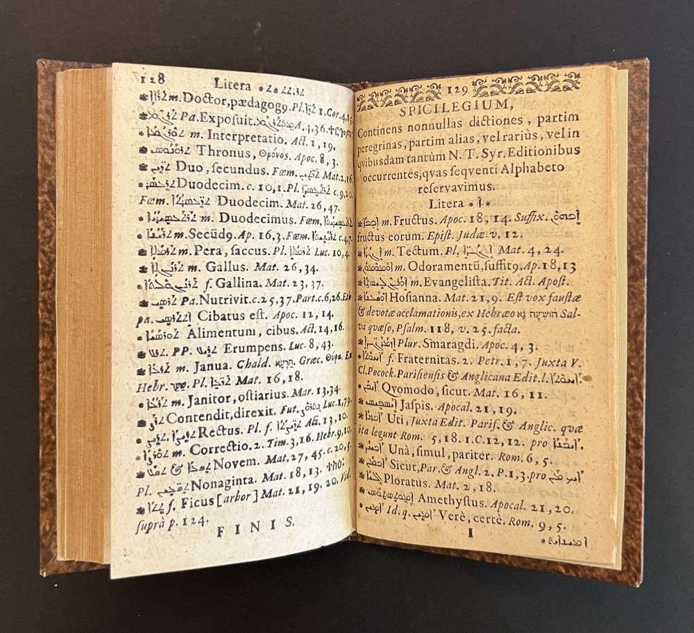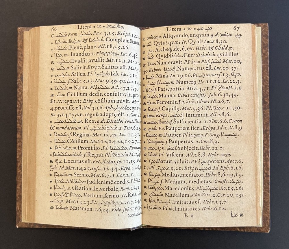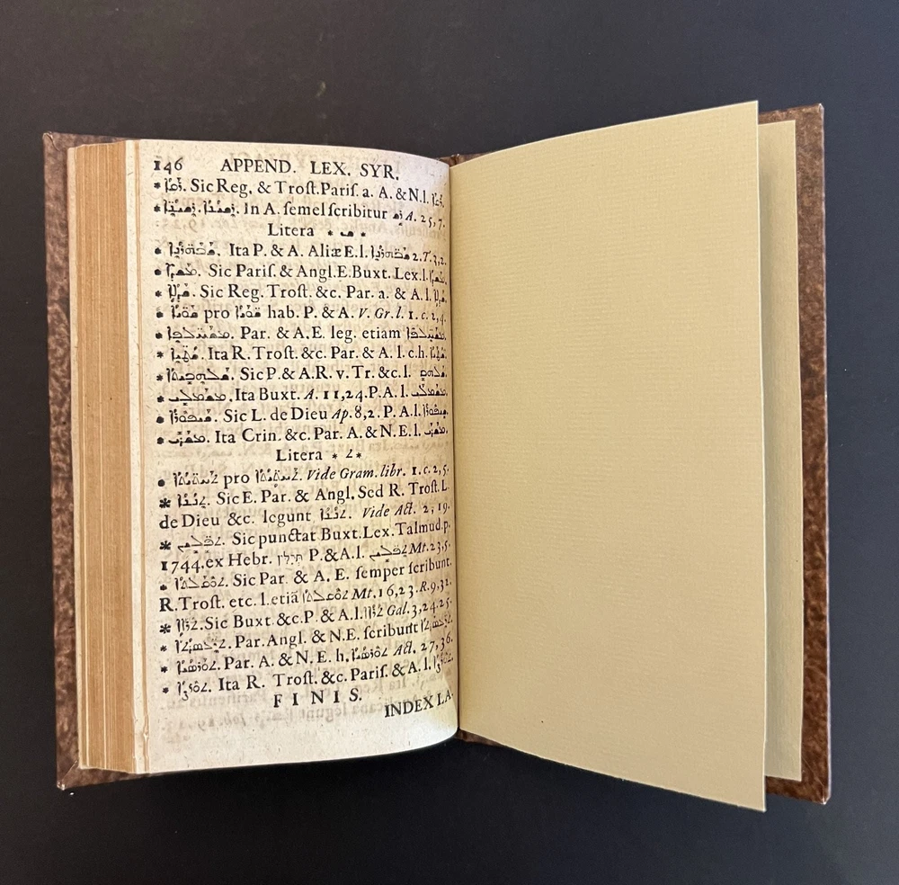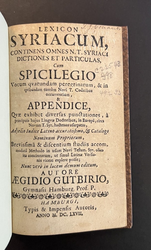 Lexicon Syriacum, Continens omnes N. T. Syriaci Ditiones et Particula, cum Spicilegio vocum Quarundam Peregrinarum, & in Quibusdam Tantum Novi T. Codicibus Occurrentium, & Appendice Author: Gutbier, Aegidius Title: Lexicon Syriacum, Continens omnes N. T. Syriaci Ditiones et Particula, cum Spicilegio vocum Quarundam Peregrinarum, & in Quibusdam Tantum Novi T. Codicibus Occurrentium, & Appendice Publication: Hamburg: Typis & Impensis Autoris, 1667 Description: Hard Cover. Good binding. Small octavo. [8], 146 pp. In a modern marbled paper-over boards binding with a morocco title label. Ex-library with a faint blindstamp on the title page and some penciled numbers to the same leaf; contents lightly toned. A reasonably nice copy of an interesting Syriac lexicon. Seller ID: 10193 Subject: Rare Book Room, Religion Michael Pyron, Bookseller, ABAA/ILAB I have been a bookseller and bookbinder for nearly two decades. I offer a general stock with an emphasis in private press and illustrated books, as well as literature and Americana. I take pride in my high level of customer service; if you aren't satisfied with either the book or the service you've received, please let me know about it so I can make it right. Terms All order are shipped with 1 business day upon receipt of payment. The standard shipping method is USPS Media Mail but Priority Mail or UPS shipping is available. Please inquire before payment if you'd like the invoice adjusted to account for a different shipping method. I will accept returns for any reason within 30 days so long as the book or item is returned in the same condition in which it was sent. This listing was created by Bibliopolis.