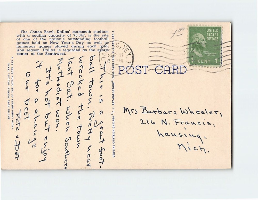 Postcard with image Aerial View Cotton Bowl Dallas Texas USA H-15461 Postcards from various collections, many used with visible wear. See pictures for condition. Scans show the actual card; minor scanner lines may appear but are not on the card. Verify your invoice before paying. If shipping charges are incorrect, email me for assistance. We ship daily via USPS from a rural area, which may cause slight delivery delays. U.S. orders use eBay Standard Envelope with limited tracking. International orders use stamped mail without tracking. Items ship the next business day. Delivery times may vary during peak seasons.