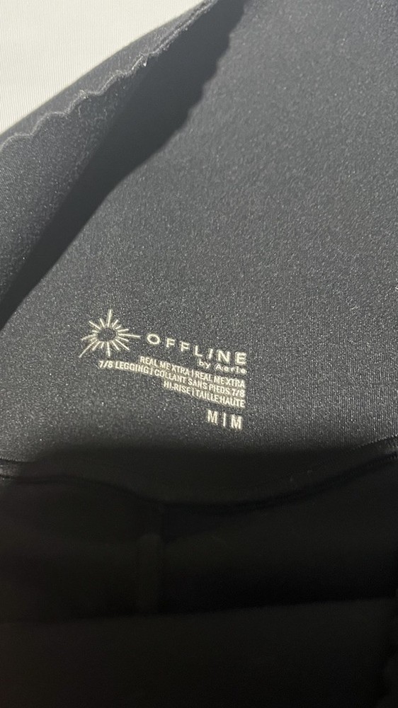 Elevate your at-home wardrobe with the Aerie Offline high-waisted leggings, tailored for a comfortable yet stylish fit. These black leggings come in a size medium, featuring a flattering high-rise design and delicate scalloped accents at the hem for a touch of elegance. Crafted for the modern woman, these leggings are a versatile addition to your clothing collection, easily transitioning from a cozy day in to a casual outing. With their quality construction and sleek look, they're an essential piece for those who value both comfort and style in their daily ensemble.