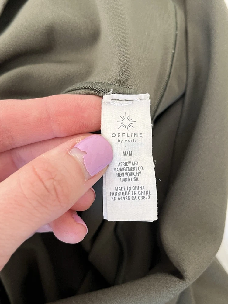 Brand: Offline By Aerie Type: Women’s Real Me 7/8 High Waisted Leggings Style # 0491-5089 Size: Medium (US Size 8-10) Waist: 28.5-29.5” Hip: 38-39” Inseam: 25” Color: Olive Daze (317) Fit: High Waisted; 7/8 Length; Hits just above the ankle At a Glance: Light Support, Lightweight Fabric, Buttery Soft, 4-way stretch, Breathable, Fast Drying Materials: 88% Nylon, 12% Elastane Machine Washable; Imported Condition: Excellent pre-owned condition. Minimal signs of usual wear. No rips, holes, stains, discoloration, loose threads or pilling. All seams are solid. Please review images for details.