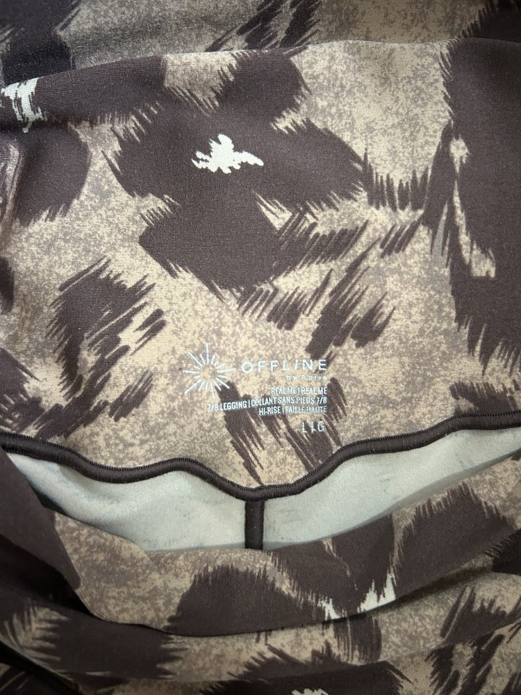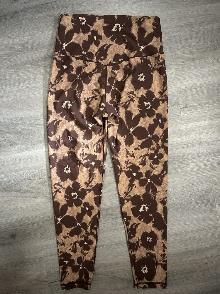 Very light signs of wear! Lightly worn leggings. Perfect for workouts. The Aerie Offline Real Me High-Waisted 7/8 Leggings in brown floral, size Large, are a versatile and stylish addition to any athleisure wardrobe. Made from a blend of nylon and spandex, these leggings offer a comfortable stretch fit perfect for activities like gym training, yoga, and walking. The high-rise waist provides a flattering silhouette, while the ankle length adds a trendy touch. Suitable for all seasons, these leggings are machine washable and feature a logo accent for a touch of branding. Ideal for travel, activewear, or casual occasions, these leggings combine fashion and function effortlessly.