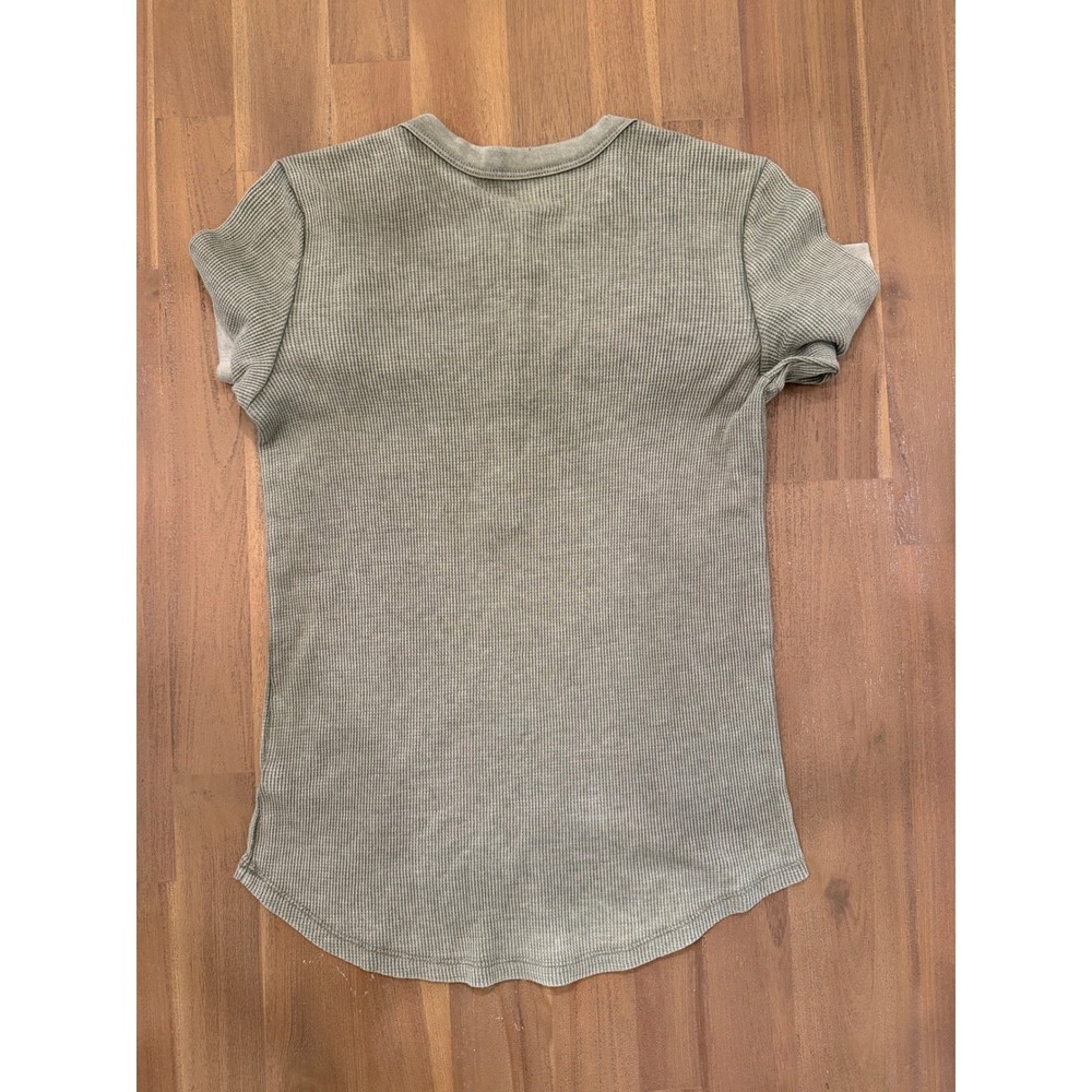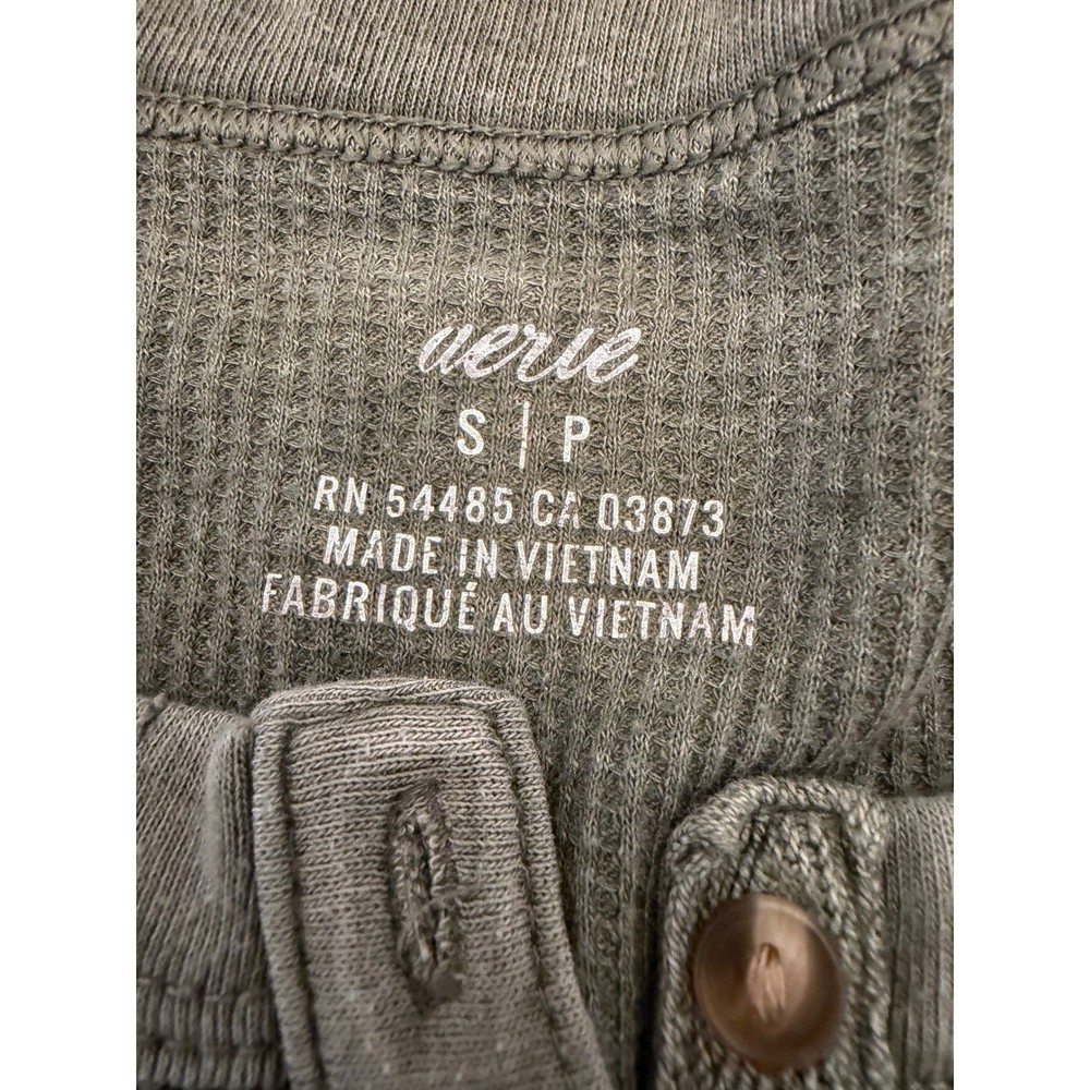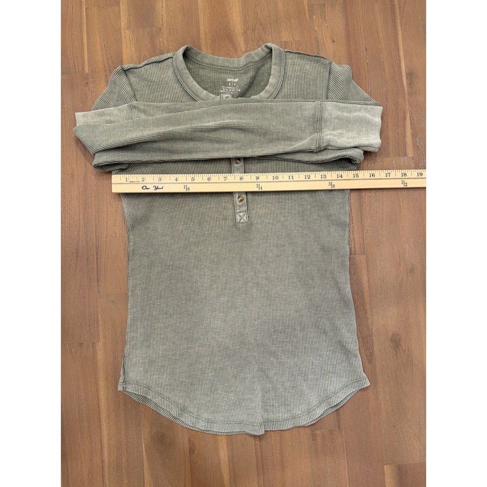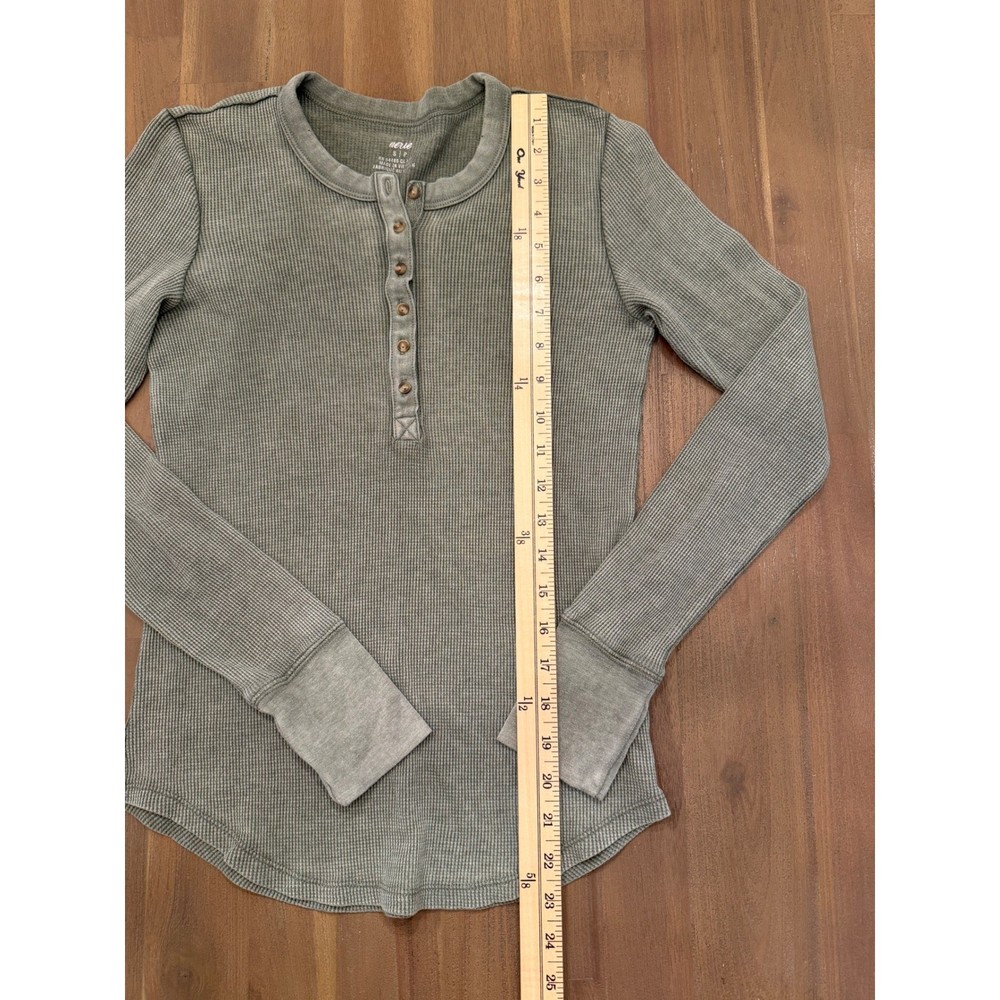 Aerie long sleeve henley top in a muted sage green or olive drab color. This thermal shirt features a classic waffle knit texture, a multi-button placket, and a curved hemline. Designed with a slim fit and extended cuffs, it provides a cozy, layered look perfect for casual wear or lounging. Note that there are some minor pinholes near the neckline as shown in the detail photos. Measurements: • Pit to Pit: 14.5" (29" doubled) • Length: 23"