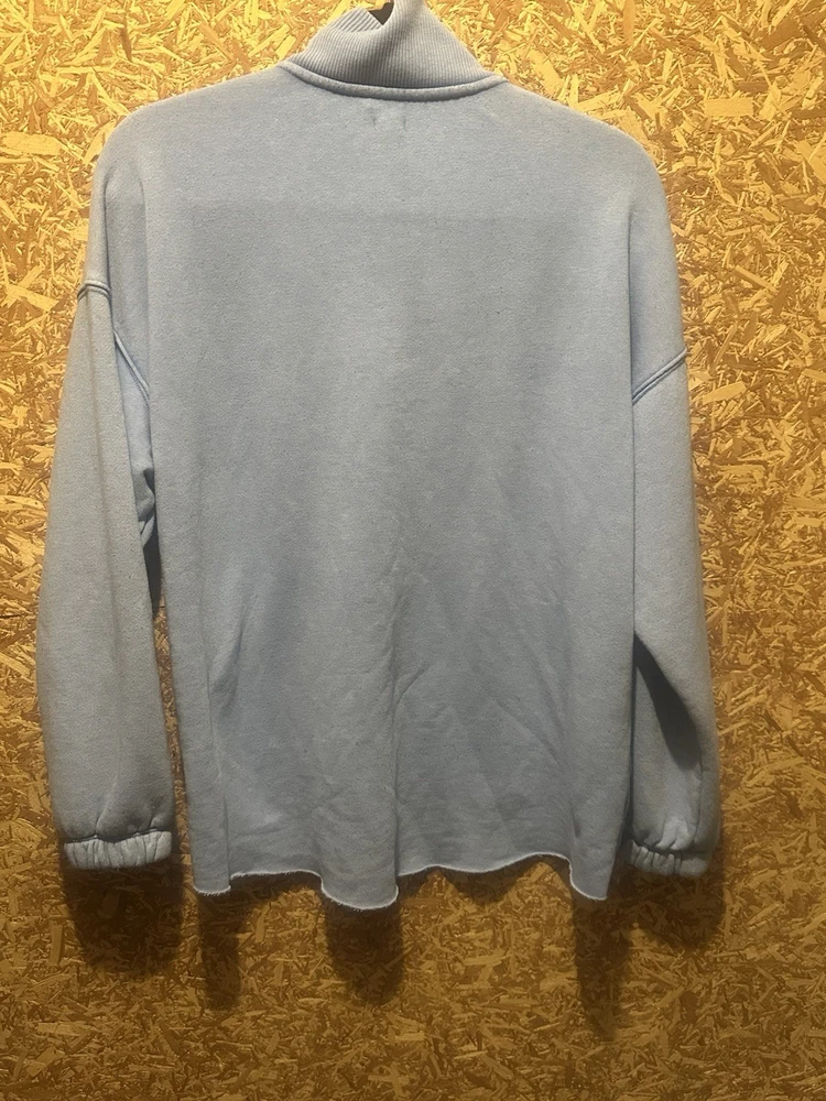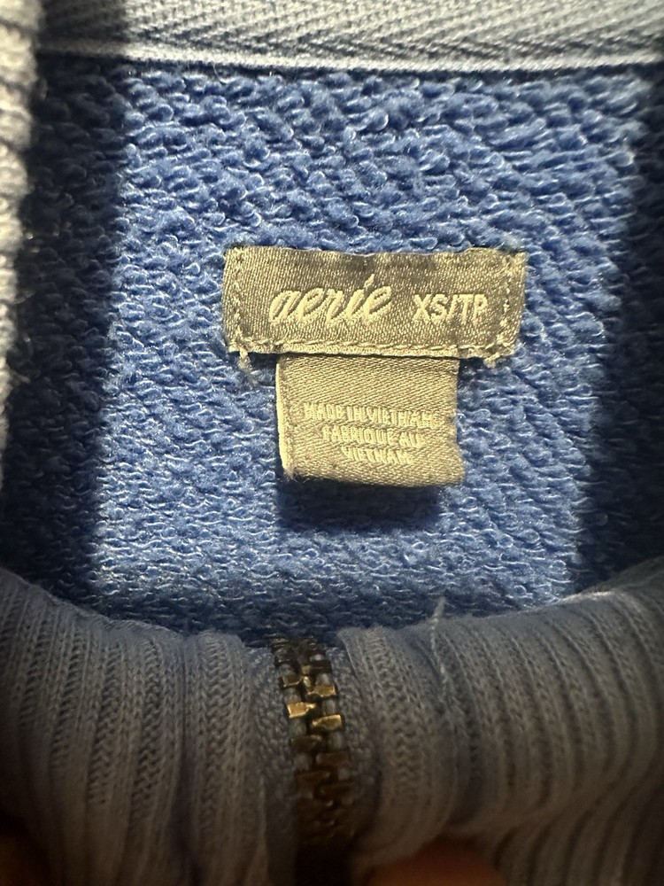 The Aerie Women's Oversized Blue Sweatshirt in size XS is a stylish activewear piece perfect for casual occasions. Made from a comfortable cotton blend knit fabric, this pullover sweatshirt features a solid blue color with a mock neck and zipper accents. The oversized fit and long sleeves make it ideal for walking and other low-intensity activities, adding a touch of beach and classic themes to your wardrobe. Perfect for women who love a laid-back yet trendy look. Preowned Good Condition