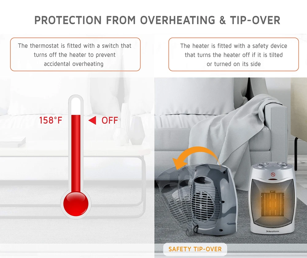The perfect ceramic space heater for the home or office ✔ COMPACT: ( 11" tall x 7" wide x 5" deep) ✔ Lightweight 3.5 Lb – Portable and Easy to Move From Room to Room ✔ Easy to Operate: 3-Function Dial (1500W, 750W or Fan) ✔ Adjustable Thermostat Adjustable Thermostat, Quiet Fan Motor. ✔ SAFE: ETL Certified for Indoor Use with overheat tip-over protection ✔ EASY TO POSITION: a convenient carry handle and6-foot Long Electric Cord ✔ GUARANTEED – Purchase With Confidence: The AeroHome Ceramic Space Heater is backed by our Money Back Guarantee
