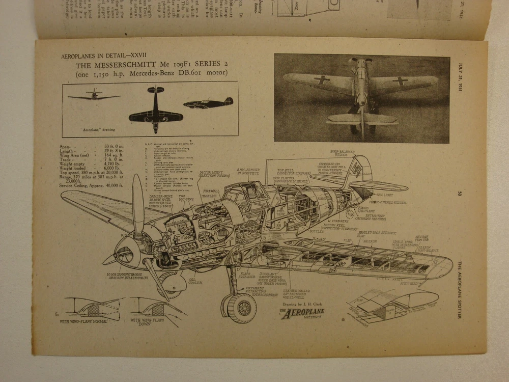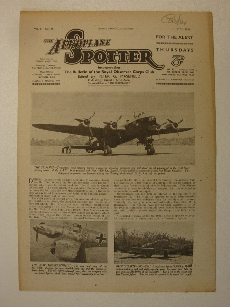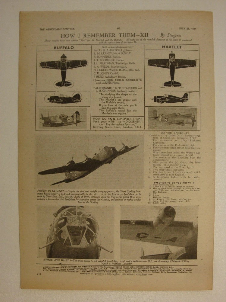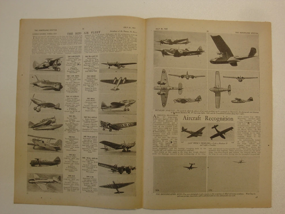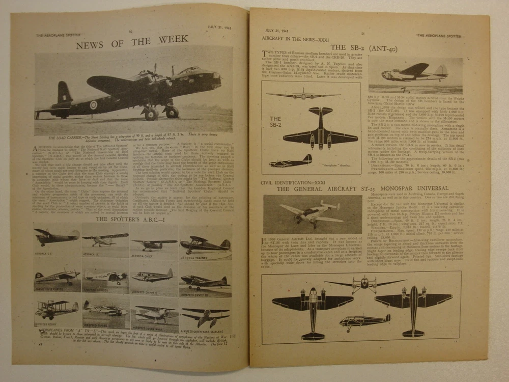 Please Read Item Description AEROPLANE SPOTTER Incorporating THE BULLETIN OF THE OBSERVER CORPS CLUB July 31, 1941 Volume 2 No. 31 Contents: Cover page - Short Stirling bomber of the RAF News of the Week - Short Stirling , The Spotter's ABC: 1 - Aeroplanes from A-Z Aircraft in the News - The Tupolev Ant-40 [SB-2] Civil Identification - The General Aircraft ST-25 Monospar Universal A Home-Made Epidiascope Aeroplanes in Detail - The Messerschmitt Me 109F1 Series 2, 3-view silhouette, photograph and large cutaway drawing with key points identified Lesser Known Types - The Red Air Fleet Aircraft Recognition - The Bristol Blenheim Mk. IV, Consolidated Catalina flying boat The Observer Corps Club Bulletin Aircraft Comparison - Consolidated Model 28-5 Catalina, Consolidated Model 29 Coronado, Consolidated Model 31 Corregidor, Consolidated Model 32 Liberator II Correspondence How I Remember Them - Brewster Buffalo, Grumman Martlet Pages 12 (30.5cm x 20.5cm) 'The Aeroplane Spotter' ran from January 2, 1941 through the war years; initially as a weekly periodical and then later every alternate week. In line with other publications of the period it was produced under 'wartime economy standards', that is poor, thin paper - prone to foxing and rapid age-related discolouration (yellowing). No staples were used, the pages were simply folded - at least this prevented the rust staining associated with other similar publications of the time caused by the poor quality thin wire staples used. Initially 8 pages of information, within a few months (May) this was extended to 12 pages where it remained until it ceased publication in this format during 1948. Please note, these are original publications (not reprints or photocopies) and due to the age and quality of materials available these publications display varying degrees of wear - see item description and photographs. AEROPLANE SPOTTER At the start of the Second World War, the subject of aircraft recognition had a very low priority among the British armed forces with the exception of the Army Anti-Aircraft Command. It was also a topic that was outside the brief of the Observer Corps whose duties were limited to the reporting of aircraft as "Friendly Fighters", "Bombers", "Hostile" or "Unidentified. However many members of the Observer Corps did take an active interest in the subject of aircraft recognition. The only aids issued to assist with aircraft recognition were the Air Ministry Publications AP.1480, official silhouettes of aircraft, and AP.1764, Aircraft Recognition. The low priority afforded to the topic was highlighted as early as September 6, 1939 when a friendly fire incident resulted in the death of a British fighter pilot and the loss of two Hawker Hurricanes. Other friendly fire incidents and the paucity of material on the subject of aircraft recognition led to the formation of an Aircraft Recognition Wing within the Army Anti-Aircraft Command. On a very limited budget the first course started at RAF Biggin Hill in February 1940 training 36 officers and men in the subject of aircraft recognition. The topic also started to come to the attention of the Inter-Service Recognition Committee that had been formed in 1939 to deal mainly with air-to-ground and air-to-sea signalling to indicate friendly status and by the end of 1940 all three services realised that more work was needed to improve aircraft recognition. Concurrently, there were a number of developments taking place outside the armed services. In December 1939 a group of Observer Corps volunteers in Guildford organised a meeting to discuss improving aircraft recognition, the meeting became known as the "Hearkers' Club School of Instruction" and the first lecture was delivered by Peter Masefield, technical editor of 'The Aeroplane' magazine. Masefield was to play a leading role in the launch and direction taken by Aircraft Recognition. The first Hearkers' Club was such a success that others followed and by Spring 1940 there were nine branches and a supporting publication - The Hearkers' Club Bulletin. Throughout the rest of 1940 Masefield campaigned for a separate publication dedicated to aircraft recognition and on 2 January 1941, Temple Press, the publishers of 'The Aeroplane' launched 'The Aeroplane Spotter' edited by Masefield. It incorporated The Hearkers' Club Bulletin; changing to the Bulletin of the Observer Corps Club on February 6, 1941; then to the Bulletin of the Royal Observer Club on April 24, 1941. The Aeroplane Spotter remained an independent publication but received official backing when the Air Ministry and the War Office placed subscriptions for the magazine for all RAF stations and Anti-Aircraft Command units. As well as the armed forces and the Observer Corps there were a large number of civilian "Spotters Clubs" formed who also contributed information towards the air defence of Great Britain despite not receiving any official recognition. Please visit my eBay shop for Military History books, magazines, newspapers, documents and other ephemera. New stock added every week. Please Note: Some international eBay sites will only show a limited number of 'seller's other items'. To see a complete list of my shop and auction listings please copy and paste the following link to my eBay shop in your browser: https://www.ebay.co.uk/str/ett1954?_trksid=p2047675.l2563