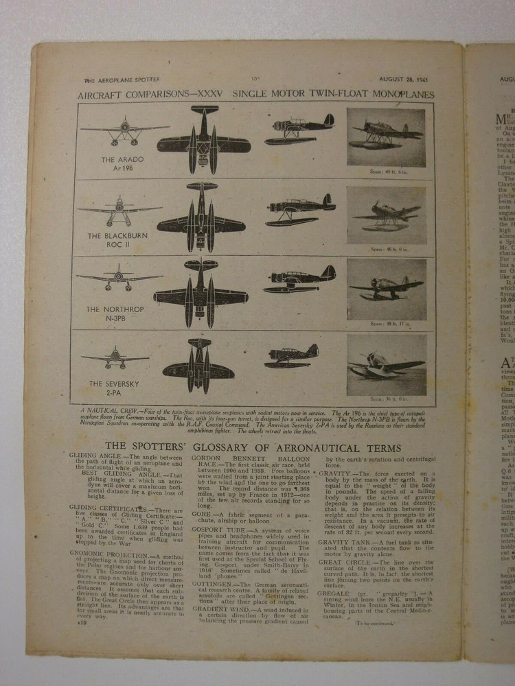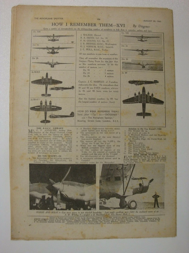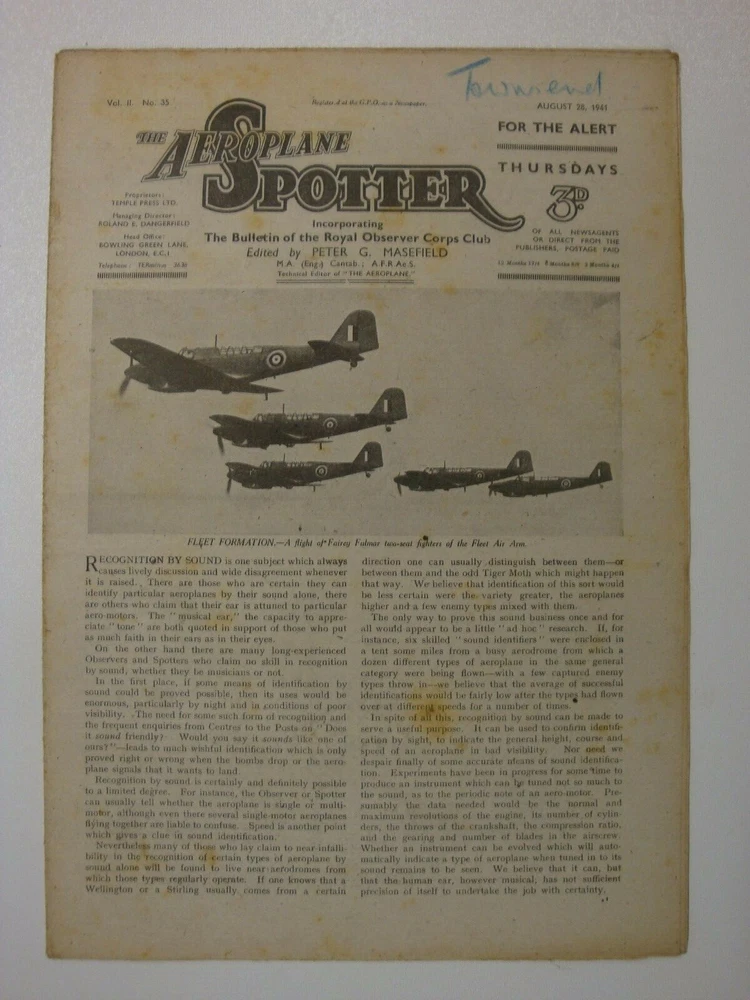 Please Read Item Description AEROPLANE SPOTTER Incorporating THE BULLETIN OF THE OBSERVER CORPS CLUB August 28, 1941 Volume 2 No. 35 Contents: Cover page - A flight of Fairey Fulmars of the Fleet Air Arm News of the Week - Military Design (continued) - bombers, The Spotter's ABC: 5 - Aeroplanes from A-Z Aircraft in the News - The Sopwith Camel F-1 Civil Identification - The Boeing 247-D The Fundamentals of raid spotting: 3 Aeroplanes in Detail - The De Havilland D.H.91 Albatross transport, 3-view silhouette, photograph and large cutaway drawing with key points identified Lesser Known Types - The Blackburn Shark Aircraft Recognition - Focke-Wulf Kurier [Condor] II, Short Stirling The Observer Corps Club Bulletin Aircraft Comparison - Arado Ar 196, Blackburn Roc II, Northrop N-3PB, Seversky 2-PA Correspondence How I Remember Them - Dornier Do. 18K, Dornier Do. 24, Dornier Do. 26, Junkers 86-K-2, Junkers Ju 88-A-1, Junkers Ju 89 Pages 12 (30.5cm x 20.5cm) 'The Aeroplane Spotter' ran from January 2, 1941 through the war years; initially as a weekly periodical and then later every alternate week. In line with other publications of the period it was produced under 'wartime economy standards', that is poor, thin paper - prone to foxing and rapid age-related discolouration (yellowing). No staples were used, the pages were simply folded - at least this prevented the rust staining associated with other similar publications of the time caused by the poor quality thin wire staples used. Initially 8 pages of information, within a few months (May) this was extended to 12 pages where it remained until it ceased publication in this format during 1948. Please note, these are original publications (not reprints or photocopies) and due to the age and quality of materials available these publications display varying degrees of wear - see item description and photographs. AEROPLANE SPOTTER At the start of the Second World War, the subject of aircraft recognition had a very low priority among the British armed forces with the exception of the Army Anti-Aircraft Command. It was also a topic that was outside the brief of the Observer Corps whose duties were limited to the reporting of aircraft as "Friendly Fighters", "Bombers", "Hostile" or "Unidentified. However many members of the Observer Corps did take an active interest in the subject of aircraft recognition. The only aids issued to assist with aircraft recognition were the Air Ministry Publications AP.1480, official silhouettes of aircraft, and AP.1764, Aircraft Recognition. The low priority afforded to the topic was highlighted as early as September 6, 1939 when a friendly fire incident resulted in the death of a British fighter pilot and the loss of two Hawker Hurricanes. Other friendly fire incidents and the paucity of material on the subject of aircraft recognition led to the formation of an Aircraft Recognition Wing within the Army Anti-Aircraft Command. On a very limited budget the first course started at RAF Biggin Hill in February 1940 training 36 officers and men in the subject of aircraft recognition. The topic also started to come to the attention of the Inter-Service Recognition Committee that had been formed in 1939 to deal mainly with air-to-ground and air-to-sea signalling to indicate friendly status and by the end of 1940 all three services realised that more work was needed to improve aircraft recognition. Concurrently, there were a number of developments taking place outside the armed services. In December 1939 a group of Observer Corps volunteers in Guildford organised a meeting to discuss improving aircraft recognition, the meeting became known as the "Hearkers' Club School of Instruction" and the first lecture was delivered by Peter Masefield, technical editor of 'The Aeroplane' magazine. Masefield was to play a leading role in the launch and direction taken by Aircraft Recognition. The first Hearkers' Club was such a success that others followed and by Spring 1940 there were nine branches and a supporting publication - The Hearkers' Club Bulletin. Throughout the rest of 1940 Masefield campaigned for a separate publication dedicated to aircraft recognition and on 2 January 1941, Temple Press, the publishers of 'The Aeroplane' launched 'The Aeroplane Spotter' edited by Masefield. It incorporated The Hearkers' Club Bulletin; changing to the Bulletin of the Observer Corps Club on February 6, 1941; then to the Bulletin of the Royal Observer Club on April 24, 1941. The Aeroplane Spotter remained an independent publication but received official backing when the Air Ministry and the War Office placed subscriptions for the magazine for all RAF stations and Anti-Aircraft Command units. As well as the armed forces and the Observer Corps there were a large number of civilian "Spotters Clubs" formed who also contributed information towards the air defence of Great Britain despite not receiving any official recognition. Please visit my eBay shop for Military History books, magazines, newspapers, documents and other ephemera. New stock added every week. Please Note: Some international eBay sites will only show a limited number of 'seller's other items'. To see a complete list of my shop and auction listings please copy and paste the following link to my eBay shop in your browser: https://www.ebay.co.uk/str/ett1954?_trksid=p2047675.l2563