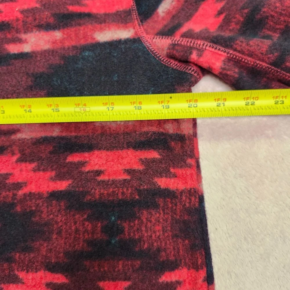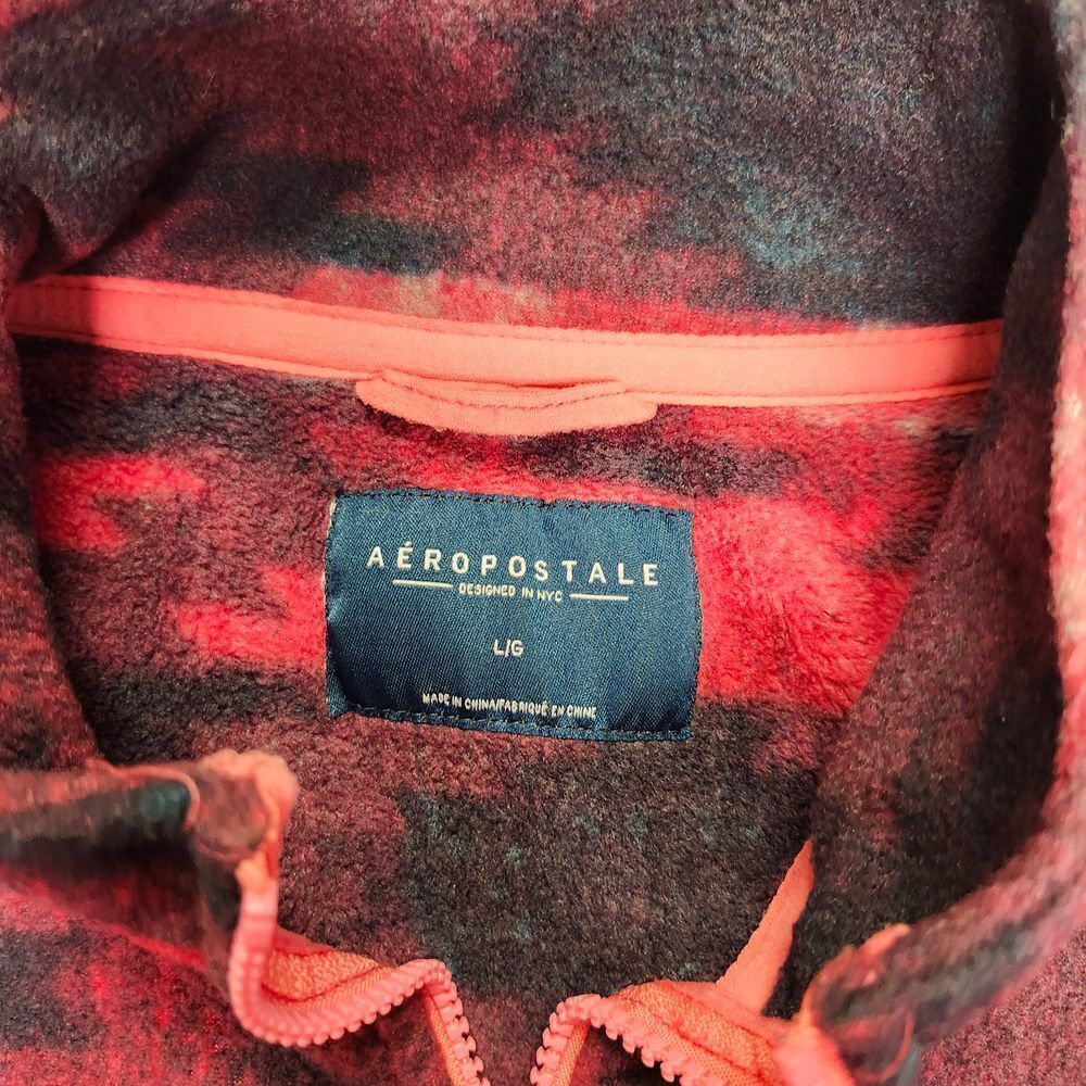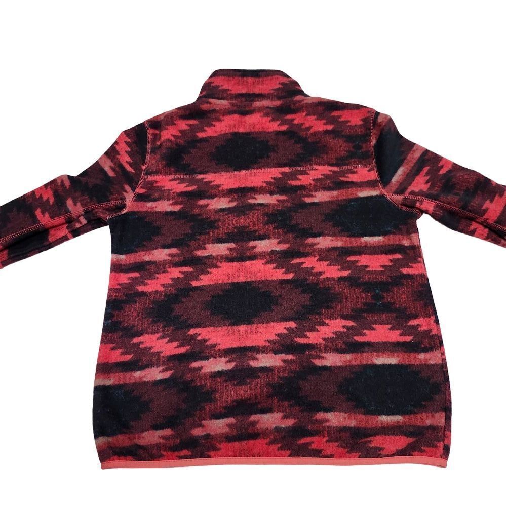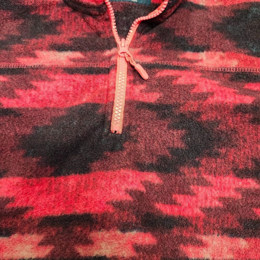 Cozy and stylish fleece pullover featuring a striking Aztec-inspired pattern in coral and black. Perfect for casual outings, weekend adventures, or lounging at home. The quarter-zip design offers versatile styling options, while the soft fleece material provides warmth and comfort. An ideal piece for layering during cool weather or wearing as a statement piece. Style: Pullover Color: Red Department: Women Type: Sweatshirt Closure: Zip Features: 1/4 Zip, Graphic Print Fabric Type: Fleece Material: 100% Polyester Character Family: Aeropostale Pattern: Geometric Accents: Zipper Sleeve Length: Long Sleeve Neckline: Mock Neck Keywords: quarter zip, aztec print, fleece pullover, coral, black, geometric pattern, winter wear, casual, cozy, southwestern, tribal print, aeropostale fleece