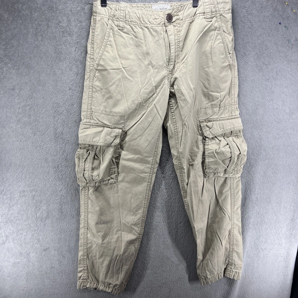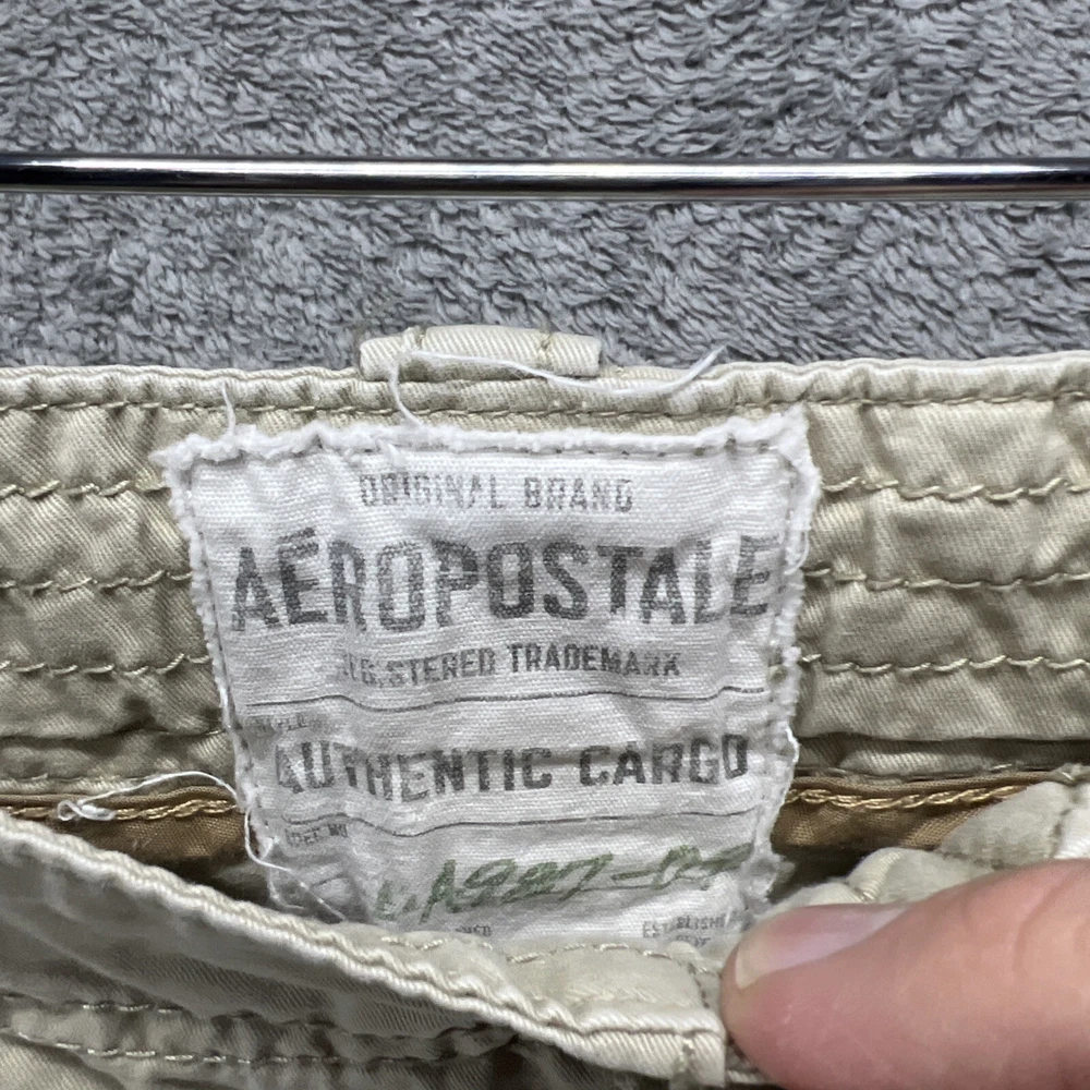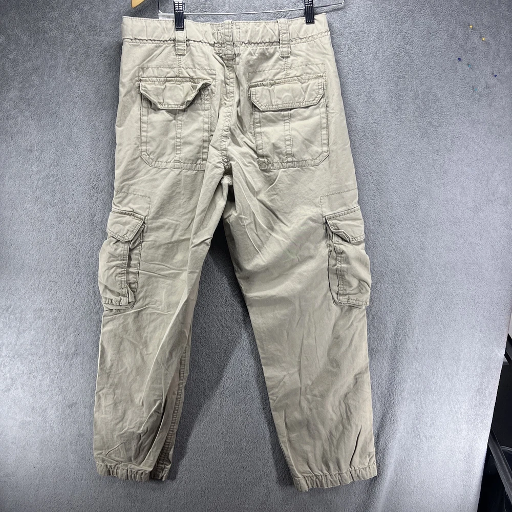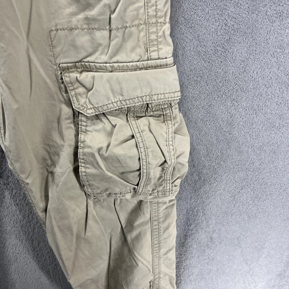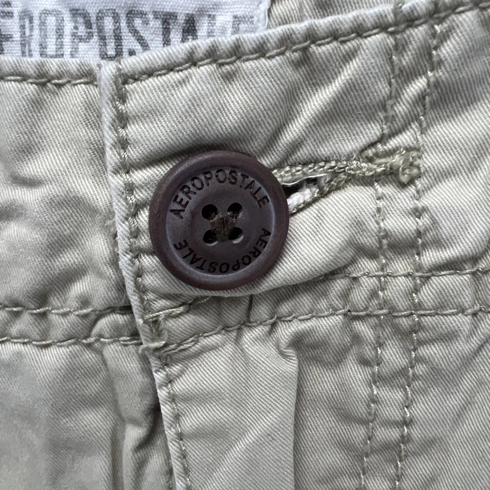 These are vintage Aeropostale cargo pants for men in size 30x32. They are made of beige canvas fabric with a relaxed fit and straight leg style. The pants feature a zip closure, button accents, logo detailing, and multiple pockets. Suitable for casual or workwear occasions, they have a mid-rise waist and are easy care, machine washable. Perfect for the modern, American man with a classic style.