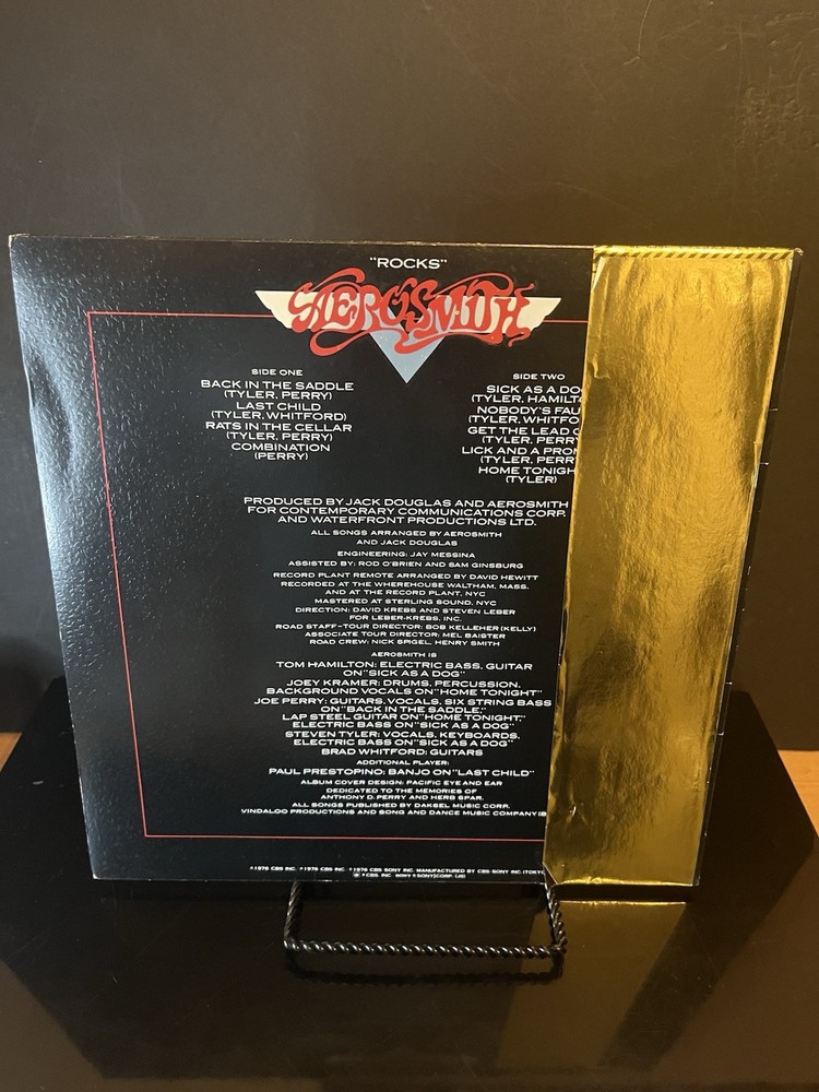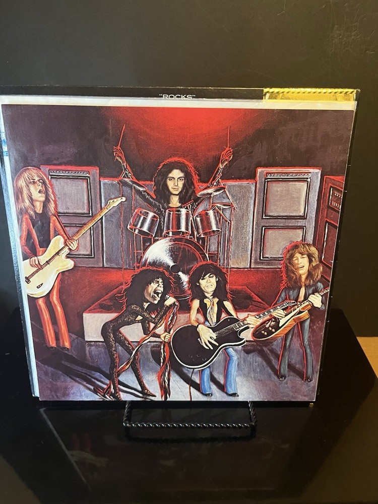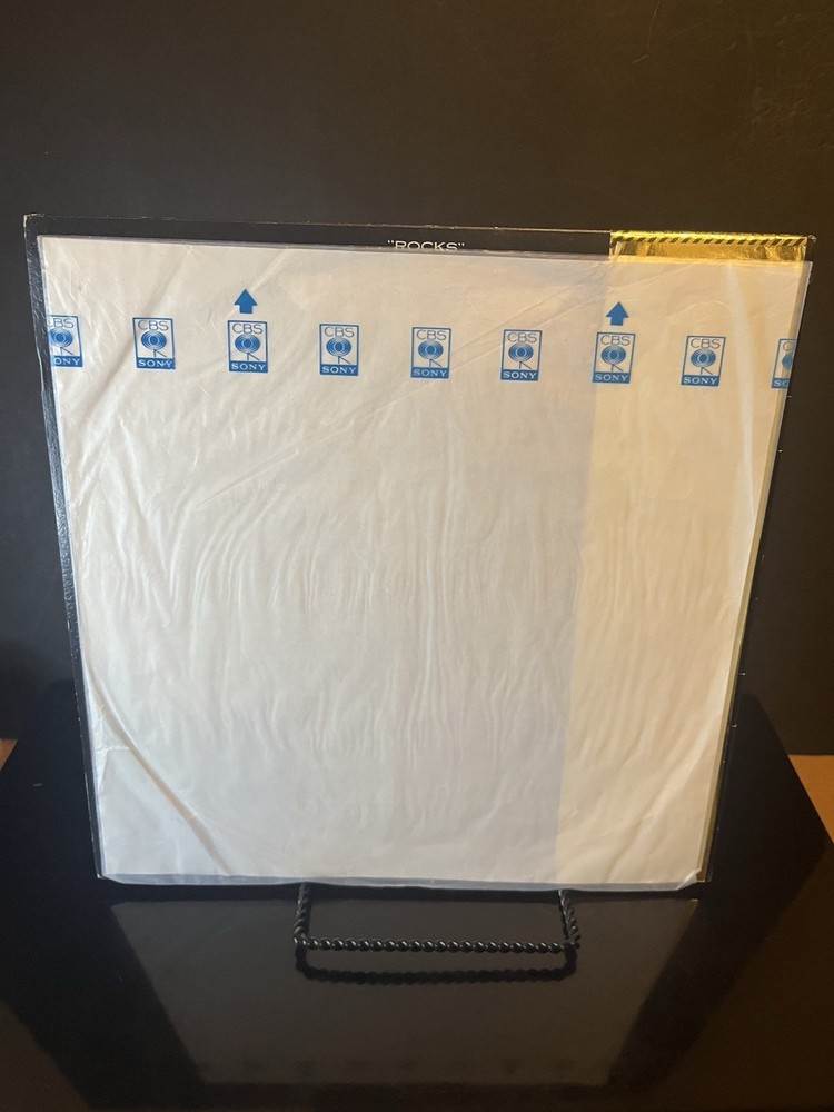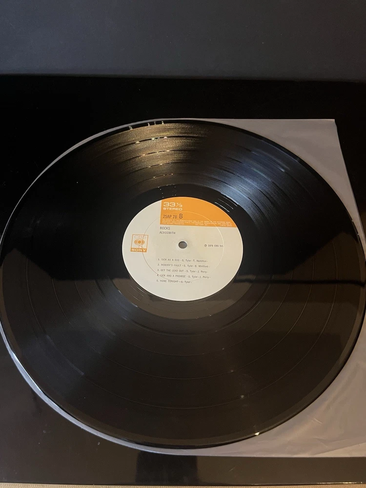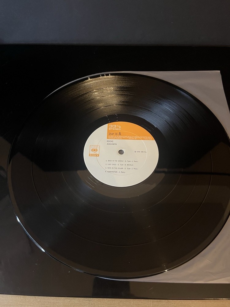 The product is a rare first pressing of Aerosmith's album "Rocks" from 1976, released in Japan with a textured cover and foil OBI strip. This LP features hard rock tracks and is in excellent condition, with a black vinyl record housed in a cardboard sleeve. The catalog number is 25AP-78, and this collectible piece of music history from the 1970s is a must-have for any rock music enthusiast.