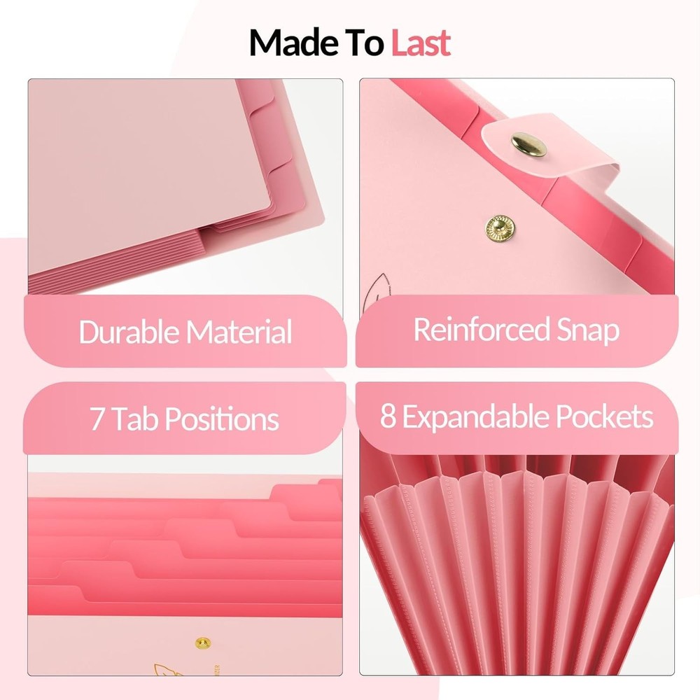 Aesthetic 8 Pocket Accordion File Organizer, Pastels Expanding File Folder for Important Document with Labels, Portable Receipt Bill Paper Organizer for Office School Supplies, Letter Size Pink 2024 New Aesthetic Color: Elegant pattern design and eye-catching colors, this file folder can brighten up your workspace, quickly find your files in drawers or shelves, and greatly improve work efficiency. With a total of 9 pastels colors to choose from, you're sure to find one you love. Keep Organized: No need to worry about grabbing the wrong notes. With 8 large pockets, this expanding file folders make it easy to sort and organzie your bills, tax, reports, notes, records. The included sticker labels allow you to easily identify the topics, make it easy to find files and enhancing productivity! Portable: Designed for easy-access desktop filing and portability. 13 x inches. Suitable for A4/letter size, fits perfectly in your backpack. Lightweight and easy to carry around, keep your important papers handy and tidy, Ideal for meeting, traveling or school. Made to Last: The file organizer is made of high quality material, not easy to break and deform, protect your documents with durable, waterproof and tear-resistant. Upgraded Snap is very secure and keeps everything in place. Large Pocket Design: This accordion folder is designed with a expandable spine for more stretch and can hold more than 250 sheets of paper without being too bulky.