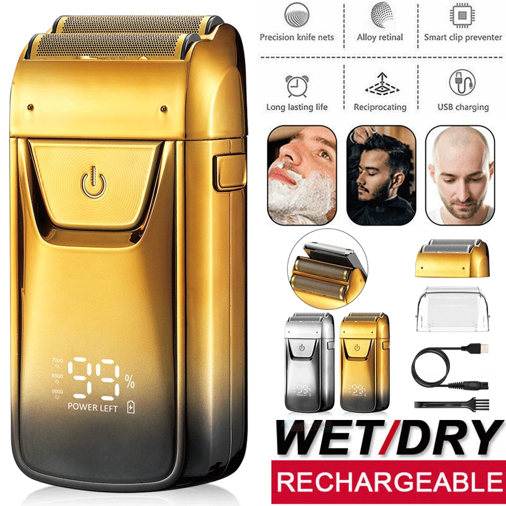 Description ★ Foil shaver: Easily and comfortably trims face, neck and chin. Safe and clean without hurting the skin. ★ Speed: The shaver has 3 speed adjustments. 6 500RPM at most. Give you a quick shave. ★ Pop-up trimmer: Easily and quickly trim longer beards and sideburns for you. Leaves your face refreshed and cleansed. ★ LED: The LED display clearly shows the remaining percentage of the battery. Reminds you to recharge your hair shaver. ★ Battery power: The shaver has a built-in 1 4 00mAh battery, which can be used for up to 1 2 0 minutes after charging for 2 hours. Product Details : Material: ABS Color: Gold /Sliver Power: 5 w Charging Time: 2 Hours Use Time: 120 Minutes Battery: Lithium Battery 14 00mAh Size: Approx. 12x6x3.8cm / 4.7*2.3*1.5inch What You Get : 1 * Men's Shaver 1 * Spare Shaving Head 1 * USB Charging Cable 1 * Clean Brush 1 * Protective C over 1 * Instruction manual