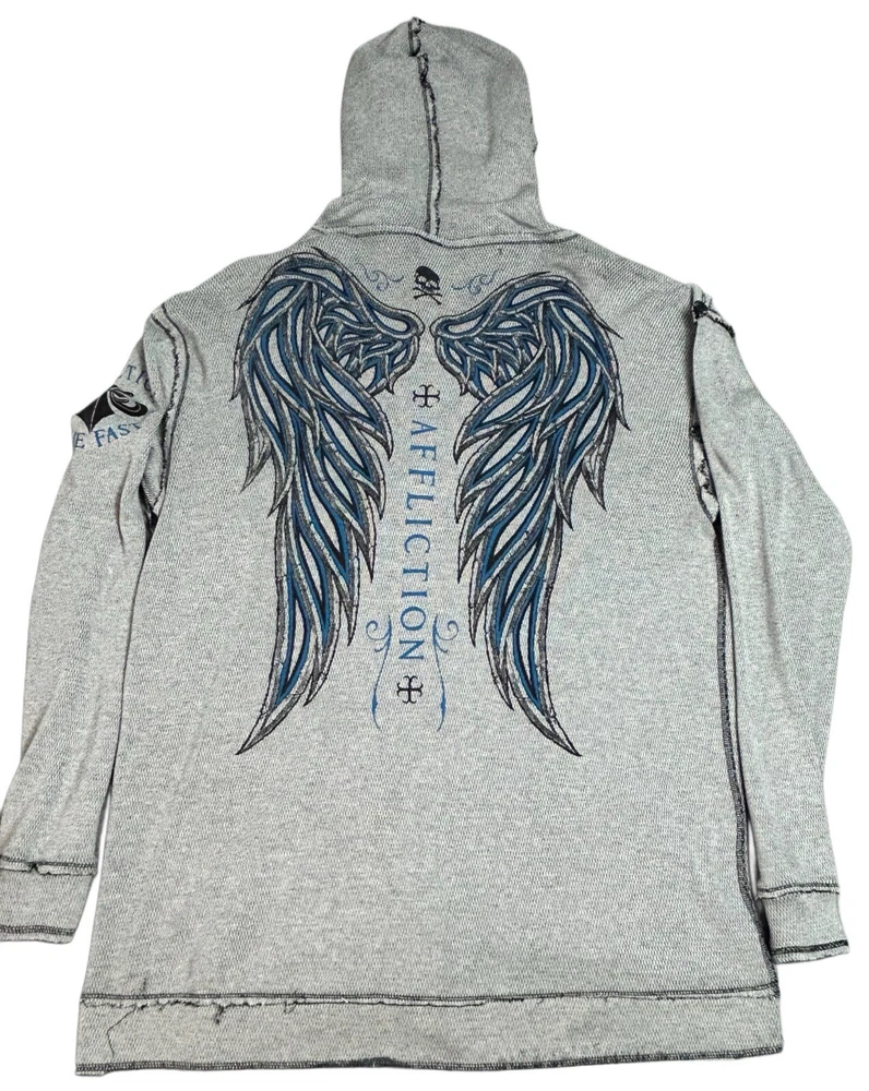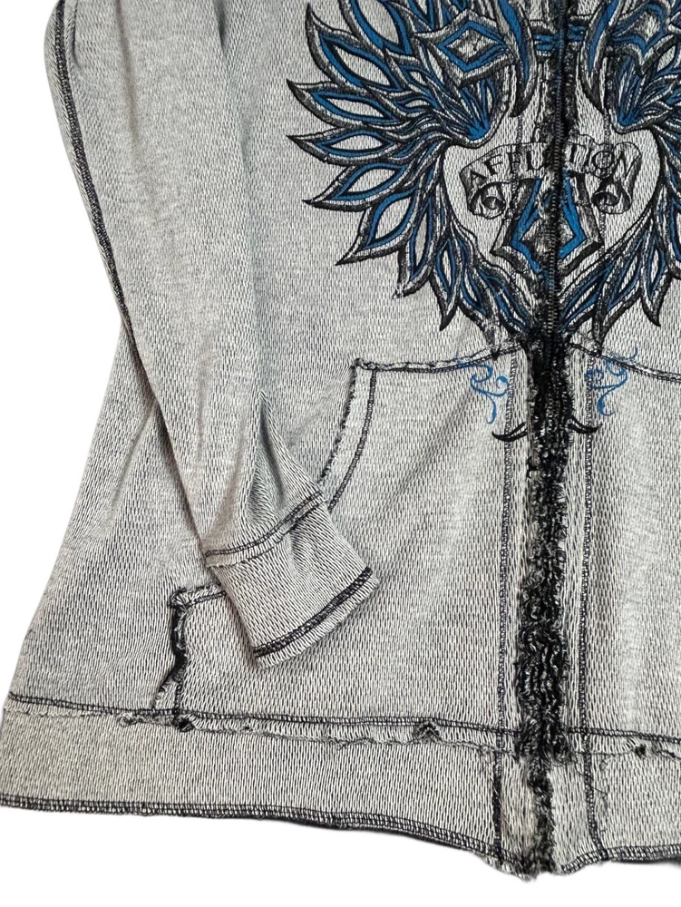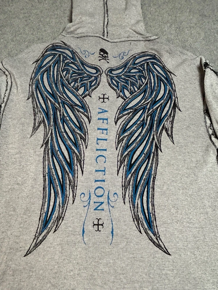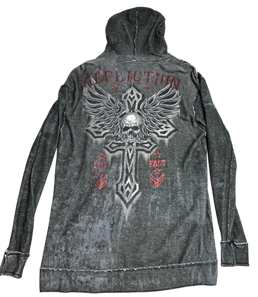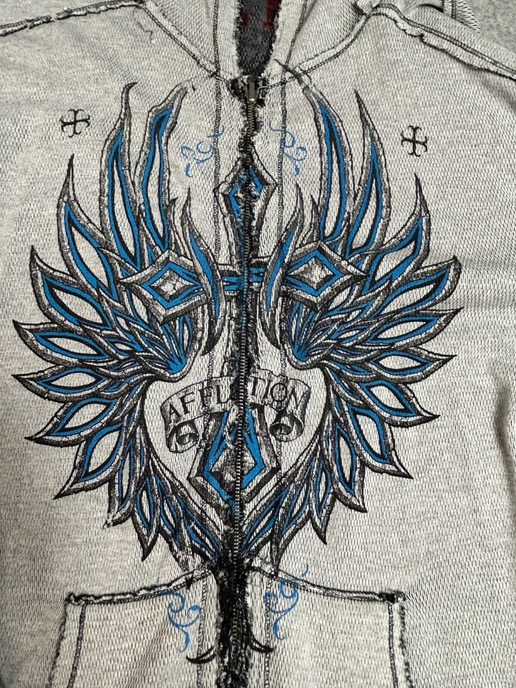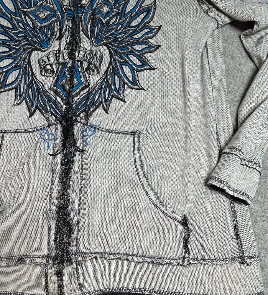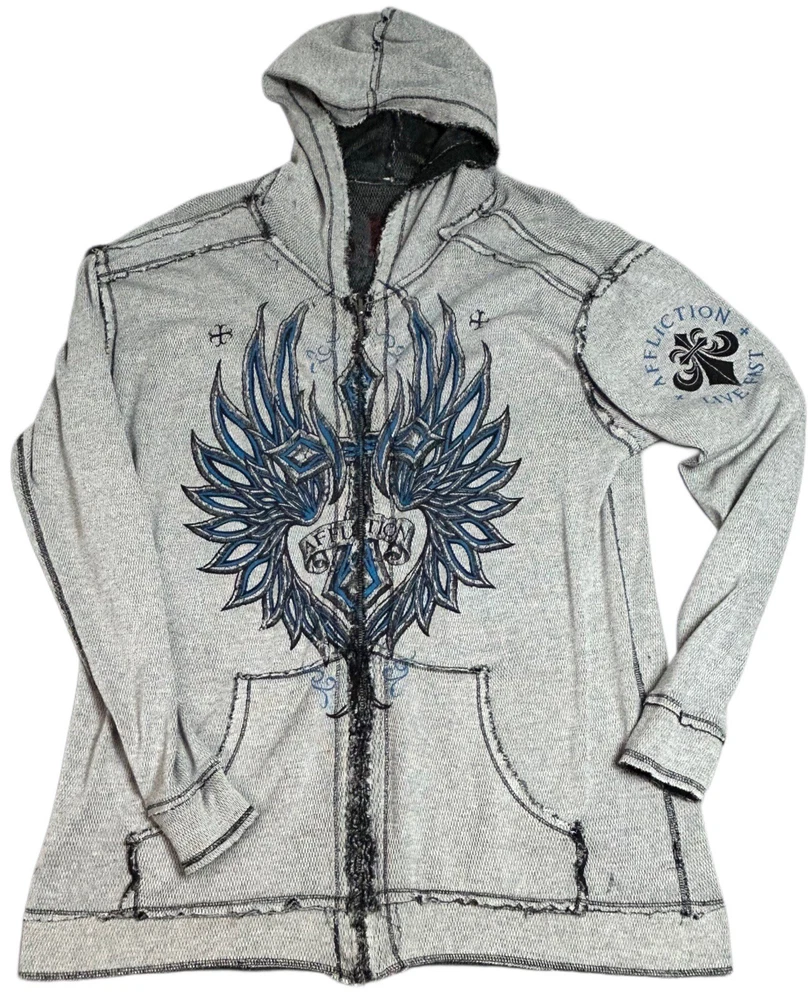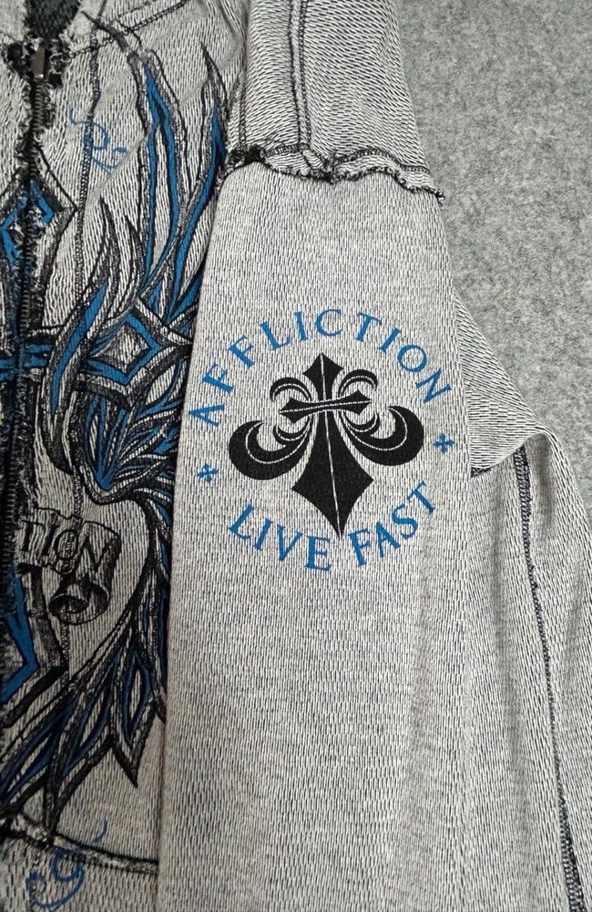 Pre-owned Smoke-free home On GREAT condition - no flaws Affliction welcomes the Awakening reversible zip hoodie in a grey "Lava" color with blue foil accents on one side and a black "Lava" wash" color scheme on the other. Delivering an edgy vibe, this sweatshirt has distressed detailing with contrast stitching and a fixed hood cultivating a grunge undertone. The screen-printed imagery on one side depicts loud intricate designs on the front back and sleeves. The reversible artwork shows a skull reading "Affliction 73' outlaw motors" with a large cohesive back graphic reading "Live fast" in a cream colorway for a 2000s look. This hoodie is finished with dual hand pockets on both sides, a full zip closure, and ribbed finishes on the cuffs and bottom hemline.