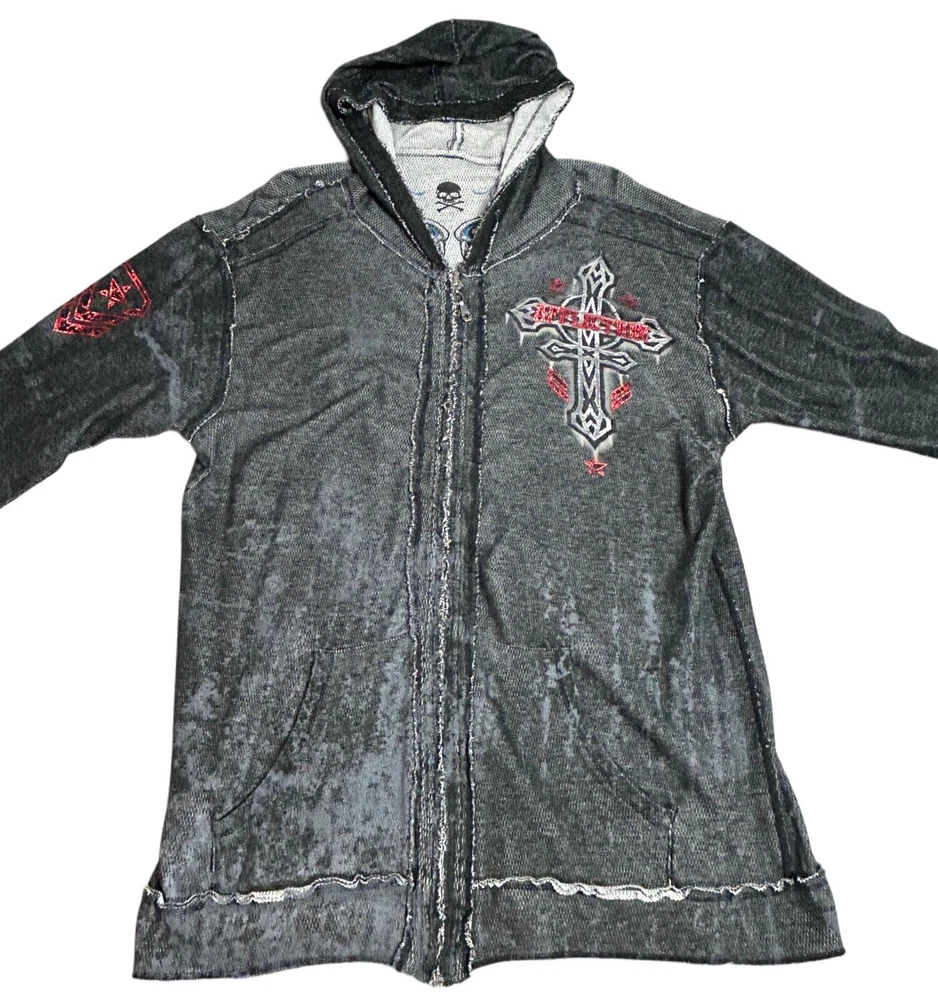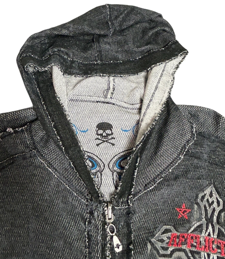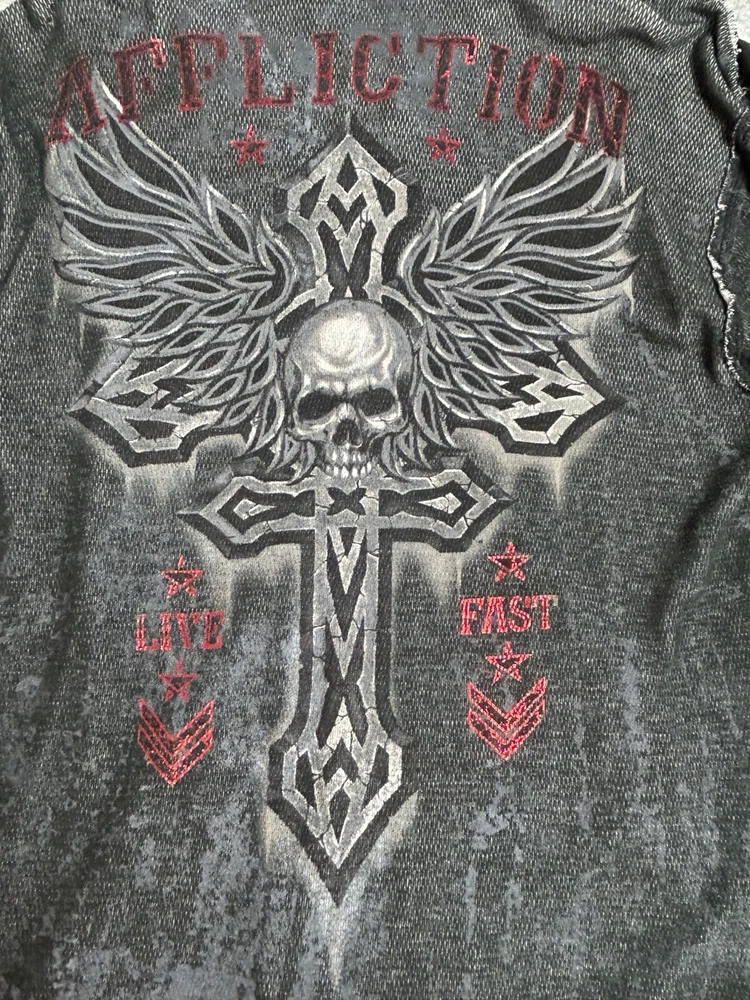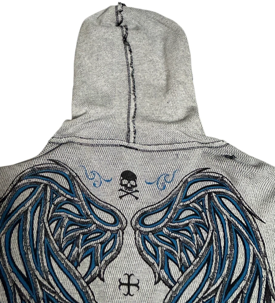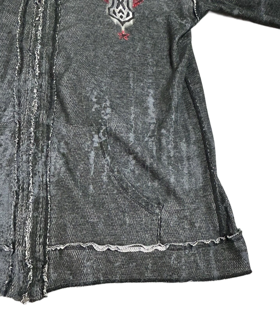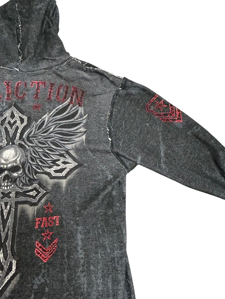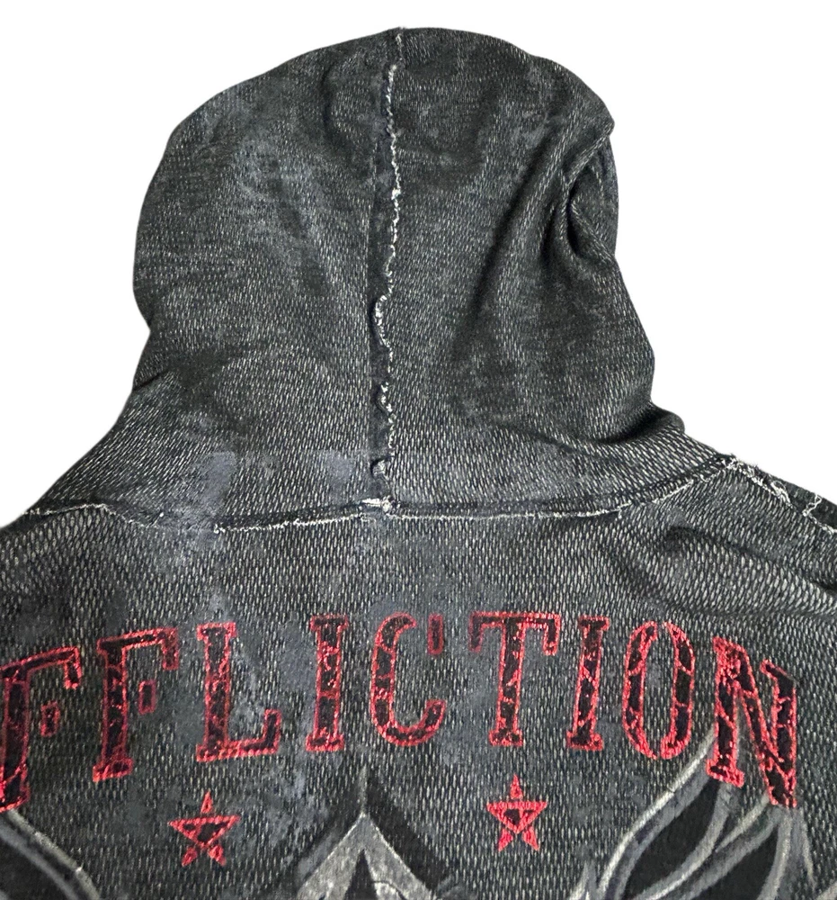 Pre-owned Smoke-free home On GREAT condition - no flaws Affliction welcomes the Awakening reversible zip hoodie in a grey "Lava" color with blue foil accents on one side and a black "Lava" wash" color scheme on the other. Delivering an edgy vibe, this sweatshirt has distressed detailing with contrast stitching and a fixed hood cultivating a grunge undertone. The screen-printed imagery on one side depicts loud intricate designs on the front back and sleeves. The reversible artwork shows a skull reading "Affliction 73' outlaw motors" with a large cohesive back graphic reading "Live fast" in a cream colorway for a 2000s look. This hoodie is finished with dual hand pockets on both sides, a full zip closure, and ribbed finishes on the cuffs and bottom hemline.