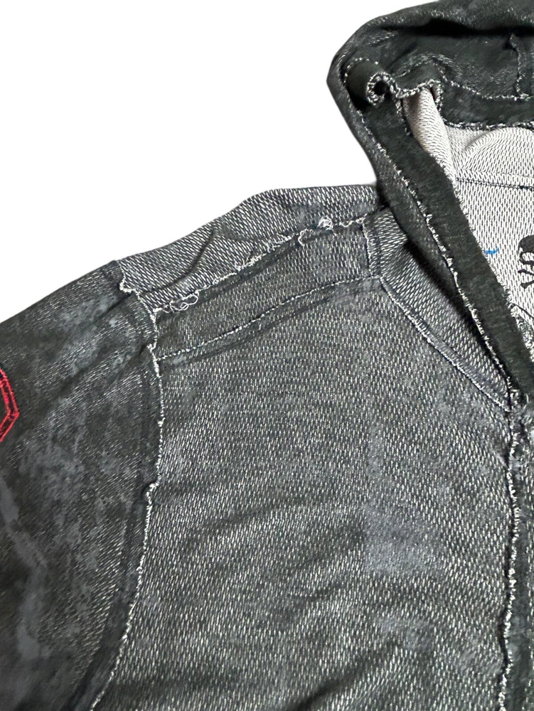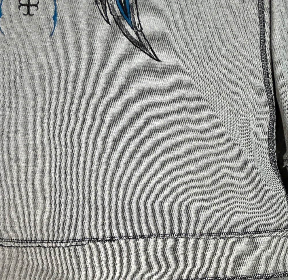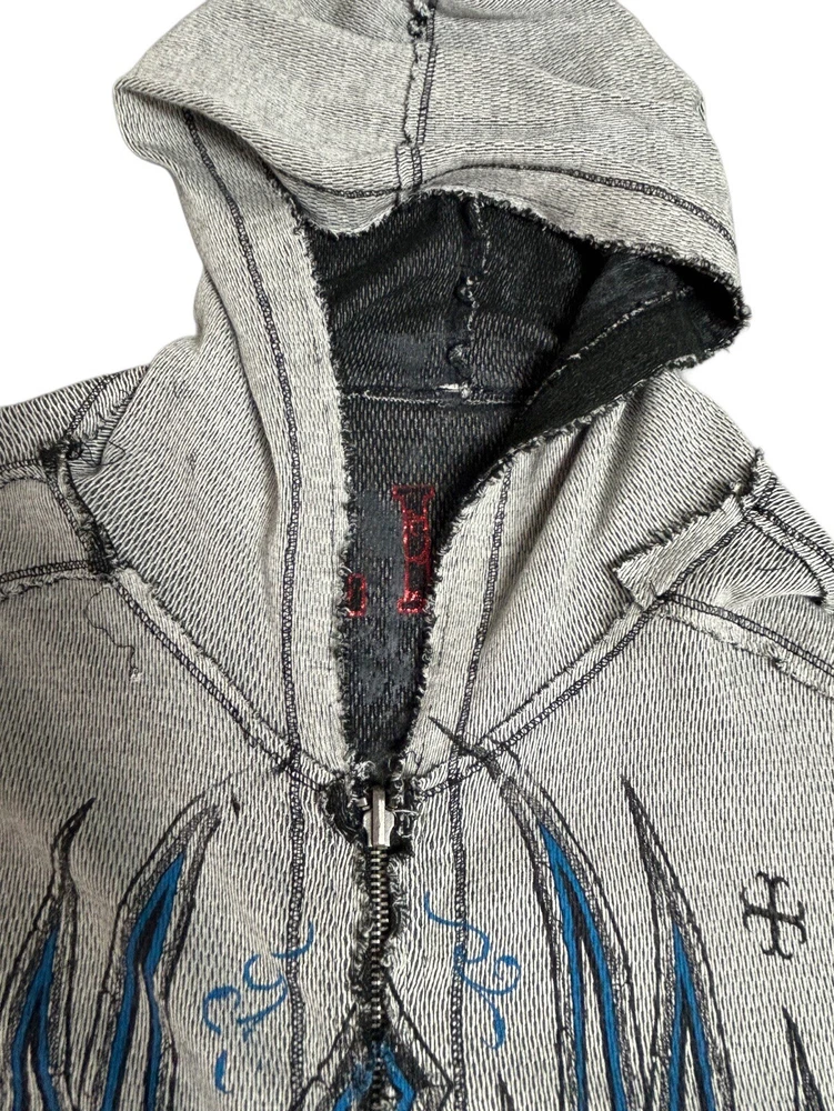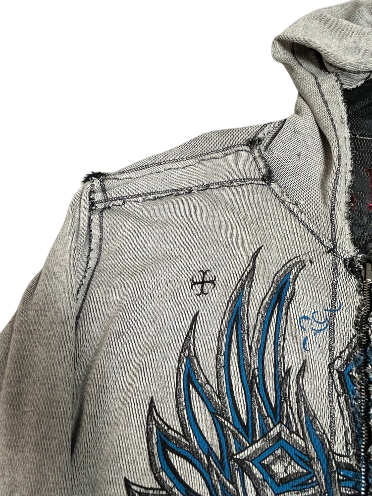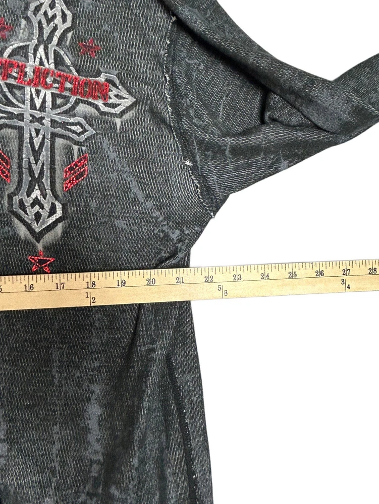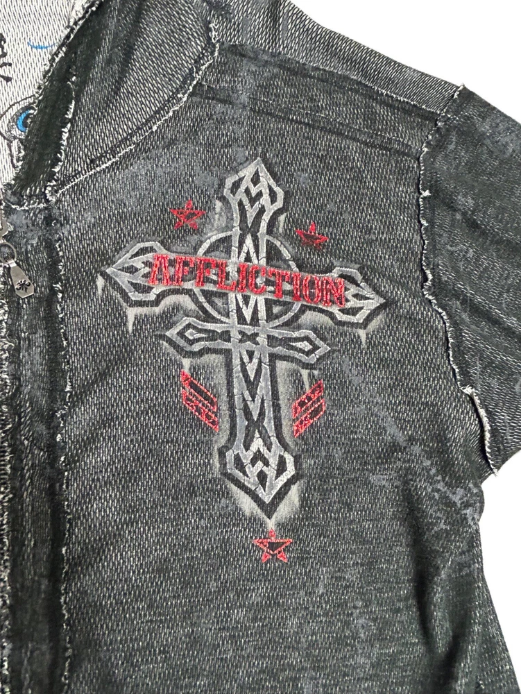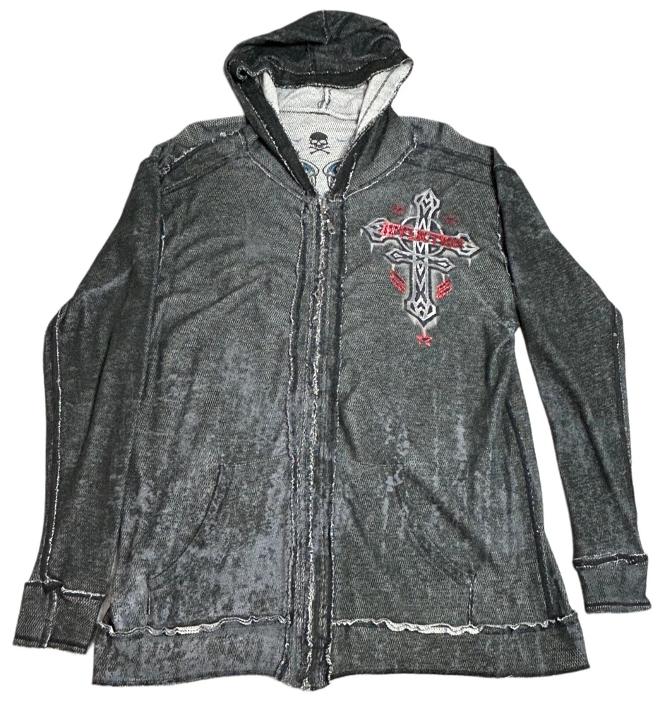 Pre-owned Smoke-free home On GREAT condition - no flaws Affliction welcomes the Awakening reversible zip hoodie in a grey "Lava" color with blue foil accents on one side and a black "Lava" wash" color scheme on the other. Delivering an edgy vibe, this sweatshirt has distressed detailing with contrast stitching and a fixed hood cultivating a grunge undertone. The screen-printed imagery on one side depicts loud intricate designs on the front back and sleeves. The reversible artwork shows a skull reading "Affliction 73' outlaw motors" with a large cohesive back graphic reading "Live fast" in a cream colorway for a 2000s look. This hoodie is finished with dual hand pockets on both sides, a full zip closure, and ribbed finishes on the cuffs and bottom hemline.