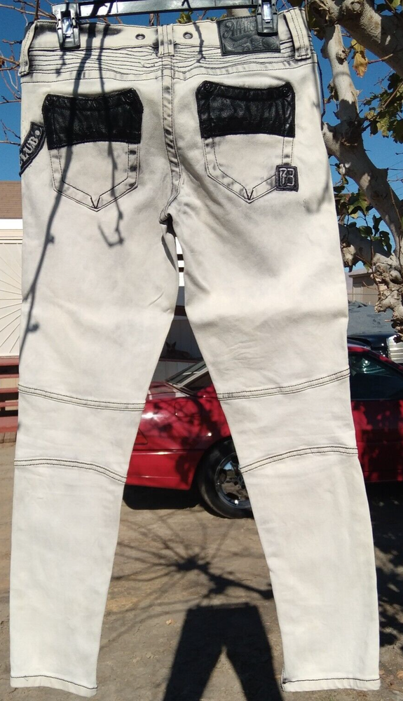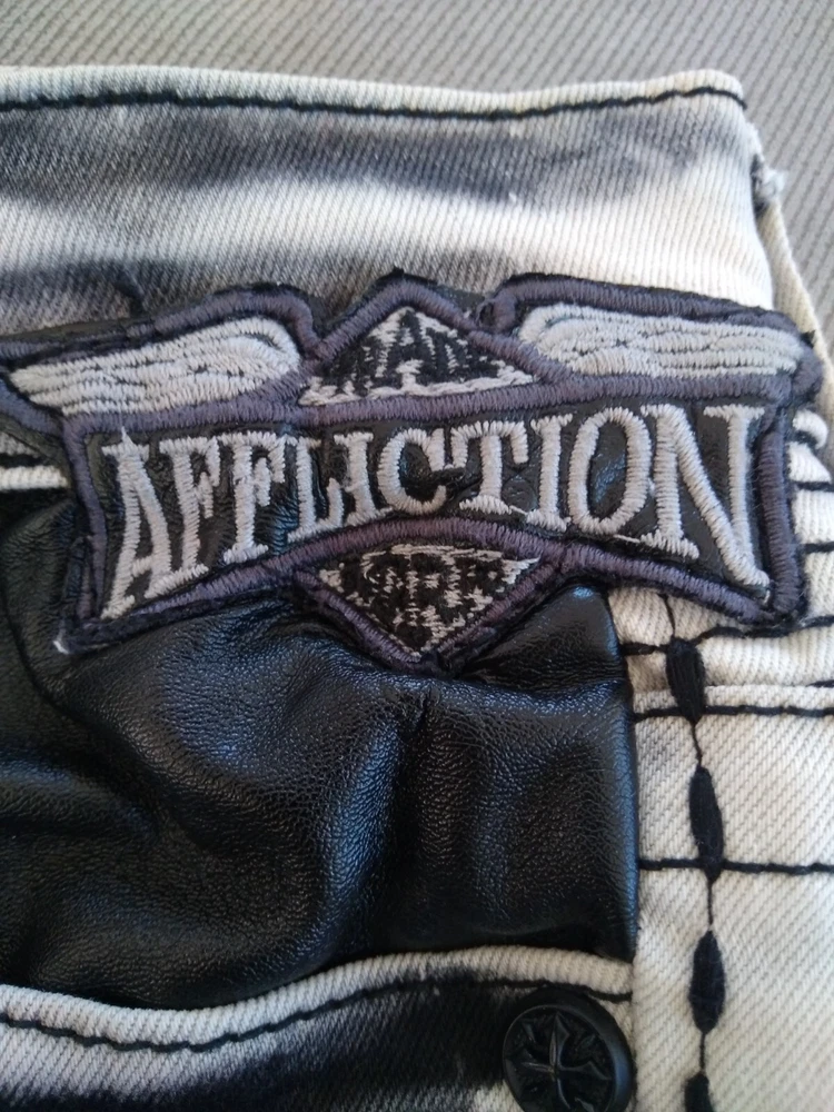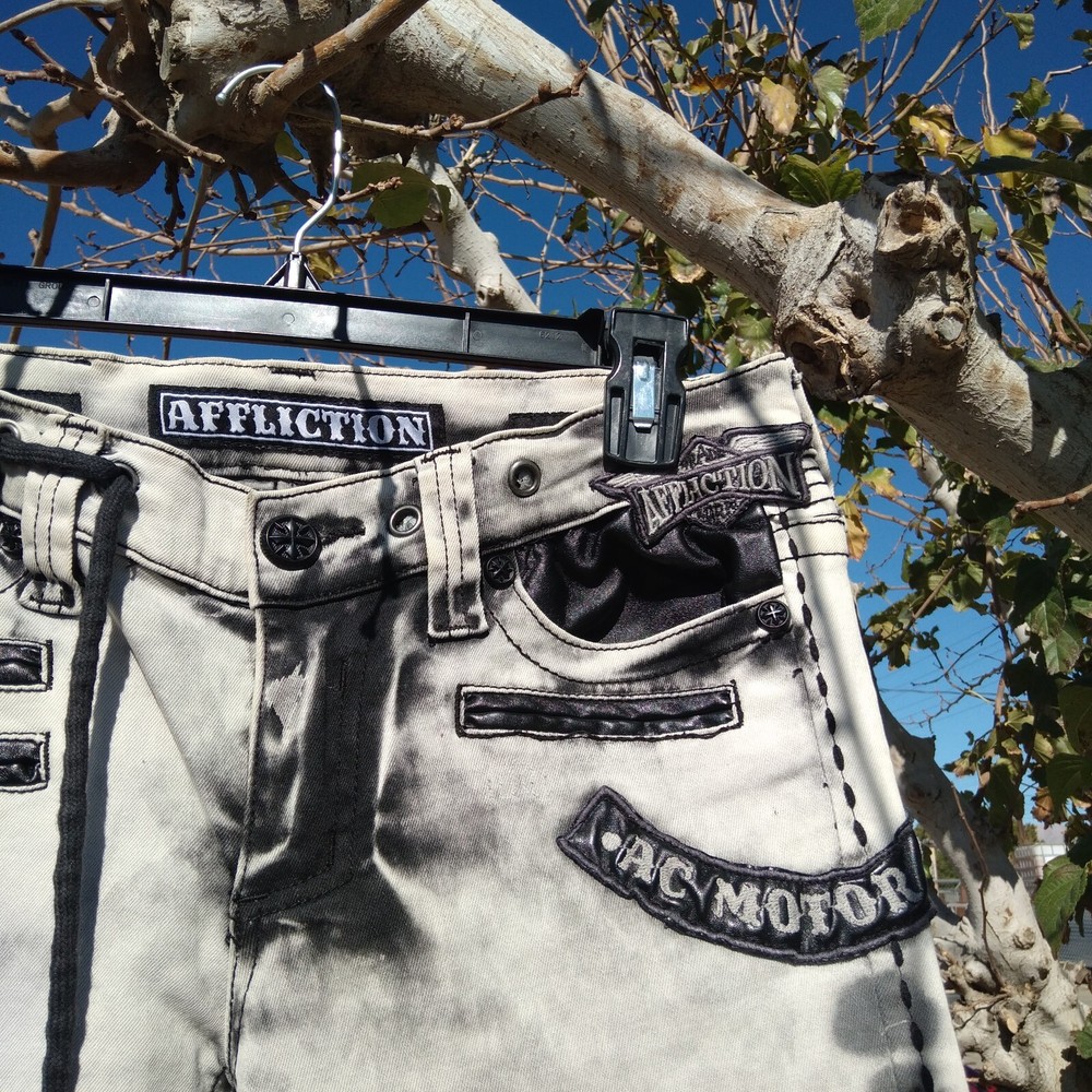 Elevate your denim collection with these stylish Affliction skinny jeans, tailored to flatter with a comfortable low-rise fit and a snug 26-inch inseam. The light fabric wash and distressed details lend a casually chic edge, perfect for pairing with your favorite tees and sneakers. With a blend of cotton and spandex, these jeans promise both comfort and durability.The jeans feature a classic gray hue, accented with an embroidered Affliction logo, stud details, and a unique zipper design that adds a touch of edgy flair to the biker-inspired theme. A secure button and zip closure ensure a perfect fit, while machine washability makes for easy care. These jeans are a versatile addition to any wardrobe, suitable for fall, spring, and summer seasons.