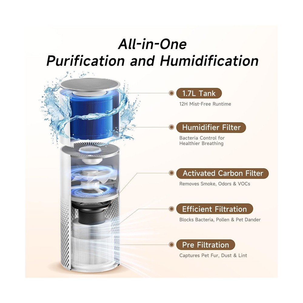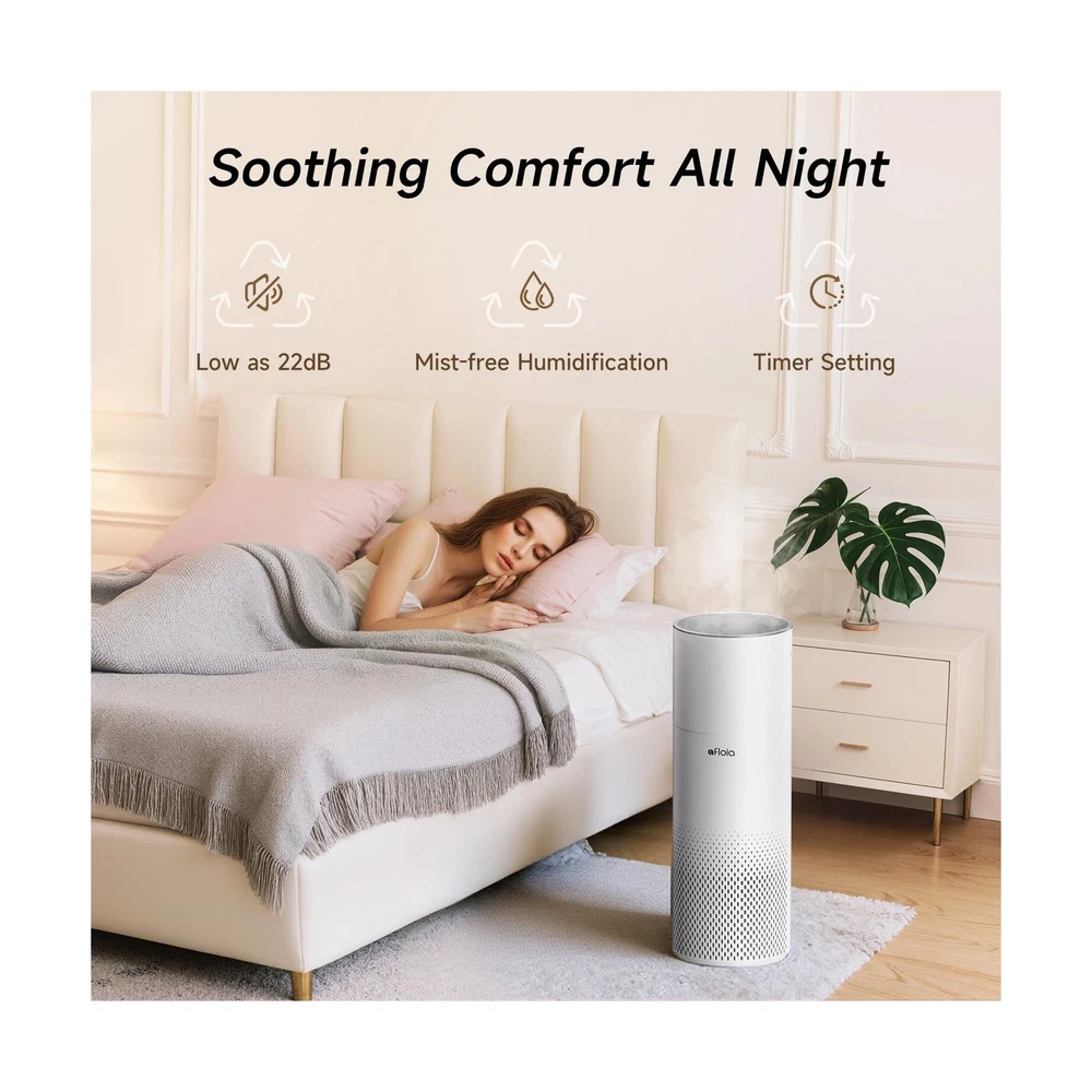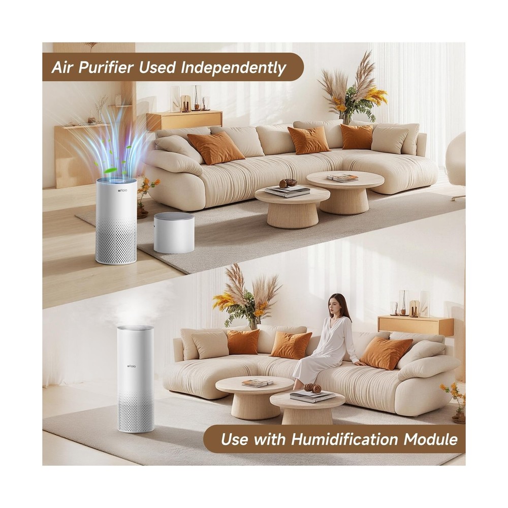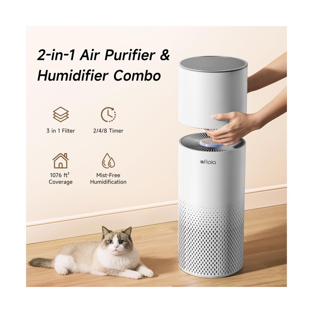 Afloia Humidifier and Air Purifier in One, Air Purifier and Evaporative Humidifier Combo for Home, 24dB Quiet Air Cleaner Remove Pets Dust Dander Hair Allergy Pollen Smoke Smell for Room Description Features: 2-in-1 Air Purifier & Humidifier: Kilo Pro - Simultaneously purifies and humidifies air. Covers up to 1076 ft2 per hour, perfect for bedrooms, living rooms, and offices (Note: Humidifier function cannot be used separately) 3-Stage Filter: Improves overall air quality and helps relieve coughing, sneezing, and allergy symptoms Mist-Free Humidification with Evaporative Technology: Uses natural cold evaporation and a humidifier filter to release clean, evenly dispersed moisture. No water puddles, no white dust 7-Color Ambient Light: Customize the atmosphere with 7 soothing light colorsideal for any room. Light automatically softens in Sleep Mode, create a calming environment for rest 3 Fan Speeds & 8-Hour Timer: Choose from three fan speeds to control purification and humidity levels based on your room's needs. Set the auto shut-off timer for up to 8 hours for worry-free use day or night Remote Control: Easily turn the device on/off, adjust fan speeds, lights, and timer settingsall from across the room. No need to get up from your bed or sofa Top-Fill Water Design: Refill with ease by removing the top mesh lid and pouring water directly insideno need to remove or flip over a bulky tank Whats in the Box:Air Purifier 1, Humidifier Module 1, 3-Stage Filter 1, Humidifier Filter 1, Power Adapter 1, Remote Control 1, User Manual 1, 1-Year Warranty for Peace of Mind Product Details: Color: White Brand: Afloia Product Dimensions: 7.6"D x 7.6"W x 21.8"H Floor Area: 46 Square Inches Specification Met: CE Certified, EPA Certified, FCC Certified Product Dimensions : 7.6 x 7.6 x 21.8 inches; 7 Pounds Item model number : Kilopro Date First Available : May 19, 2025 Manufacturer : Afloia Best Sellers Rank: #144,716 in Home & Kitchen (See Top 100 in Home & Kitchen) #300 in Home Air Purifiers #300 in Home Air Purifiers Customer Reviews: 4.7 4.7 out of 5 stars 39 ratings Delivery We Do Not Ship Outside of the Continental US. Return Policy All items qualify for returns within 30 days of receipt. Feedback We take our reputation seriously, we buy and sell online, so we understand the value of trust. If you are unsatisfied with your order, please contact us and we will work with you to resolve it to your satisfaction.