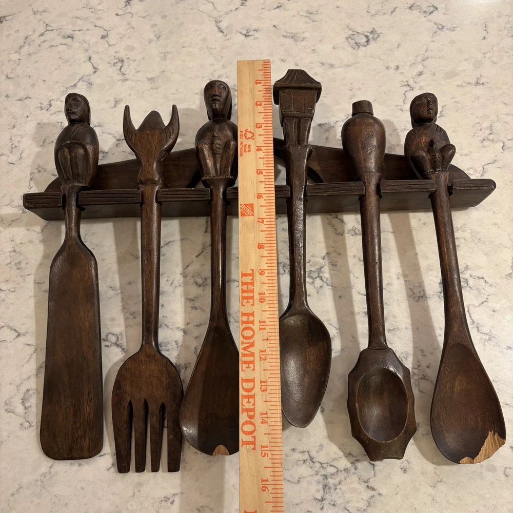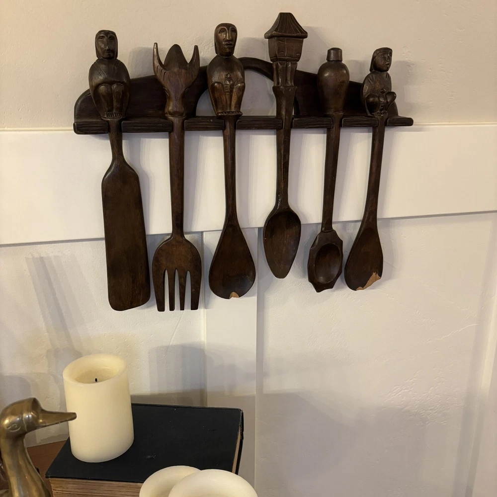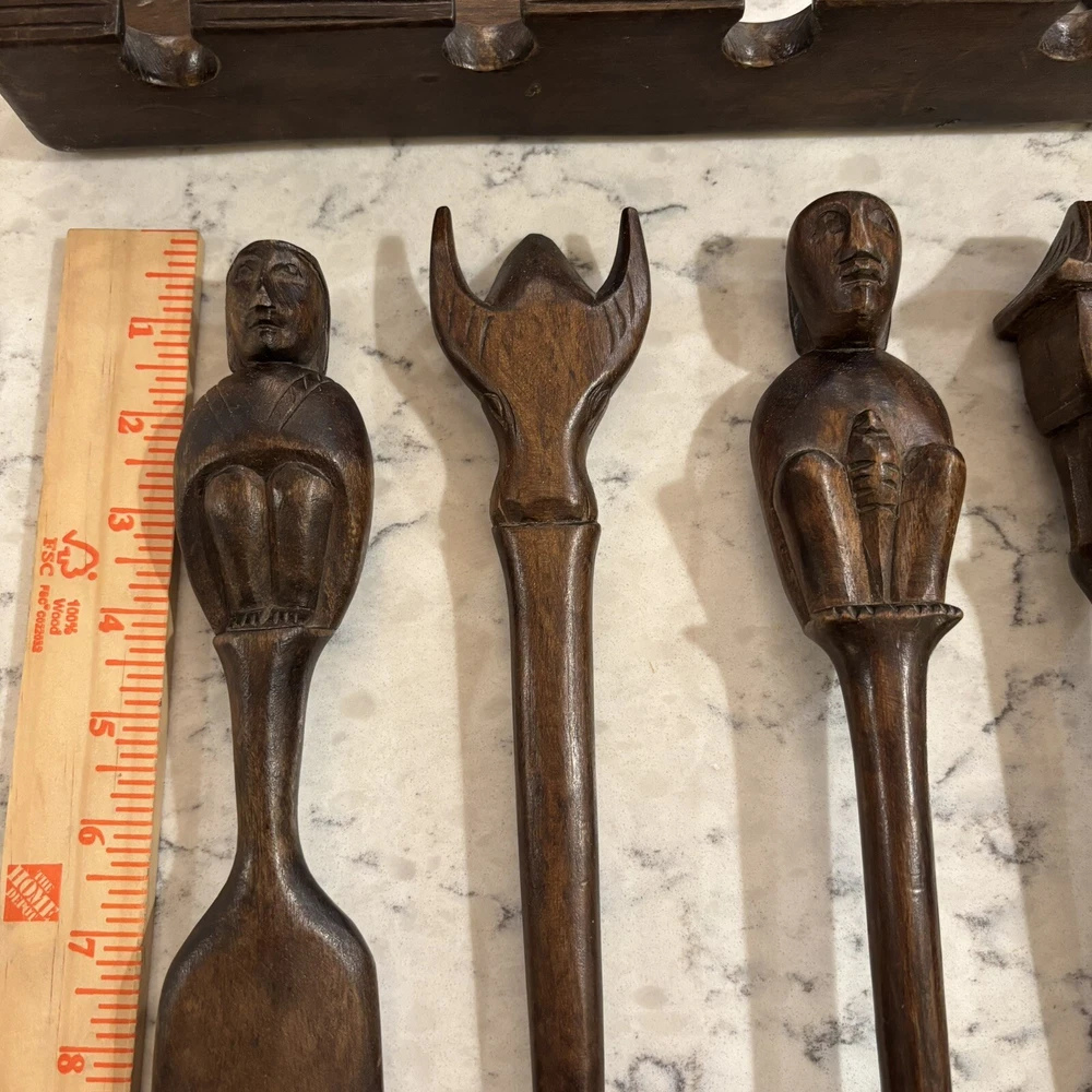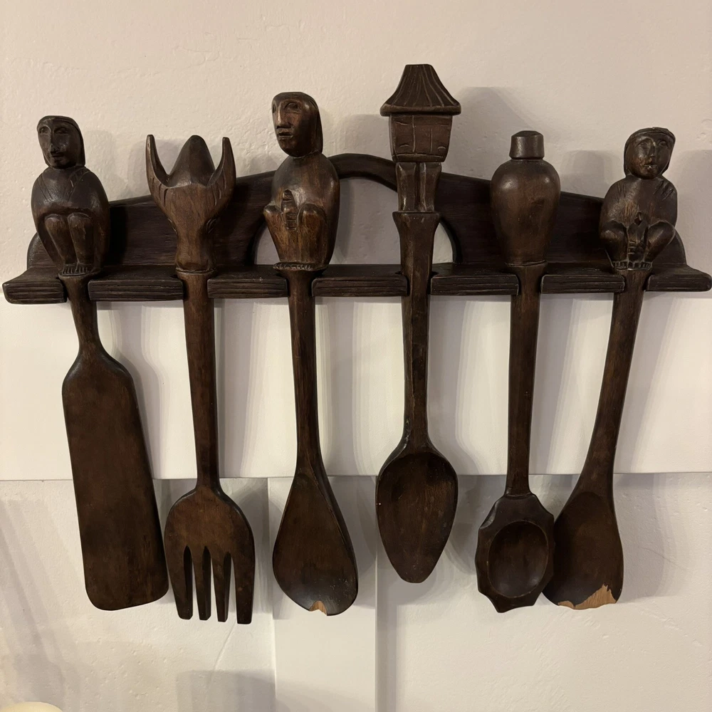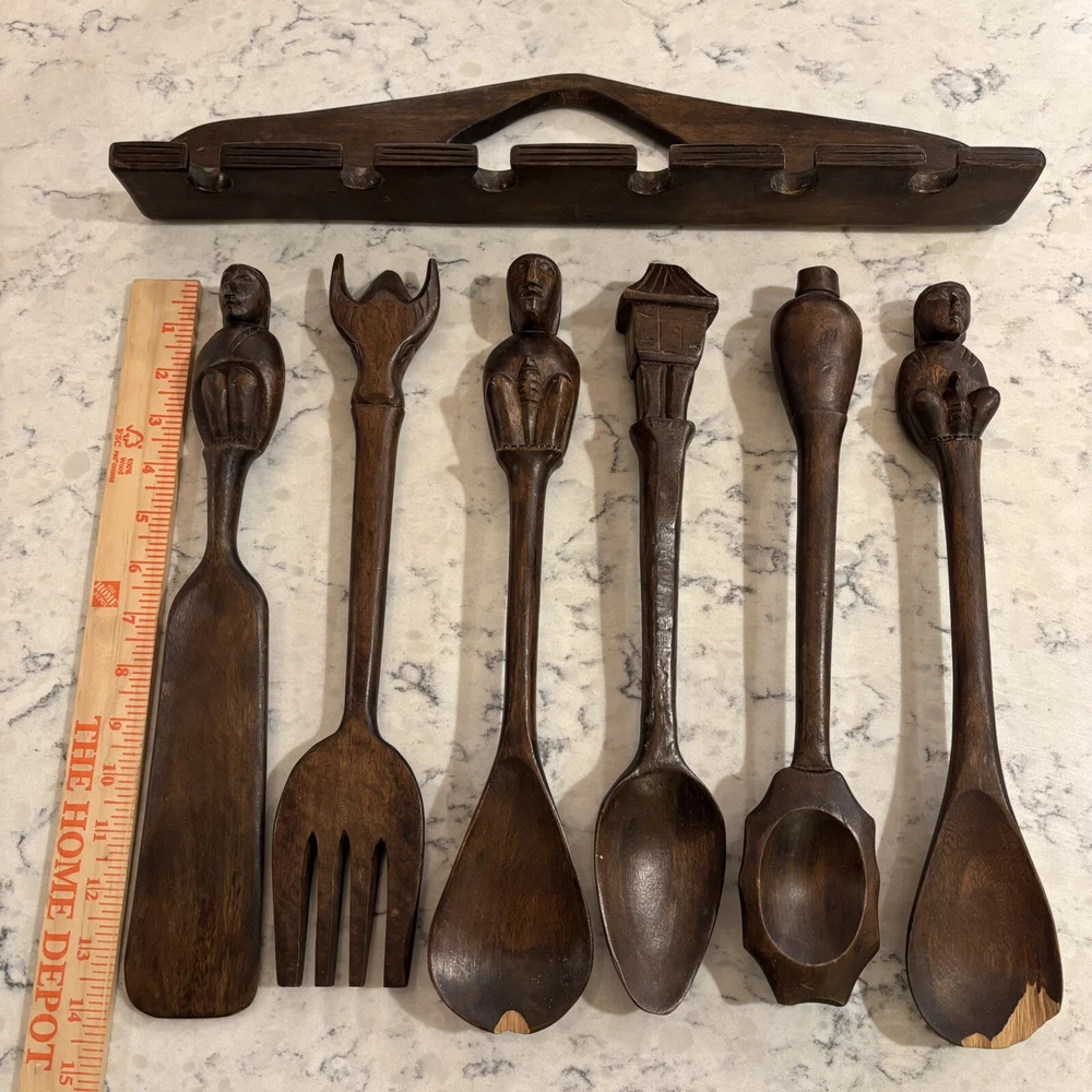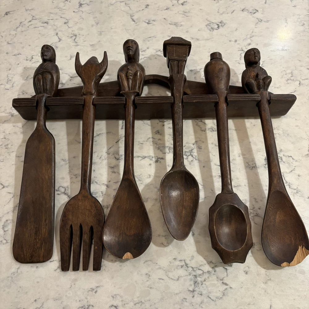 set of 6 vintage carved utensils with hanger. There is some damage on two of the utensils so please look at photos carefully