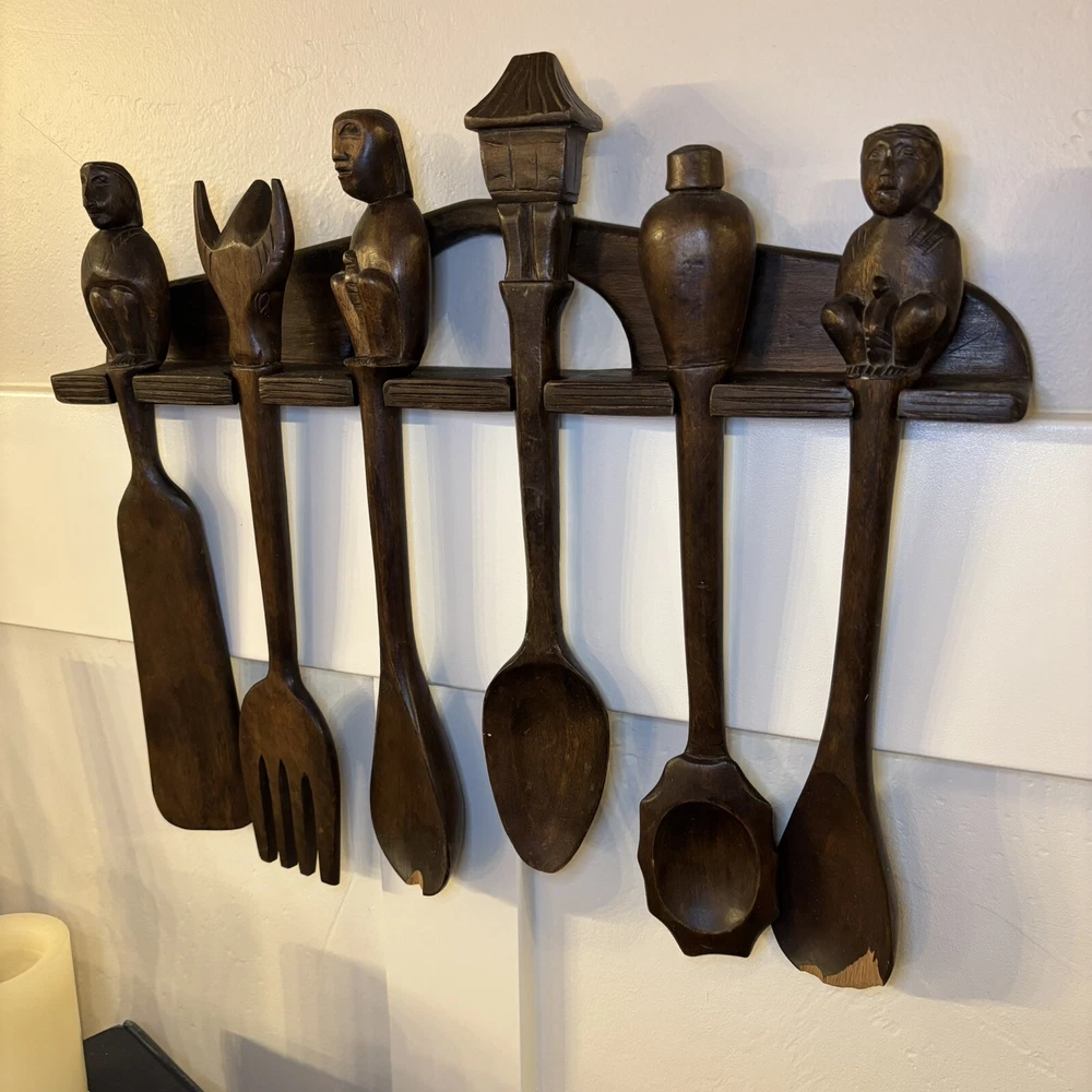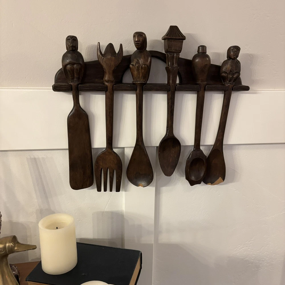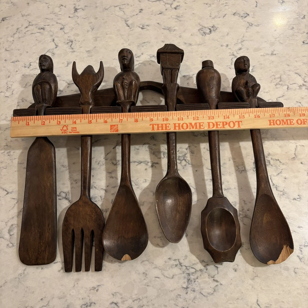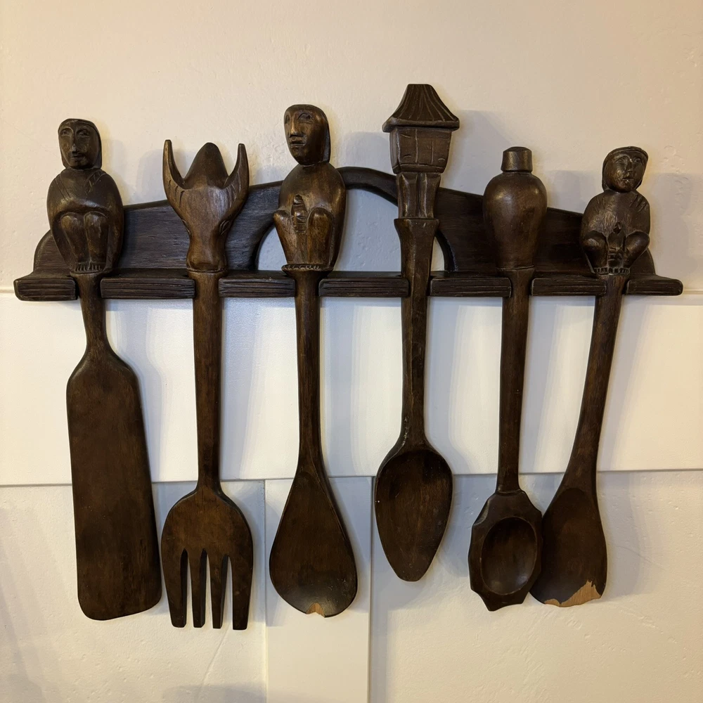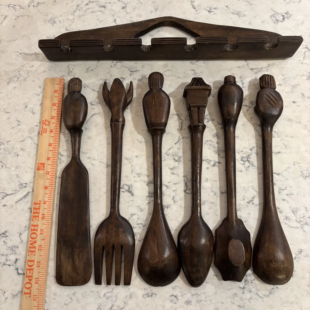 set of 6 vintage carved utensils with hanger. There is some damage on two of the utensils so please look at photos carefully