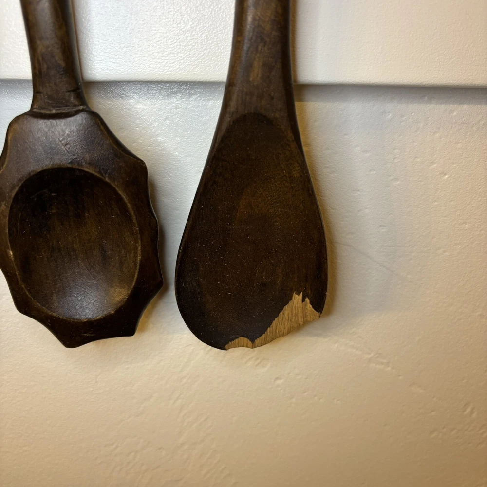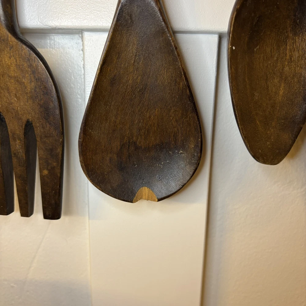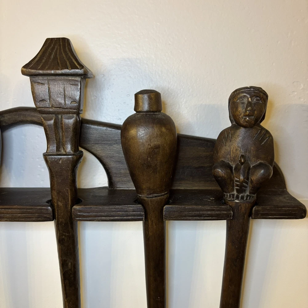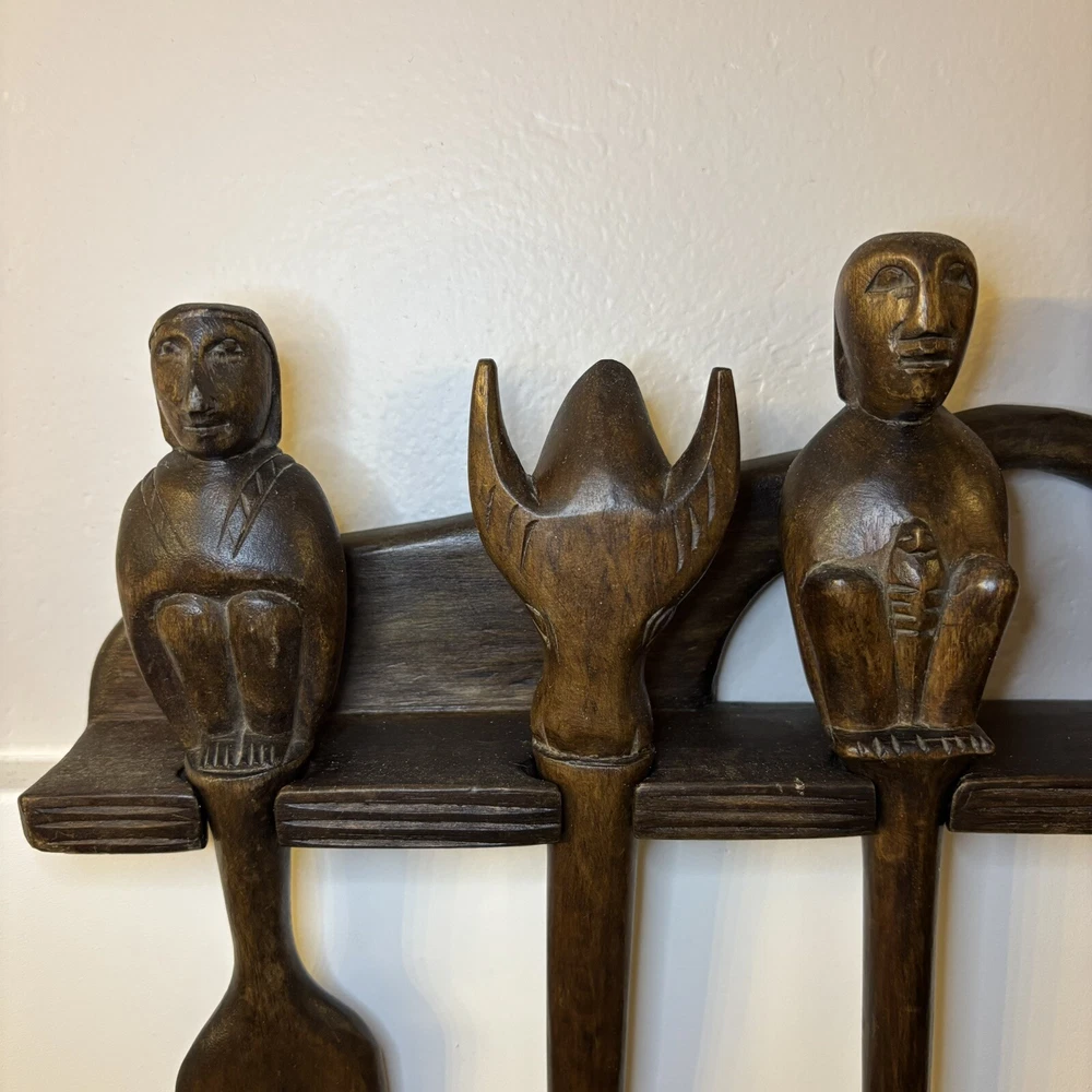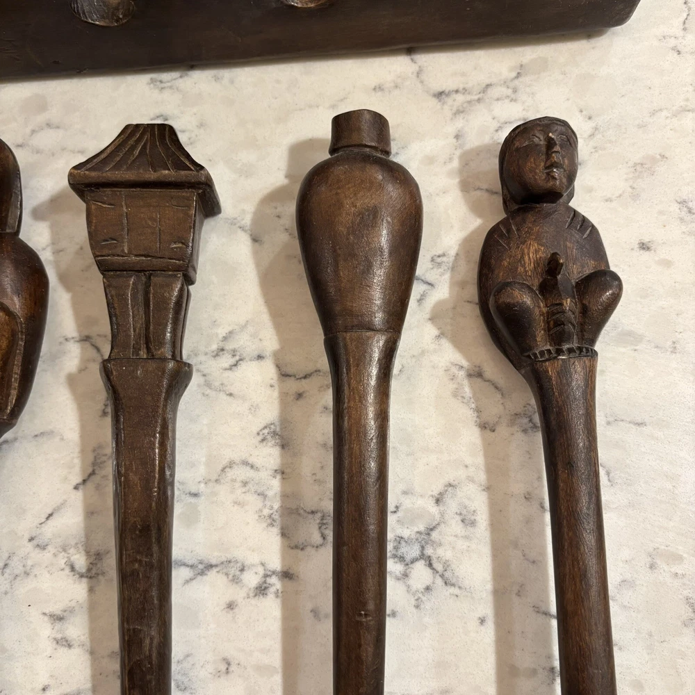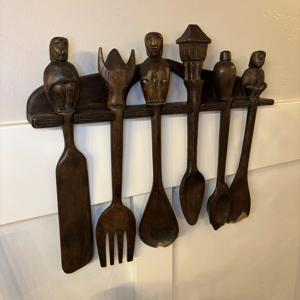 set of 6 vintage carved utensils with hanger. There is some damage on two of the utensils so please look at photos carefully