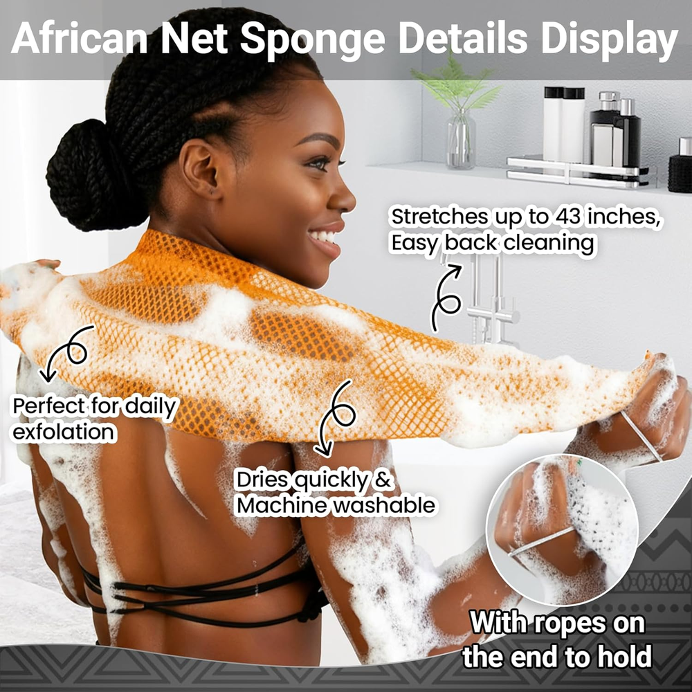Store New Arrivals Add to Favorite View Feedback Contact African Net Sponge Authentic 2 Pieces Gentle Exfoliating Body Scrubber Bath Sponges for All Skin Types, African Exfoliating Net Sponge with Handles Washcloth Loofah Bathing Accessories for Shower Description Item model number africannetsponge05 Package Dimensions 10.04 x 7.48 x 0.67 inches; 8.15 ounces Deeper Cleansing, Softer Texture: Our authentic African net sponges feature an upgraded diamond-shaped net design, woven and hand-cut by artisans. Each African net sponge is hand-cut by artisans. Slight size variations are normal. This increases the elasticity and softness of the nets while reducing the roughness of the knot areas. These resilient nets produce a richer lather and a softer feel, providing effective and gentle exfoliation. It is suitable for all skin types, even sensitive skin. Extra-long Reach, Good Resilience: The average length of the african exfoliating net sponge is 43 inches (it will be longer when stretched) and is flexible enough to reach every part of the body without losing its shape. The rope design at both ends of the african net stretches to easily scrub legs, and the hard-to-reach back, or use as bath sponge balls for focused scrubbing. Quick-Drying & Reusable: After bath sponges for shower, rinse them thoroughly and hang them to dry. The mesh design provides rapid drainage and drying, making it dry faster than traditional loofahs and towels. With proper care, it could be used for a long time. Easy to Use: This African exfoliating net is designed for effortless use. Only wet the sponge, then apply your favorite soap or body wash to create a rich lather. It gently removes dead skin, transforming your shower into a home spa experience that relieves stress and fatigue. With regular use, your skin will become smoother and more refined, radiating a natural glow. Vibrant Color Design & Gift Packaging: We offer a variety of color sets to suit the needs of you, your family, or your friends. Regardless of age or gender, our exfoliating body scrubber are suitable for everyone. The exquisite gift box packaging is exclusively designed by RTINROU, making it the perfect choice for both personal use and gifting! Product description ABOUT US We offer the best prices around on high quality products. Our E-store includes media such as books, movies, music and games while offering electronics, toys, sporting apparel, clothing, tools, general home, garden items and more. SHIPPING We are always working hard to ensure your package arrives as soon as possible. Please understand that some factors like weather, high postal traffic, and the performance of shipping companies are outside of our control. We offer free shipping to the lower 48 states and ship within 2 business days of payment, usually sooner. We do not accept P.O. Boxes. Please provide a physical address. For shipping outside of the continental USA, we only use eBay's Global Shipping Program.The item is shipped to KY and then sent to the rest of the world. International customers are responsible for all duties and taxes. Continue to check out in order to calculate costs for shipping the item to your country. Messages regarding eBay's Global Shipping Program MUST be directed at eBay EXCLUSIVELY. RETURNS We offer a 30-Day Return Policy on items which you are not completely satisfied with. You have the option for a full-refund or an exchange of the item. No returns are available on items shipped outside of the USA. PAYMENT We accept PayPal. CONTACT US This page content is yet to come Please ad us to your favorite seller and visit again later Thank You CUSTOMER SATISFACTION We try our very best to make sure every customer is completely satisfied. If there's a problem, message us! We're happy to help. WE ACCEPT Copyright © 2021 AutoDS. | All Rights Reserved