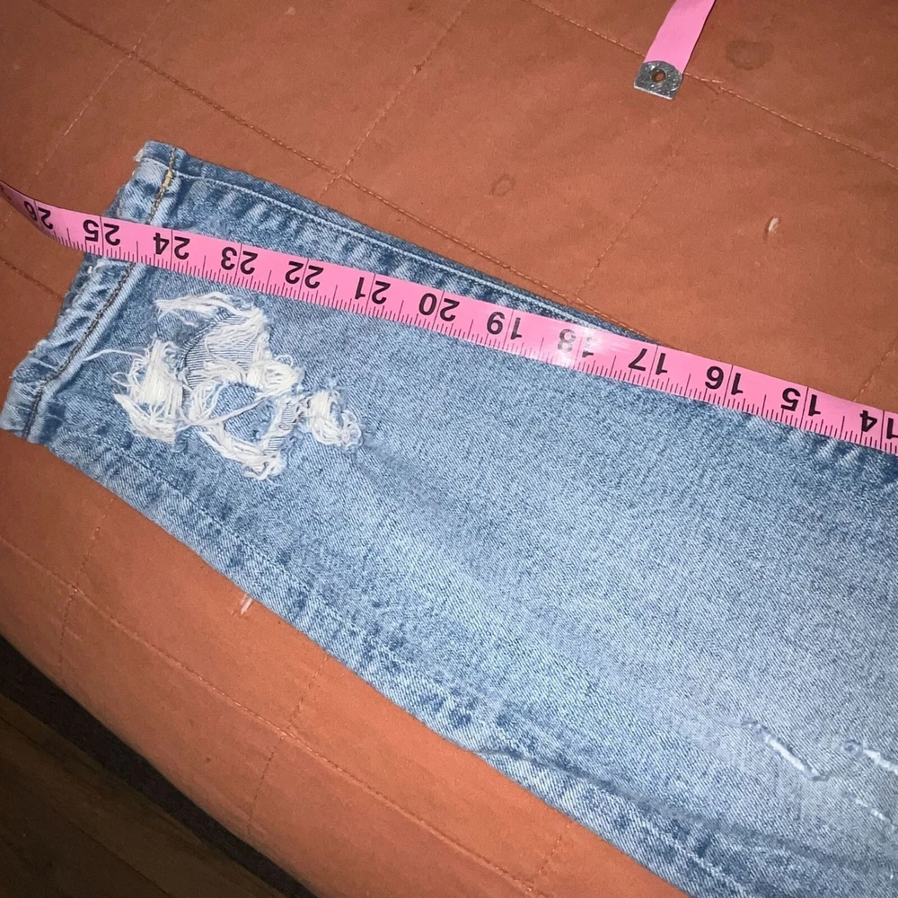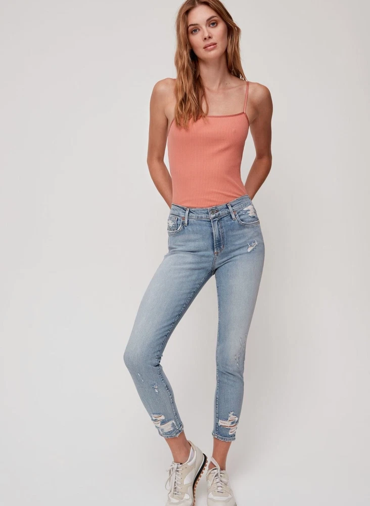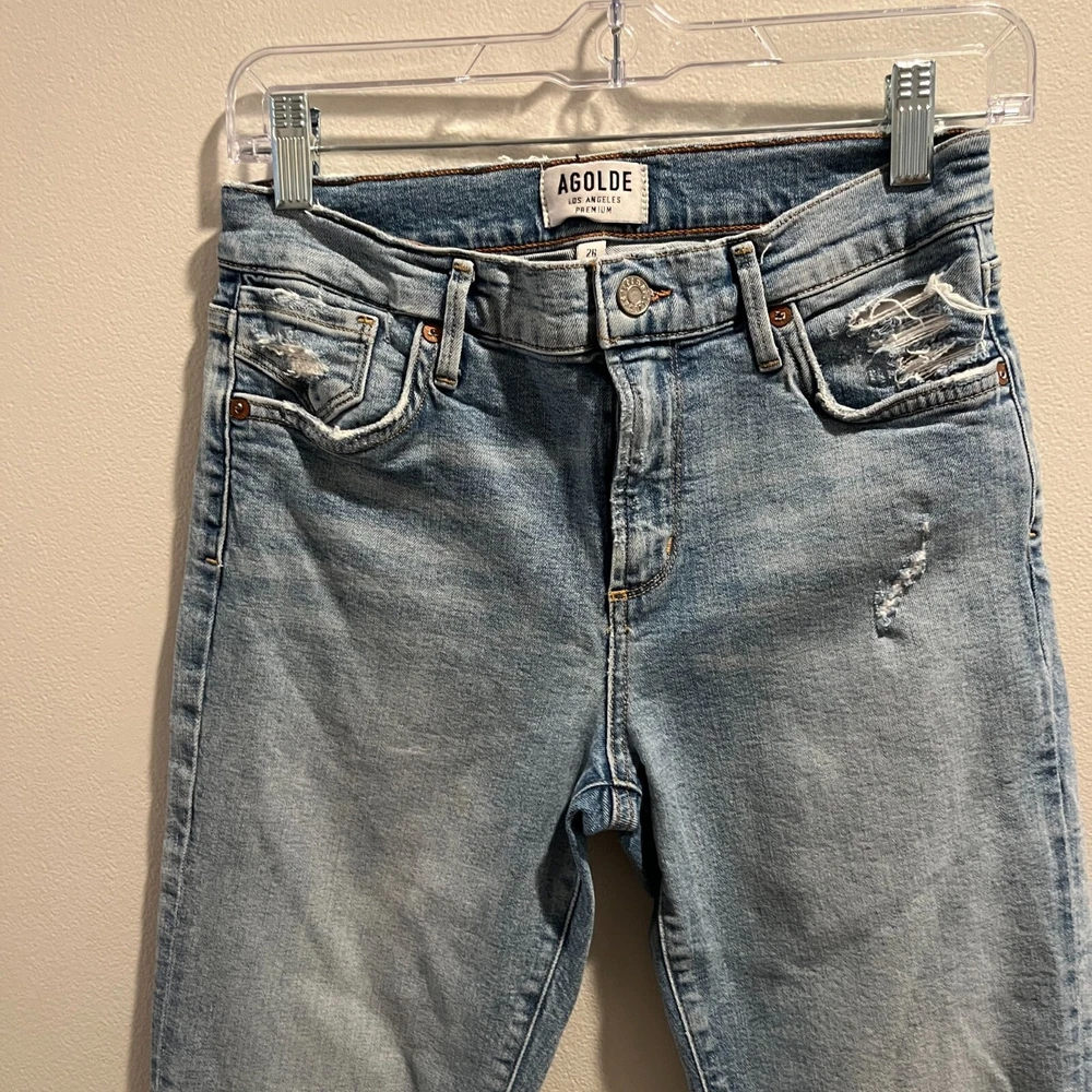 These Agolde Los angeles the Sophie crop high waisted ripped jeans in size 26 are tailored for a modern fit. Crafted with high-quality denim, these jeans feature a distressed design, adding a touch of rugged style to your wardrobe. • Front and back pockets • Button and zip closure • Ankle-length cut • Light wash finish Size 26 Great Preowned conditions