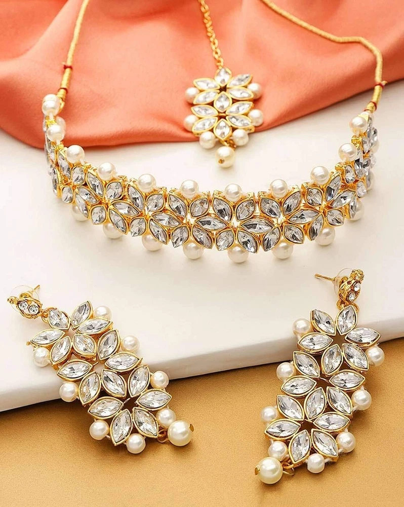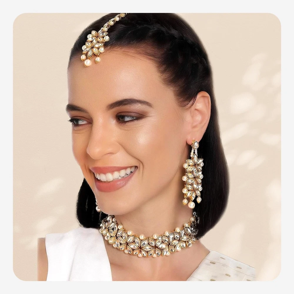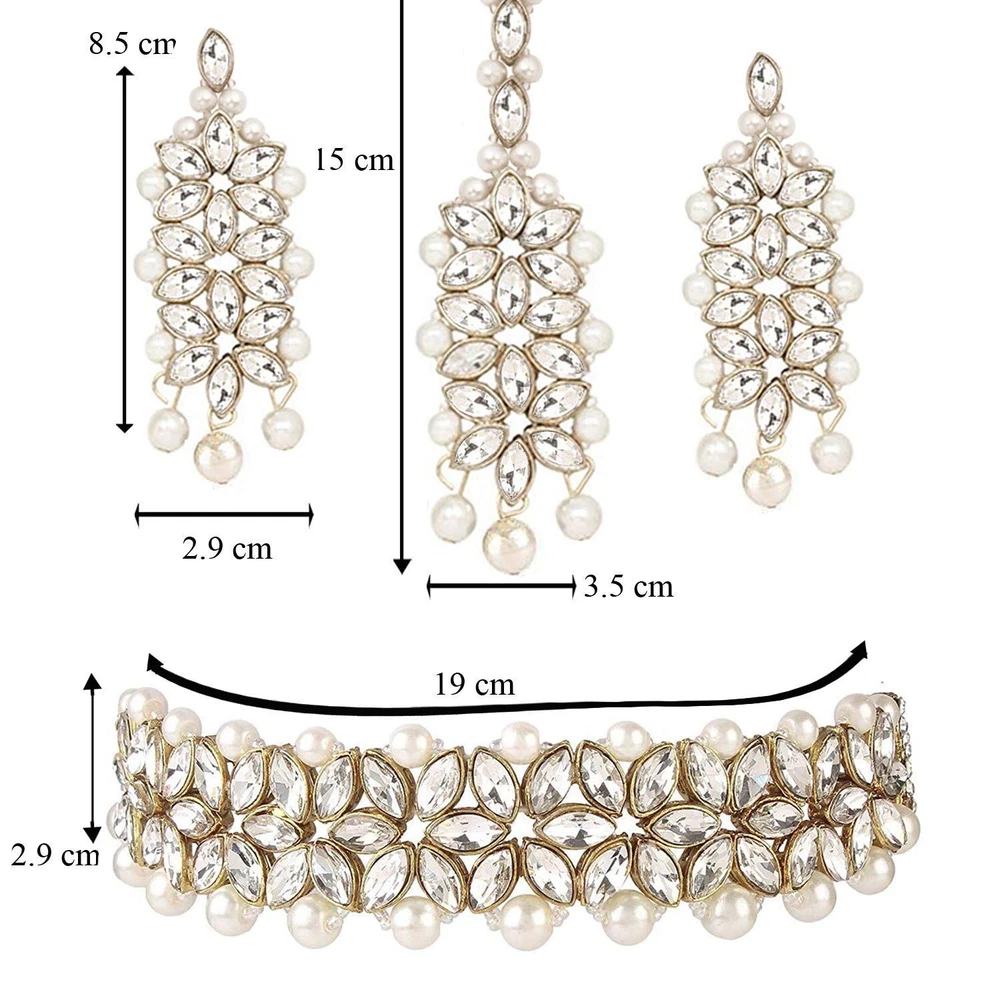 Aheli Gold Plated Kundan Jewelry Necklace with Earring Set Gift for Women Product Details Color: White Brand: Aheli MPN: AH-PF25BRC105W UPC: Does not apply EAN: Does not apply Department : womens Date First Available : October 22, 2020 Brand, Seller, or Collection Name: Aheli Metal stamp: Not stamped Metal: No Metal Type Material: Zinc Gem Type: No Gemstone Item Length: 7.87 inches Clasp: Lobster Clasp Ring size: adjustable Model number: AH-PF25BRC105W